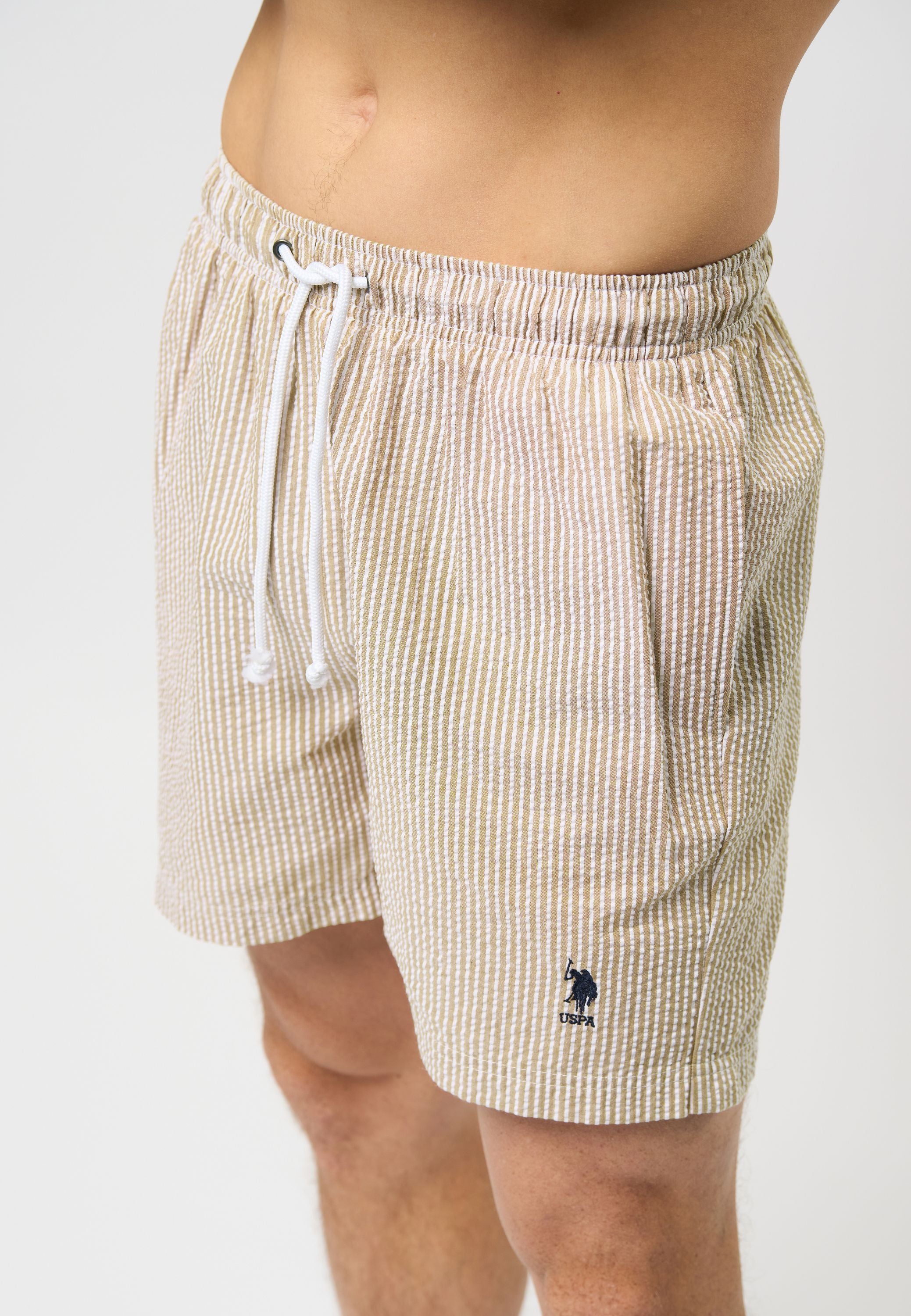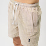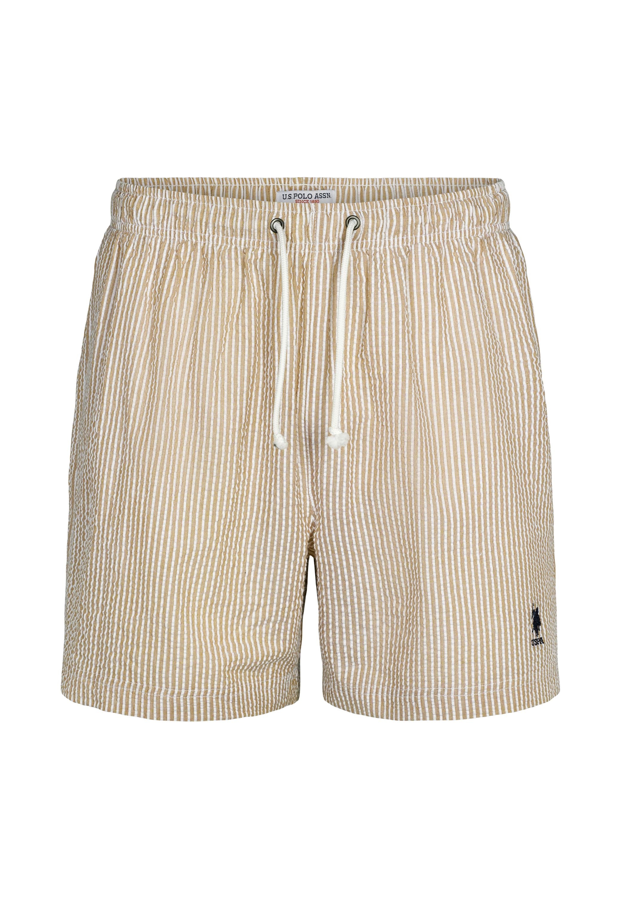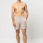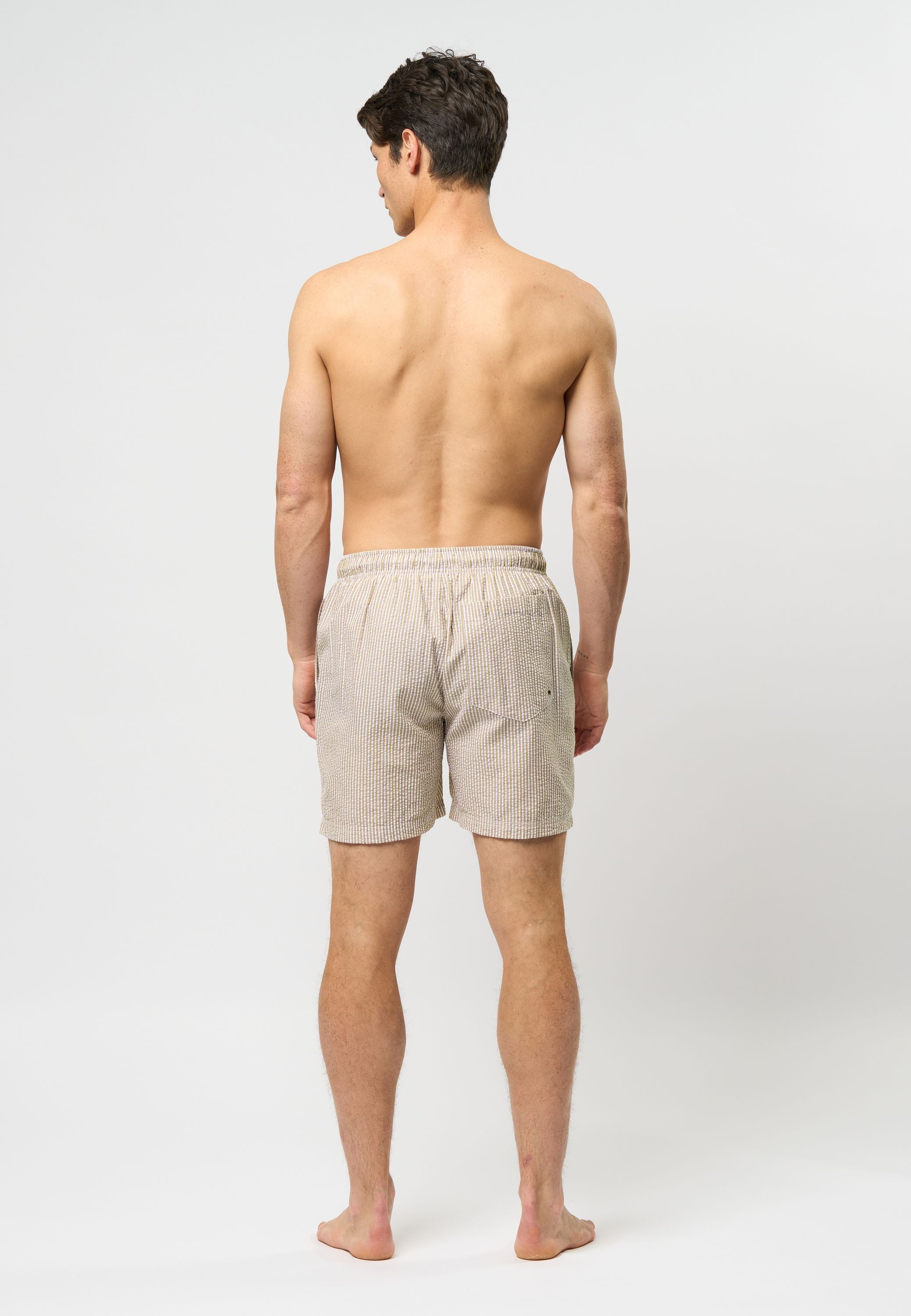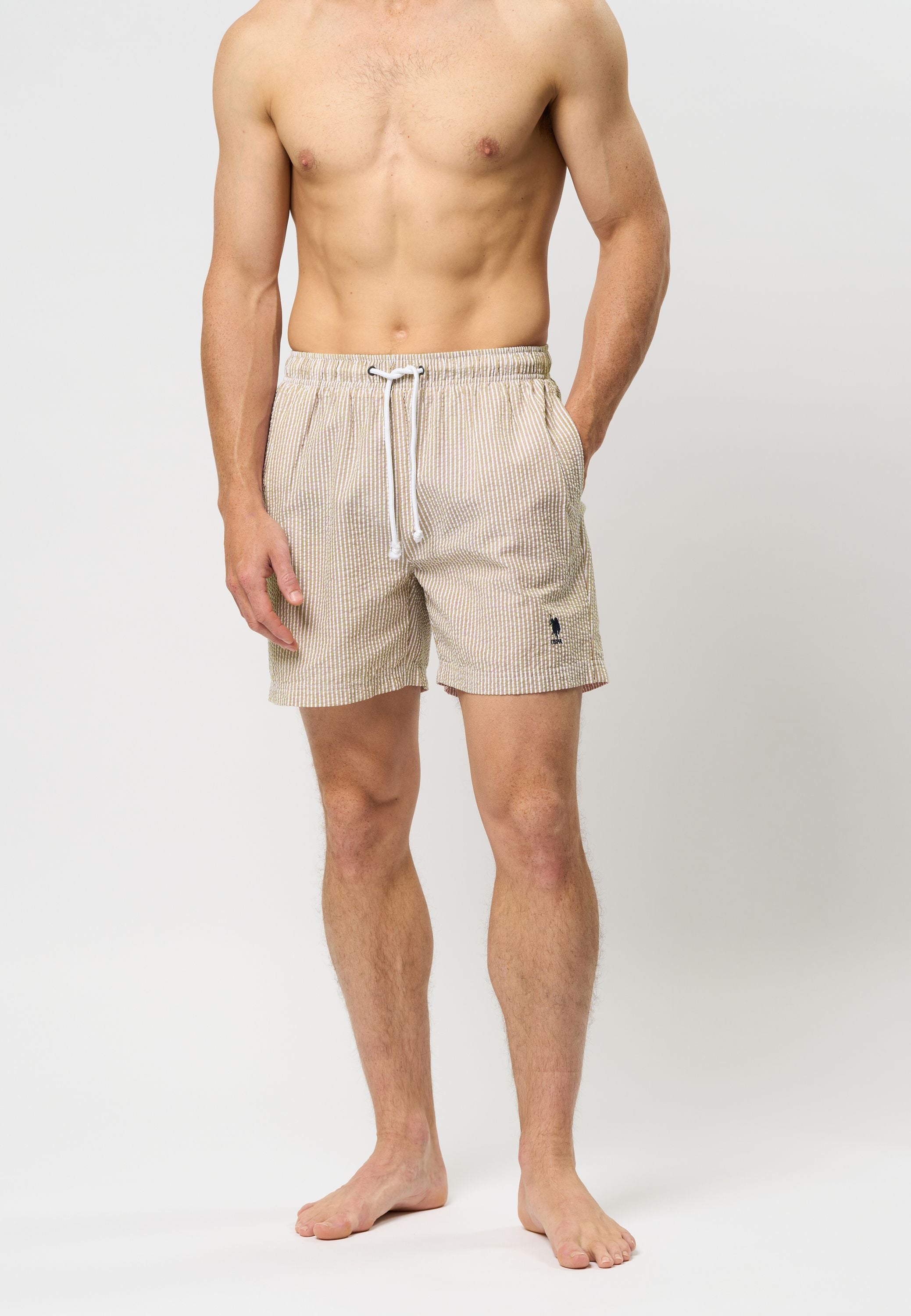 Briggs är ett par snygga och moderna badshorts med resår och dragsko i midjan. De har mesh på insidan och vår logotyp broderad på ena benet. Briggs är tillverkad i ett bäckebölja-kvalitet och har tunna ränder för en sofistikerad look. Ett perfekt val för en dag vid vattnet med stil.