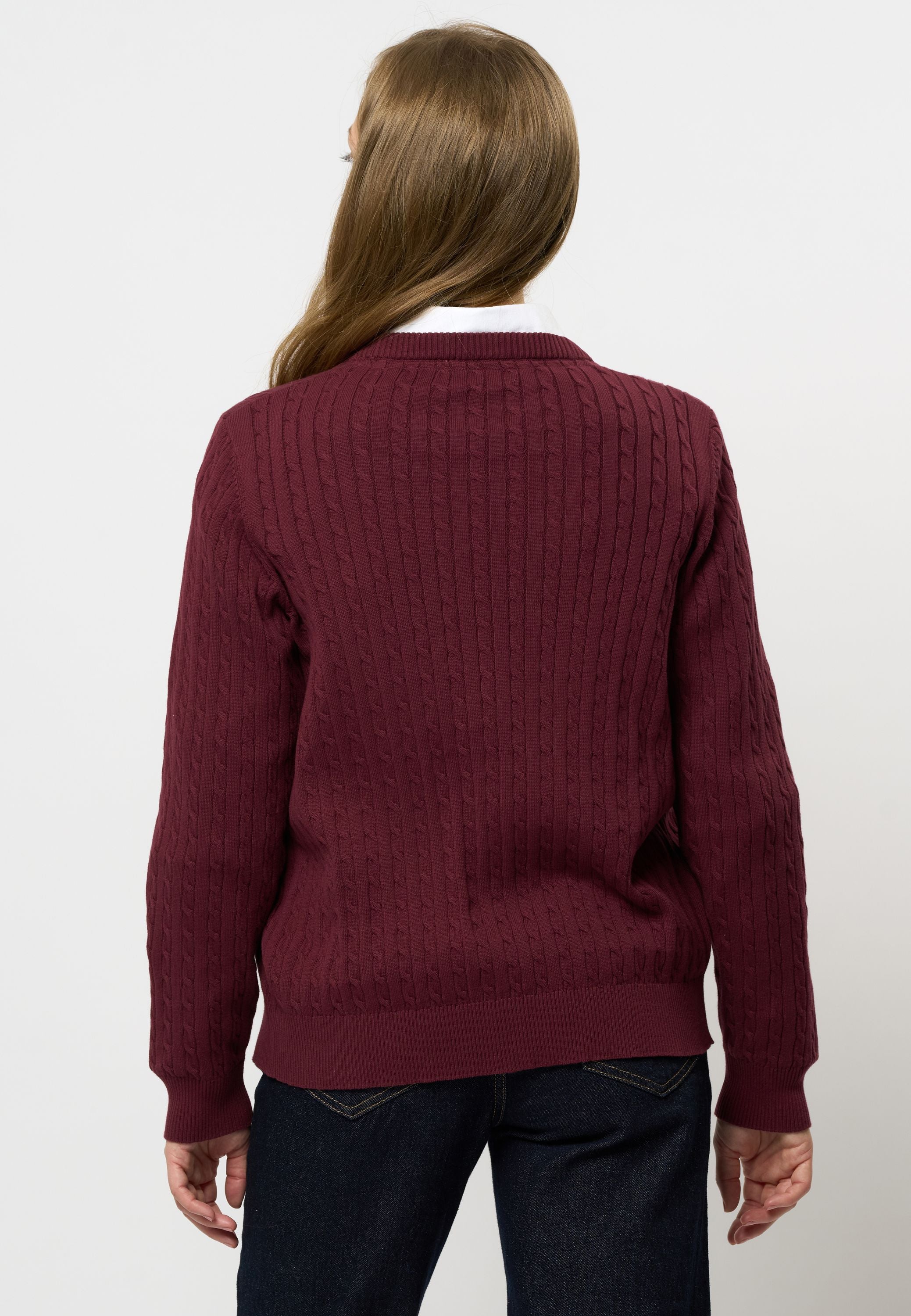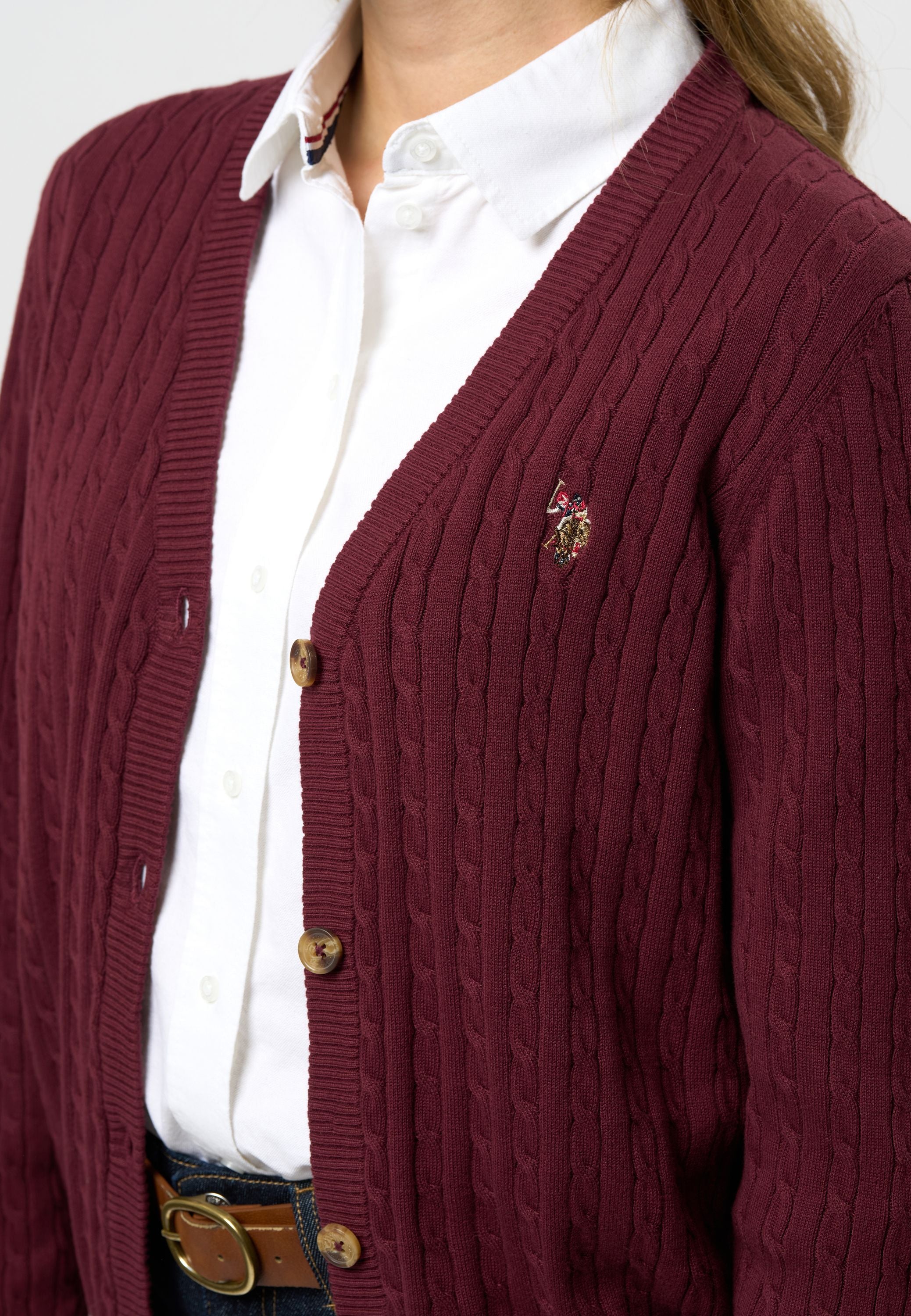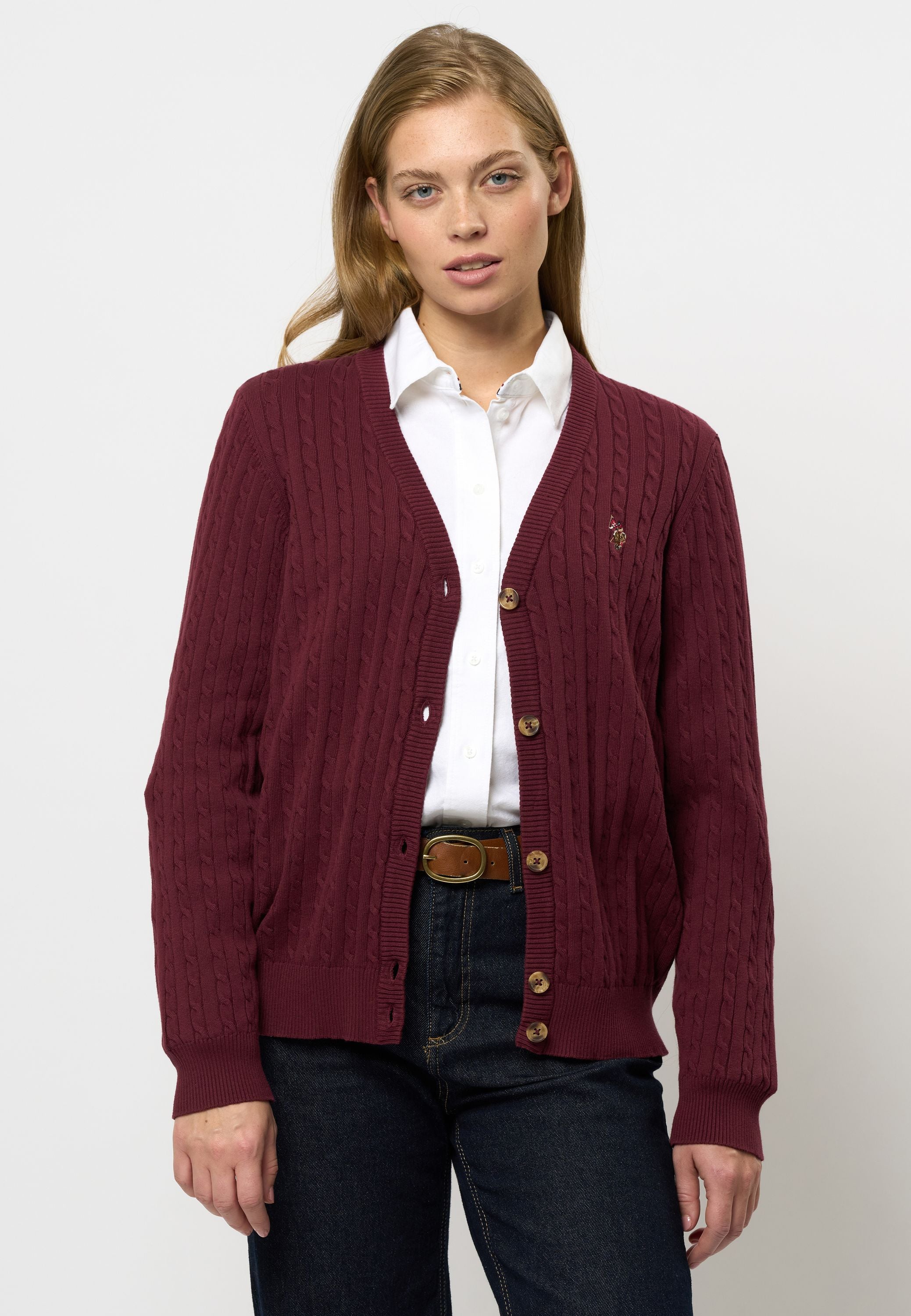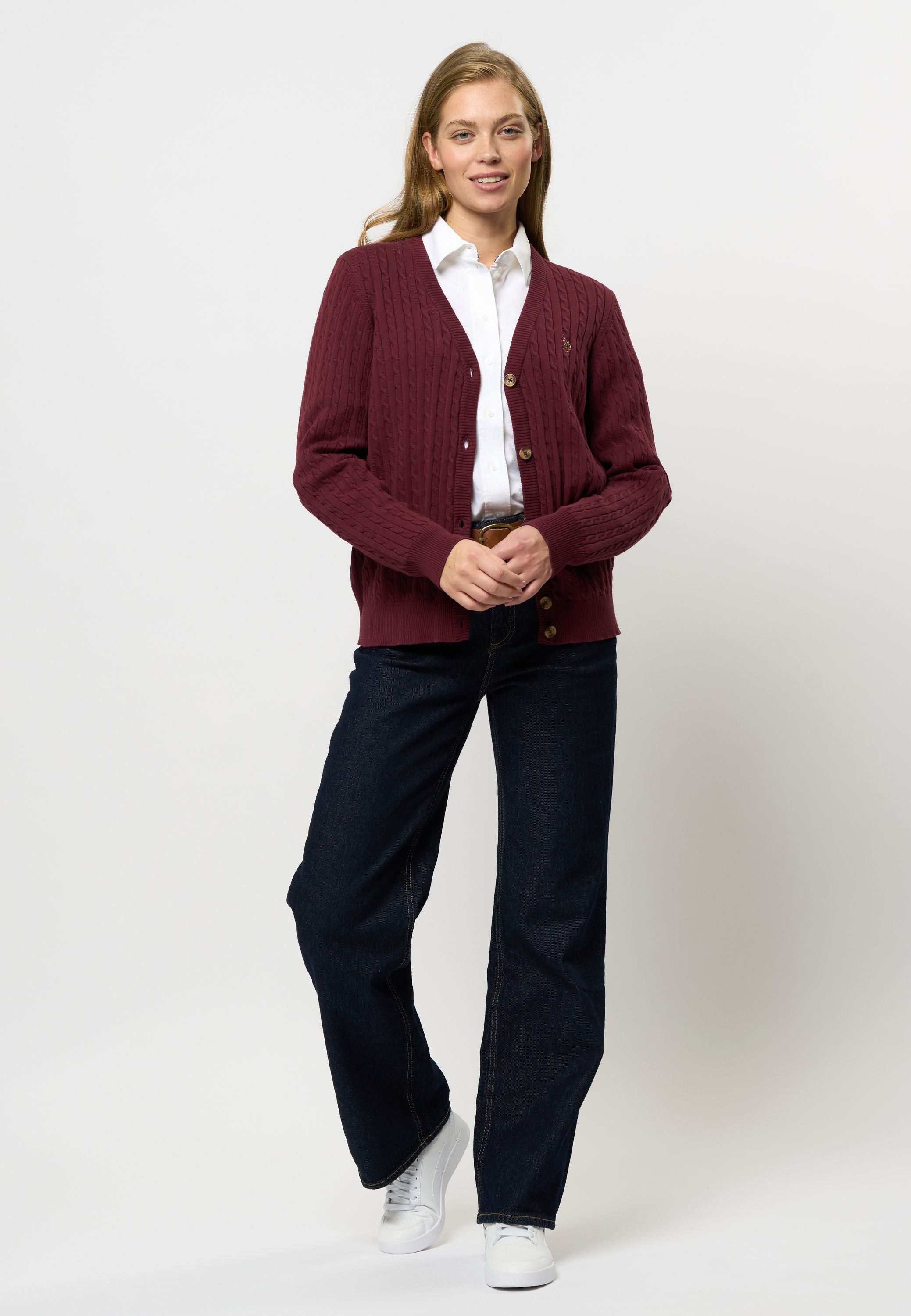 Gill är en klassisk cardigan med ett elegant kabelstickat mönster, perfekt för lager-på-lager-styling. Den har en feminin V-ringning och stängs med knappar, vilket gör den mångsidig för både vardagsbruk och mer formella tillfällen. Ribbstickning vid ärmar och midja säkerställer en bra passform, medan vår diskreta logga på bröstet ger en exklusiv touch.