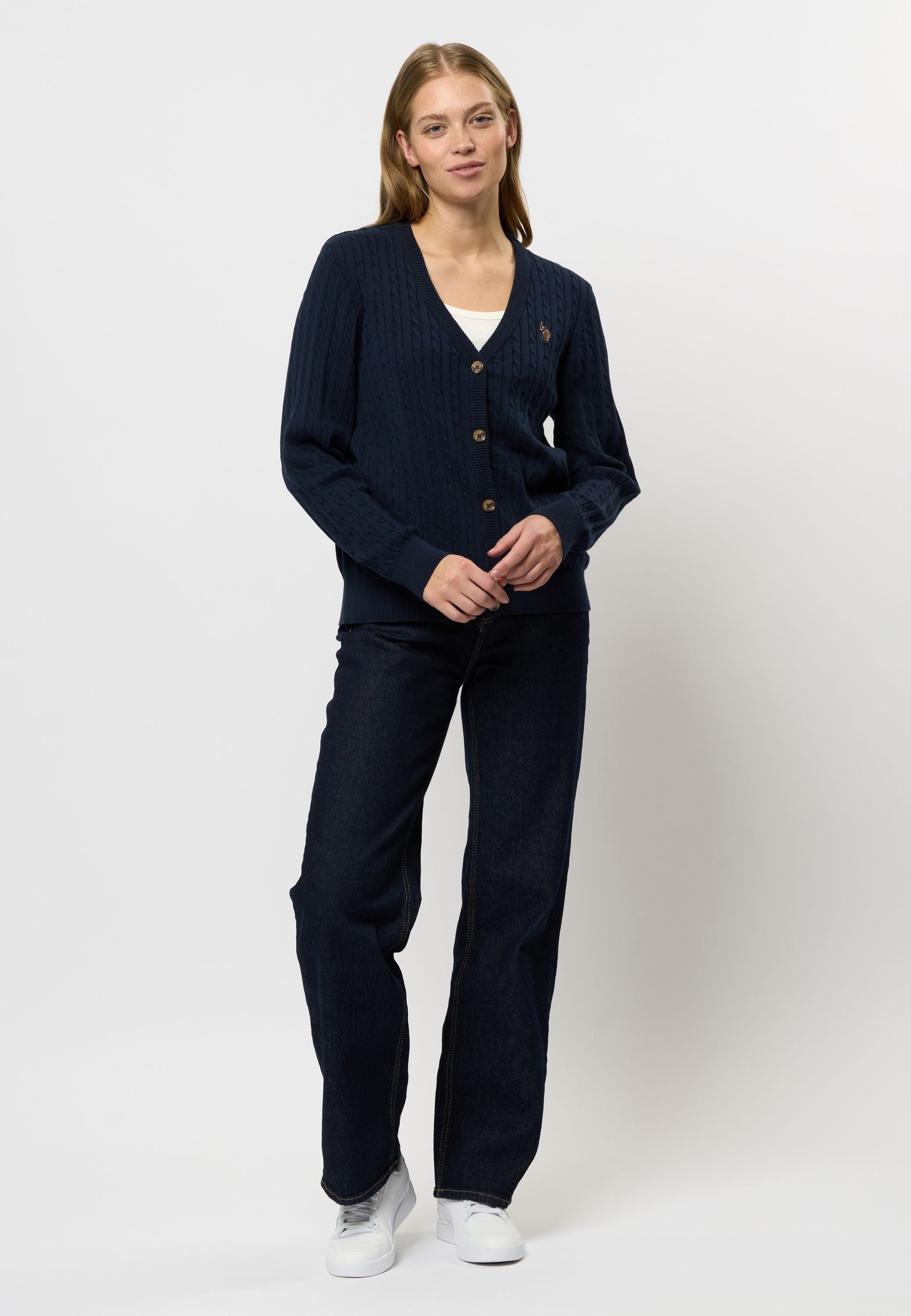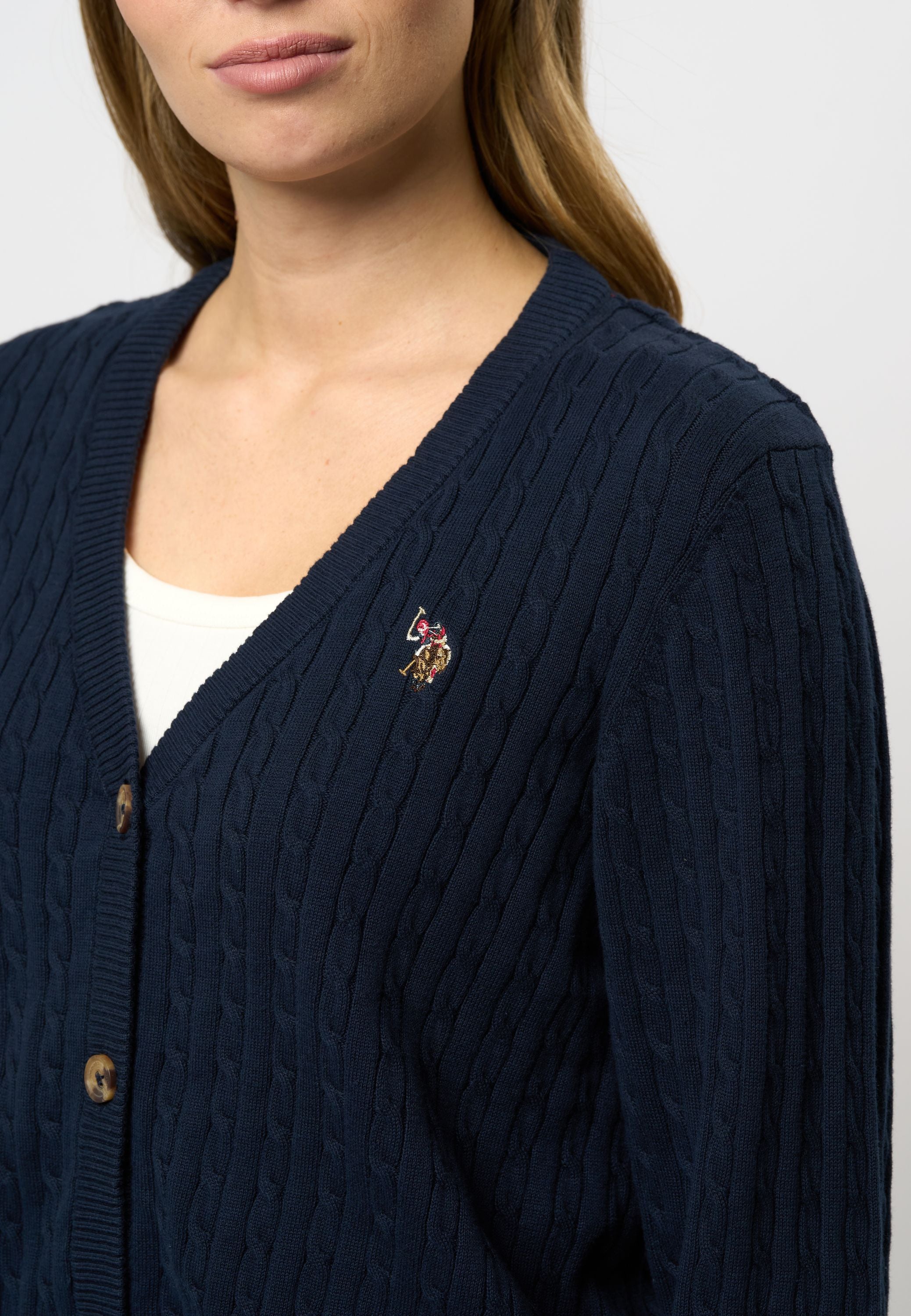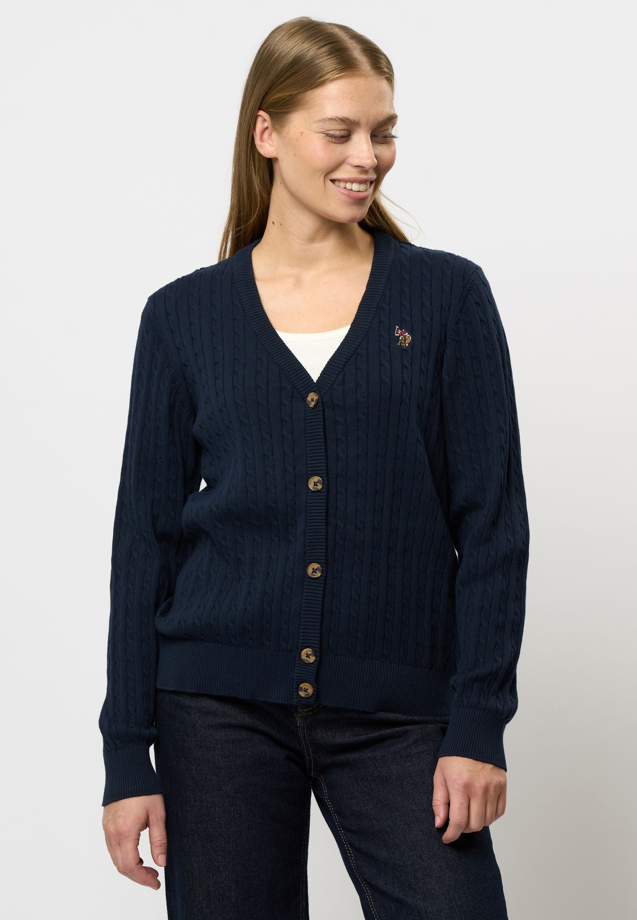 Gill är en klassisk cardigan med ett elegant kabelstickat mönster, perfekt för lager-på-lager-styling. Den har en feminin V-ringning och stängs med knappar, vilket gör den mångsidig för både vardagsbruk och mer formella tillfällen. Ribbstickning vid ärmar och midja säkerställer en bra passform, medan vår diskreta logga på bröstet ger en exklusiv touch.