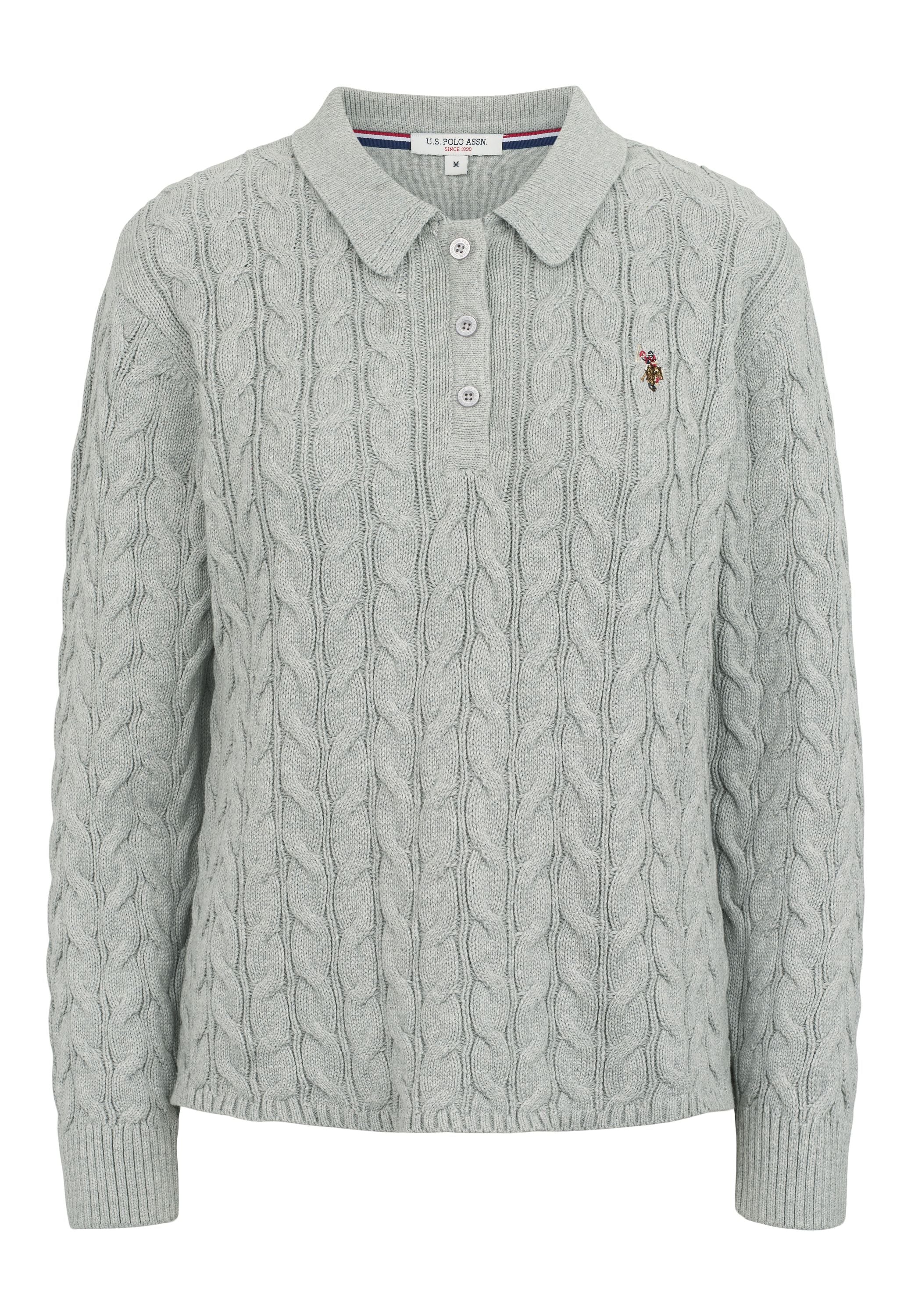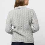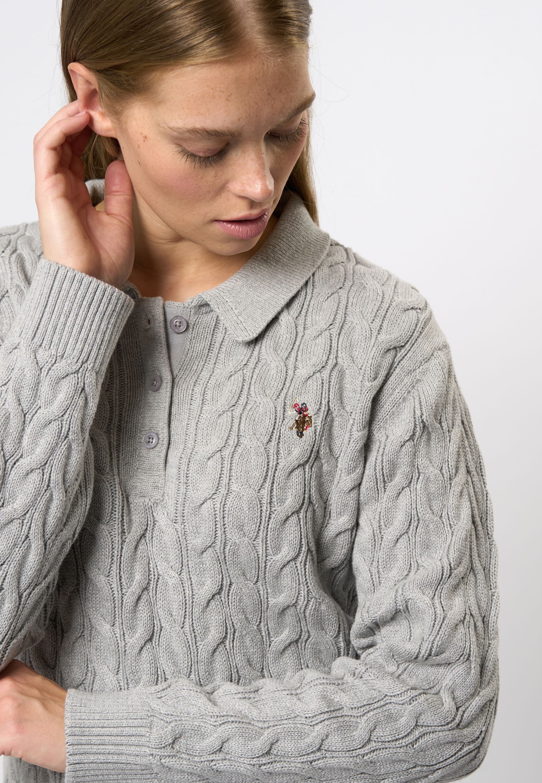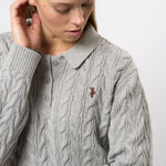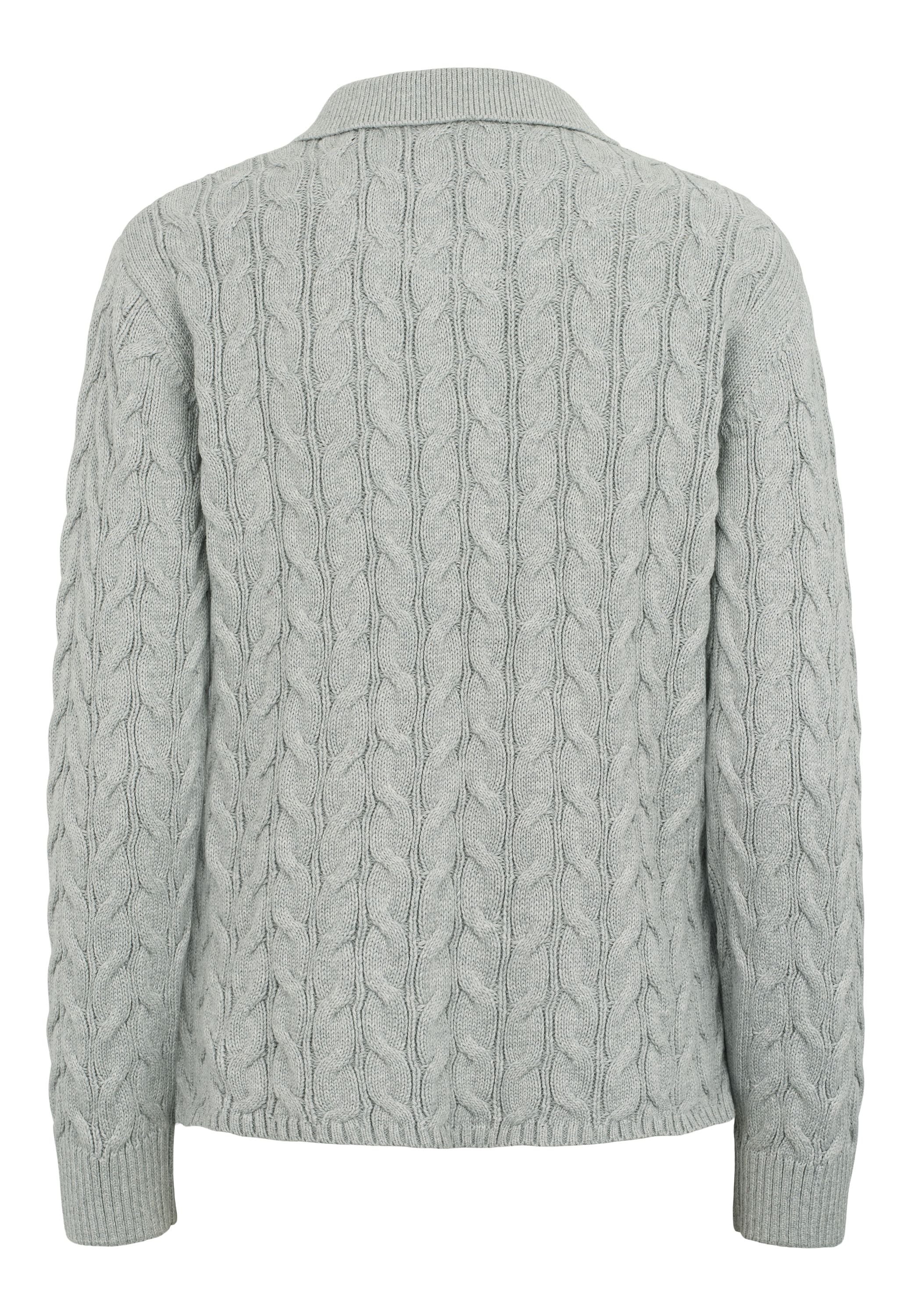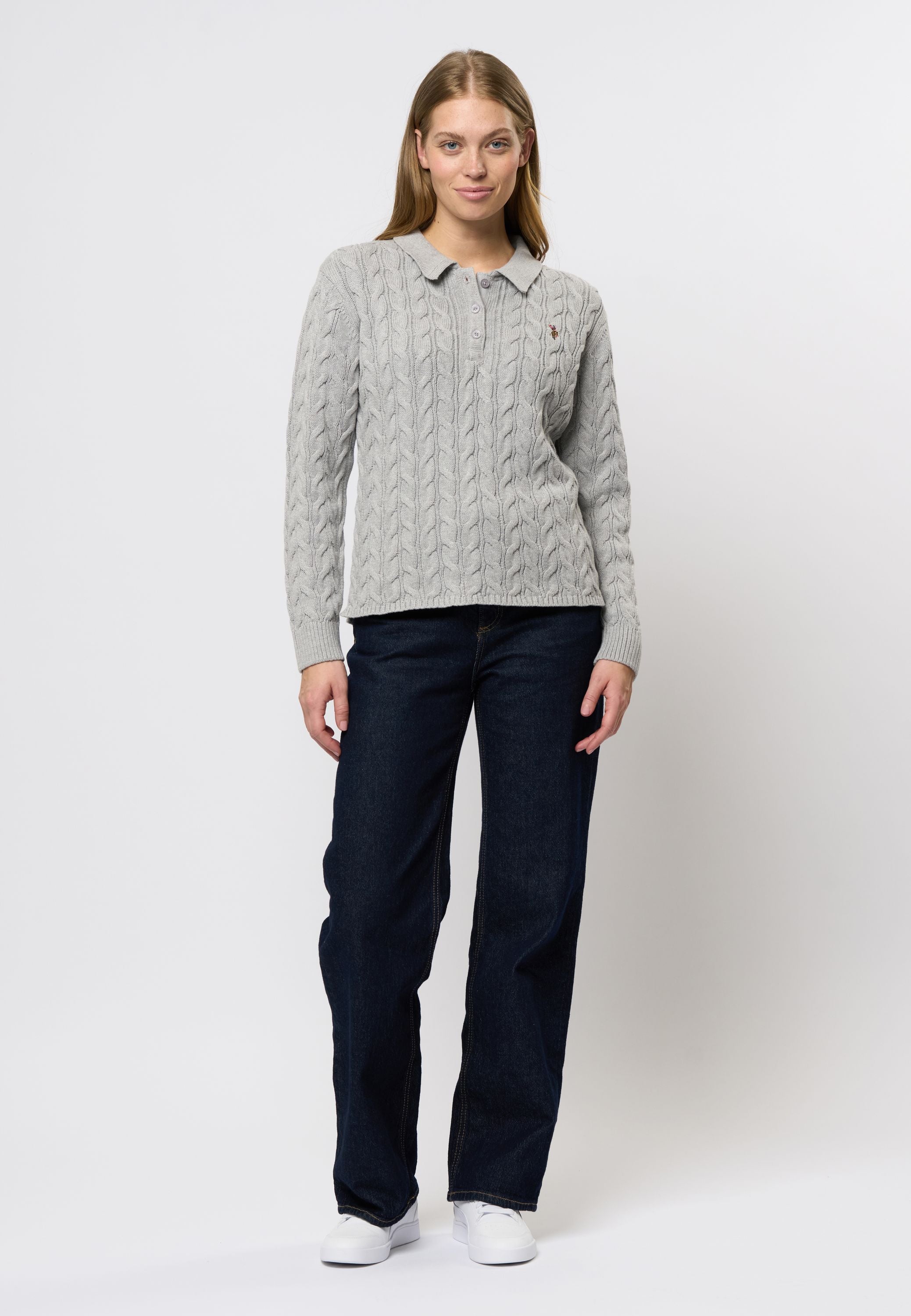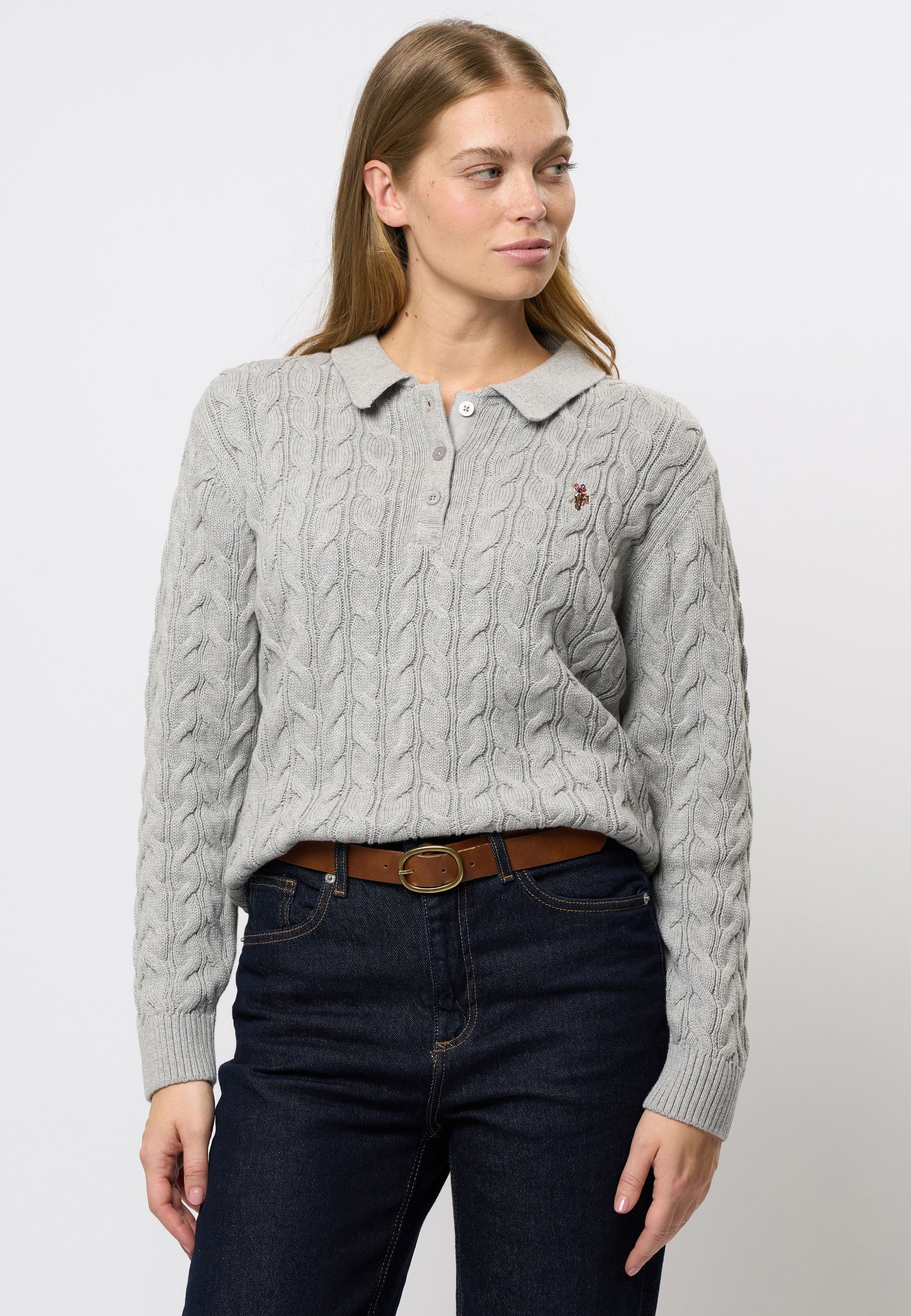 Karin är en klassisk kabelstickad med polokrage och knappstängning – en avslappnad och stilren vardagsfavorit. Tröjan har ribb i ärmslut och nederkant, vilket säkerställer en bra passform, medan den broderade loggan på bröstet ger en diskret sportig touch. Lätt att styla med allt från jeans till kjolar – både till jobbet och helgen.