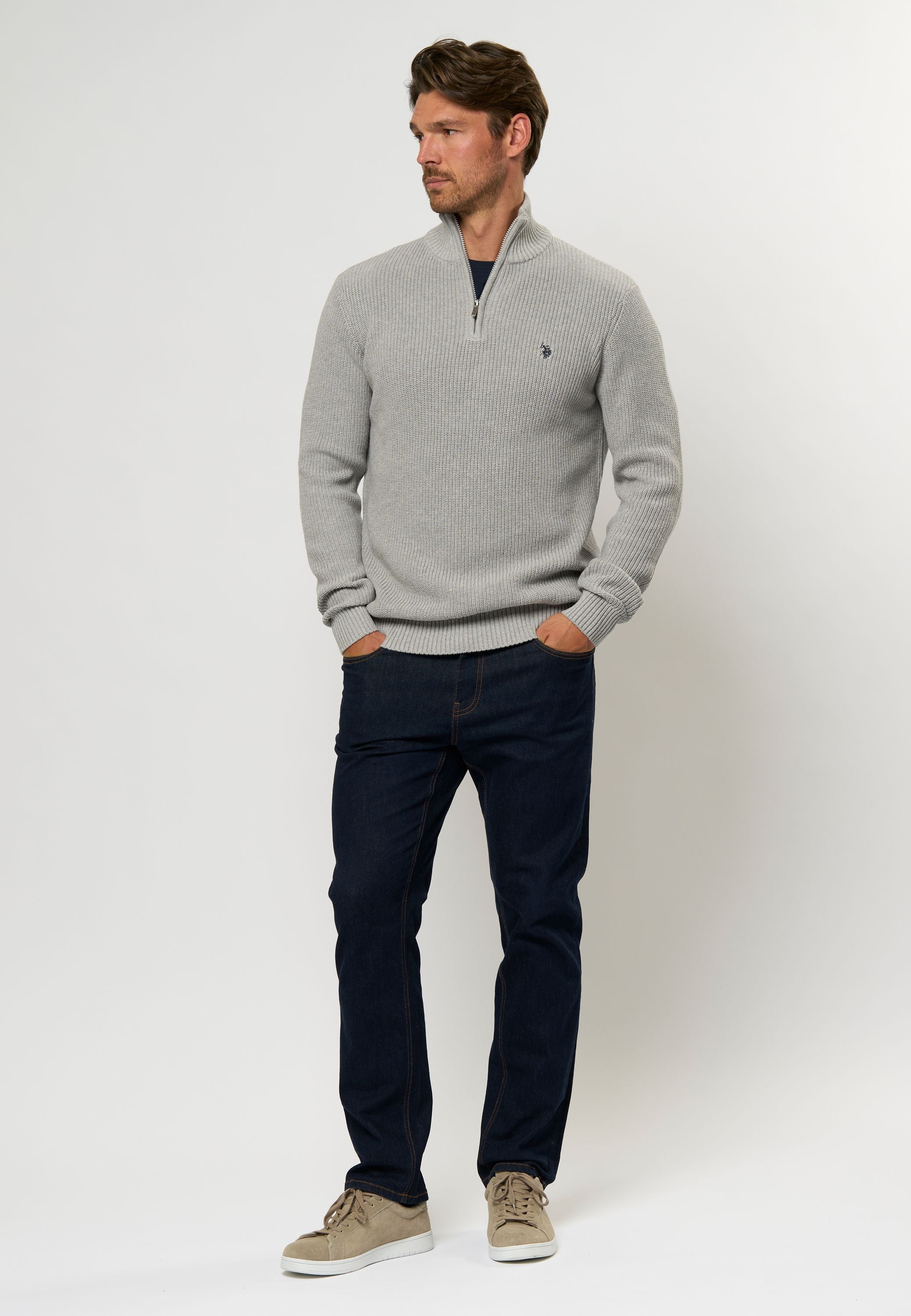 Rafael är en tjockare stickad tröja med en tydlig struktur i en avslappnad men elegant design. Tröjan har en hög krage med halv dragkedja och ribbade kanter för en perfekt passform. En liten broderad logotyp på bröstet fulländar den stilrena looken. Bär den som ett varmt lager över en skjorta eller under en jacka på kalla dagar.