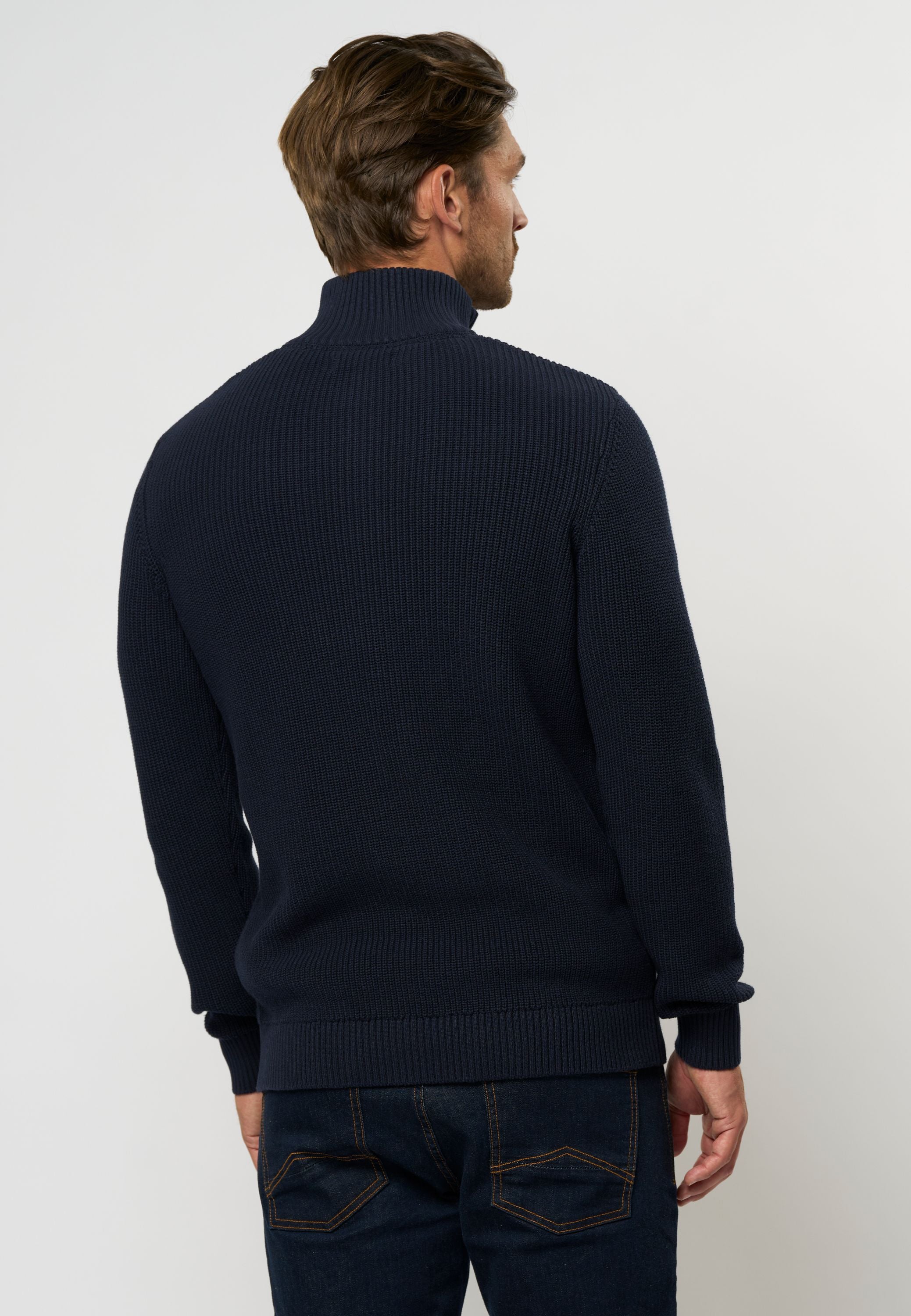 • Kraftig strukturstickad med hög krage och ribbade kanter