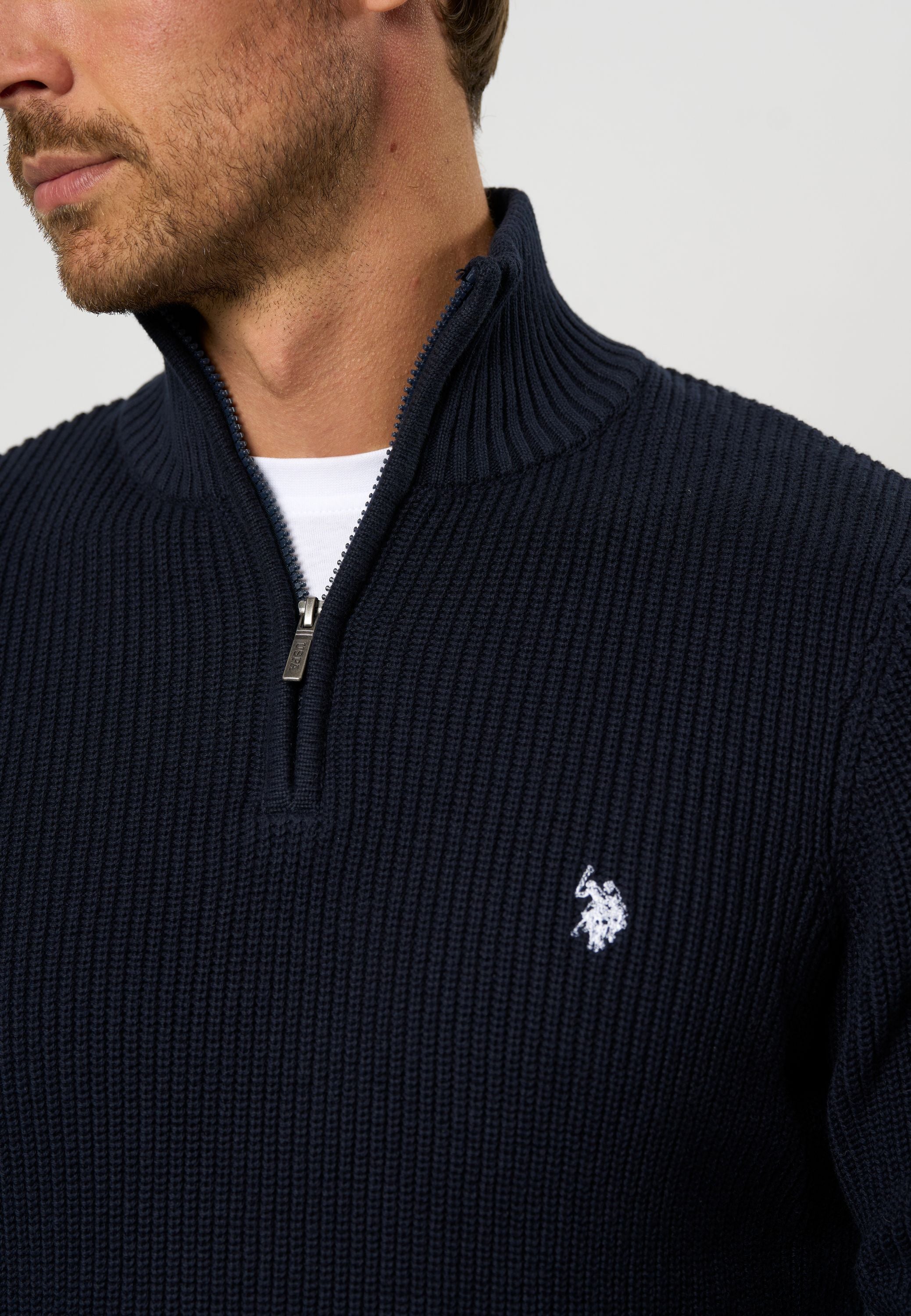 Rafael är en tjockare stickad tröja med en tydlig struktur i en avslappnad men elegant design. Tröjan har en hög krage med halv dragkedja och ribbade kanter för en perfekt passform. En liten broderad logotyp på bröstet fulländar den stilrena looken. Bär den som ett varmt lager över en skjorta eller under en jacka på kalla dagar.