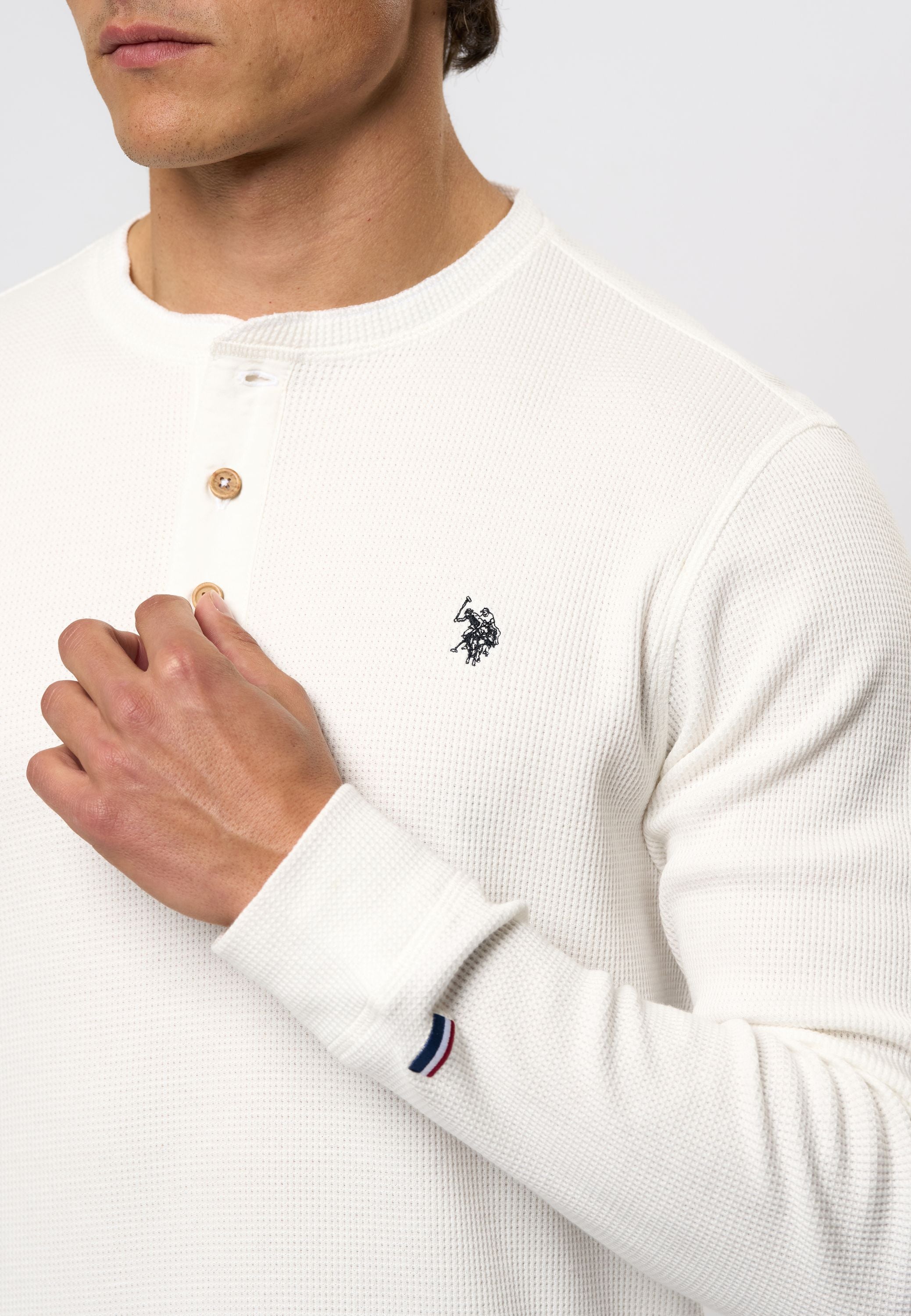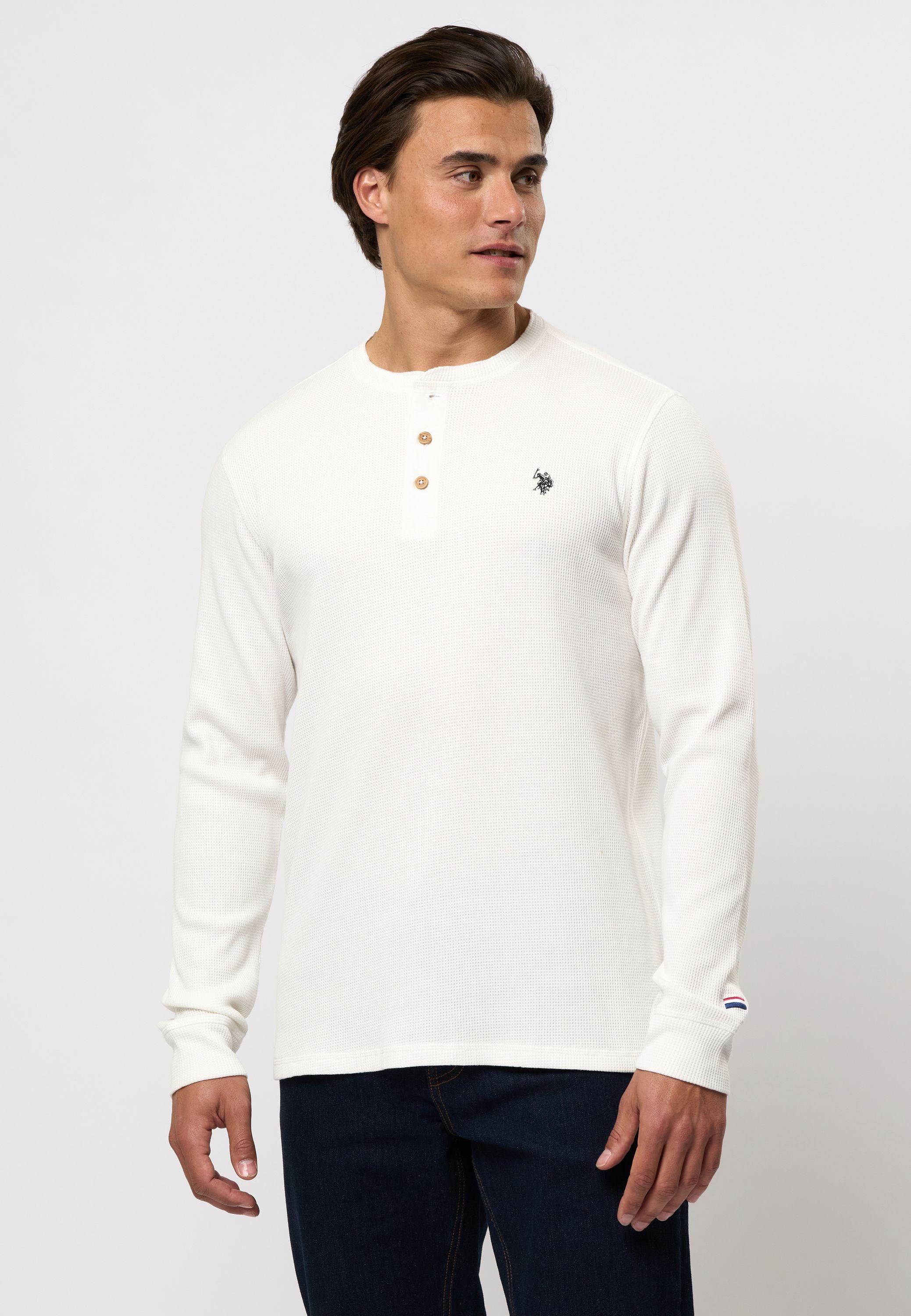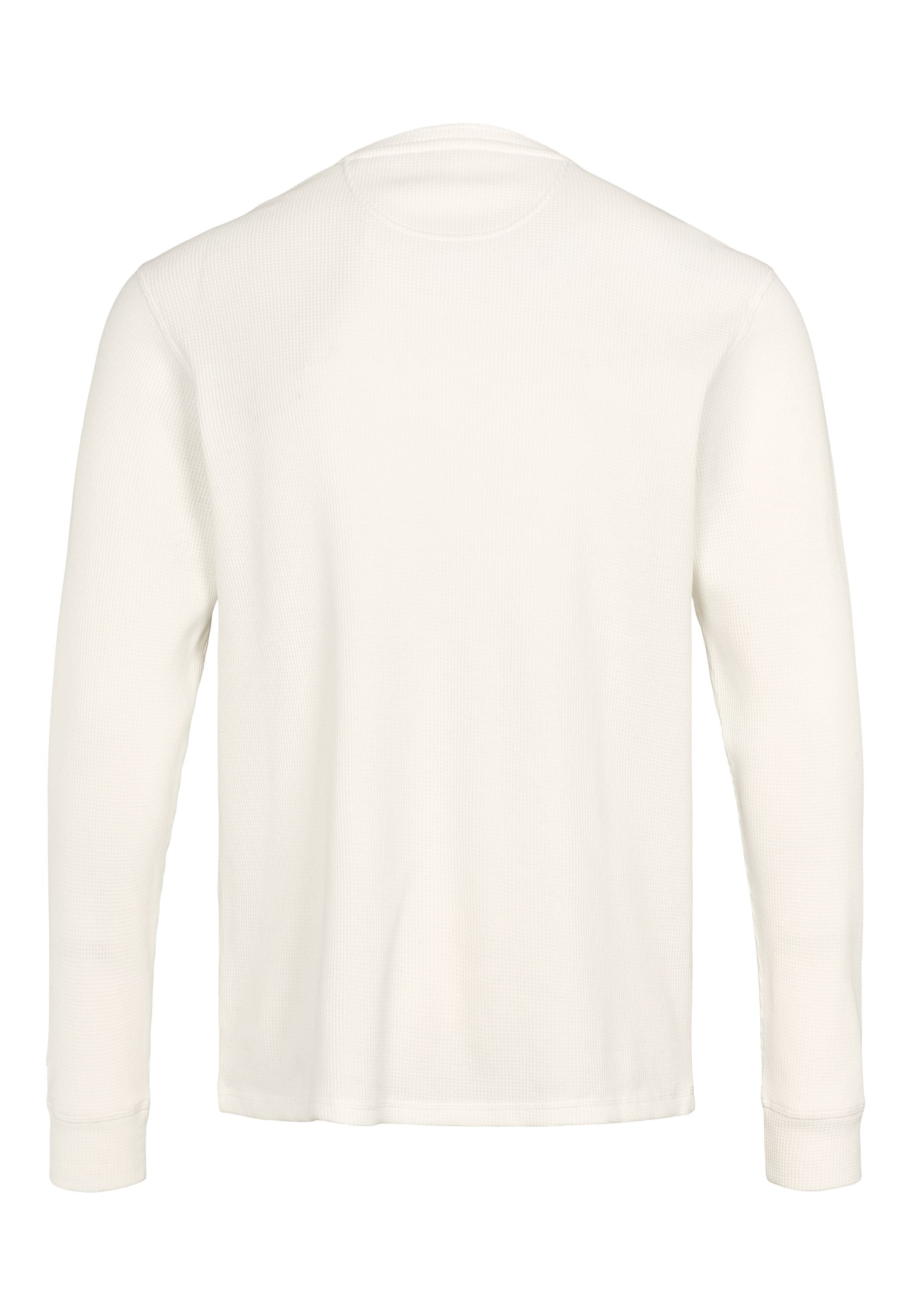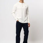 Rex är en långärmad T-shirt i mjuk, våffelvävd bomull med struktur. Den har en klassisk grandad-krage med tre knappar i trälook och ribbade ärmslut för en bra passform. Den broderade loggan på bröstet och randen vid ärmslutet ger ett sportigt och igenkännbart uttryck.