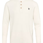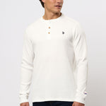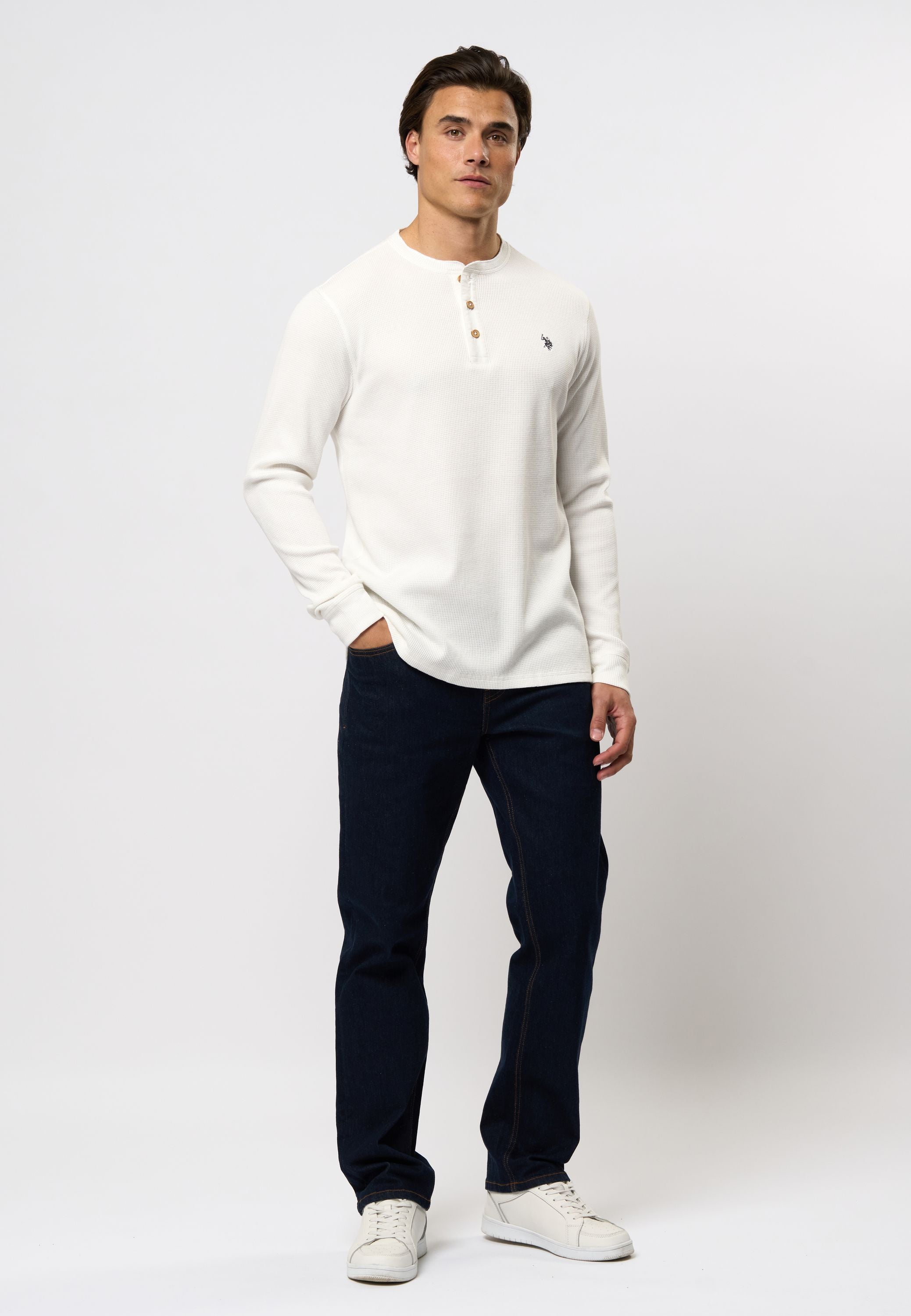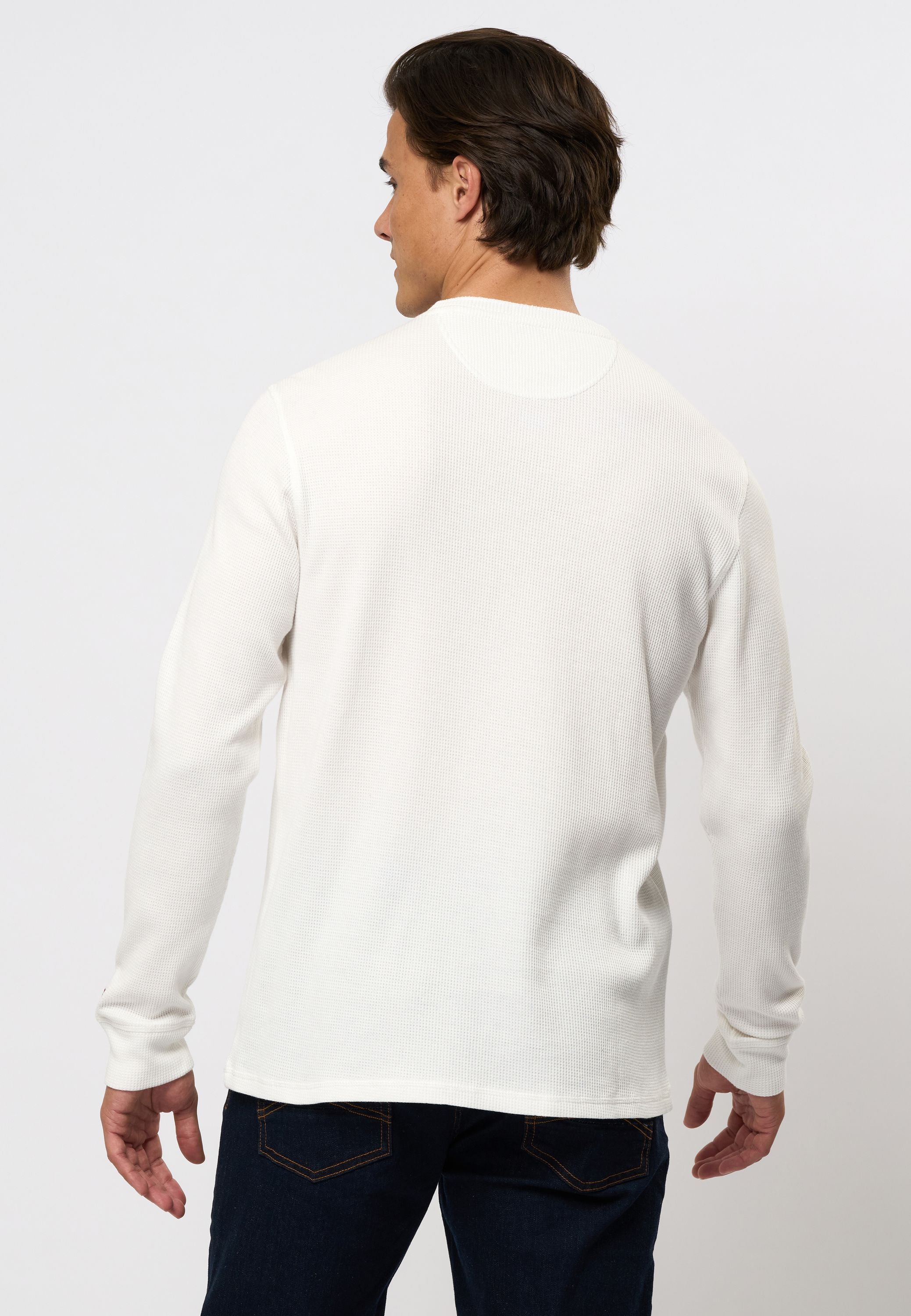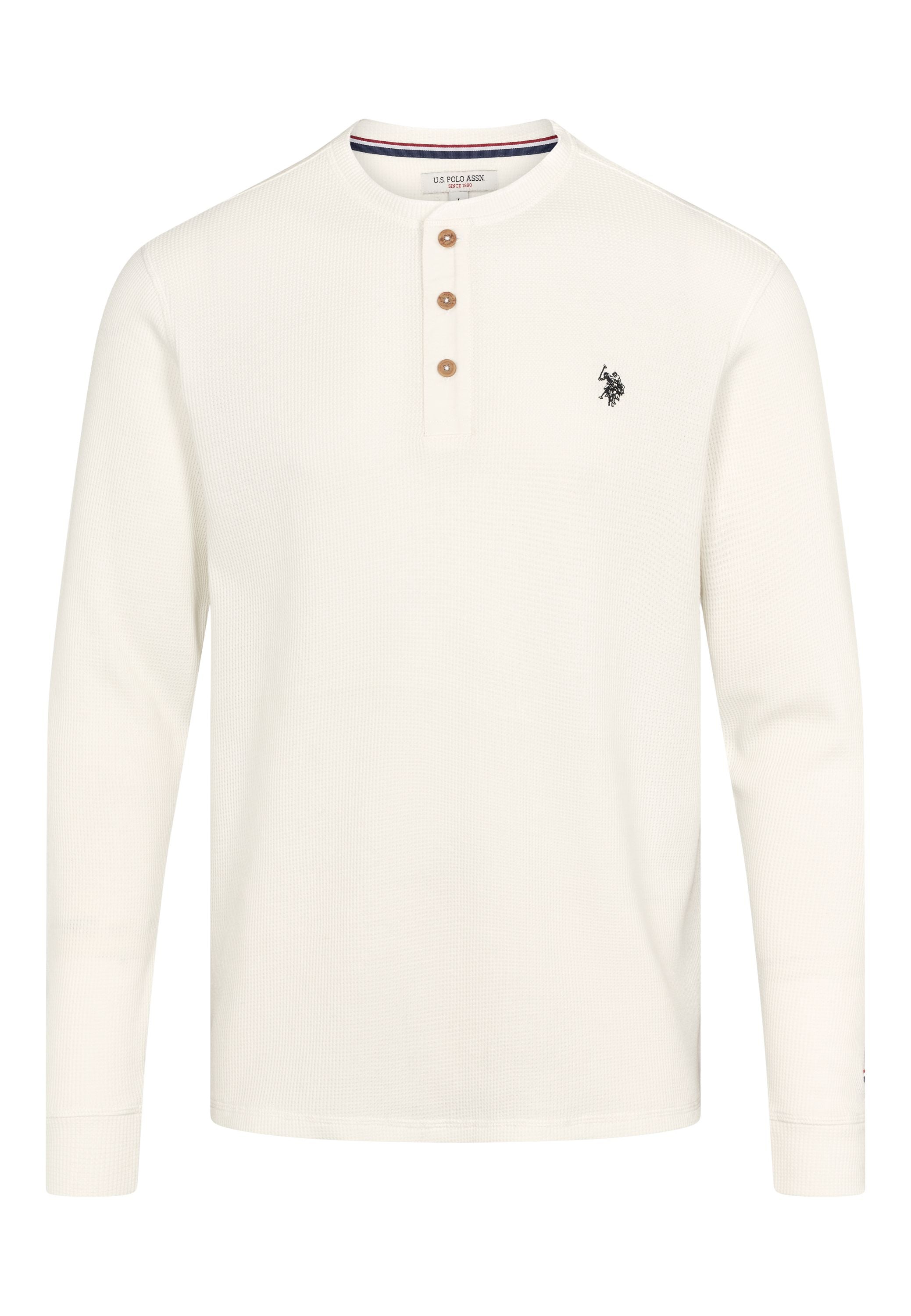 Rex är en långärmad T-shirt i mjuk, våffelvävd bomull med struktur. Den har en klassisk grandad-krage med tre knappar i trälook och ribbade ärmslut för en bra passform. Den broderade loggan på bröstet och randen vid ärmslutet ger ett sportigt och igenkännbart uttryck.