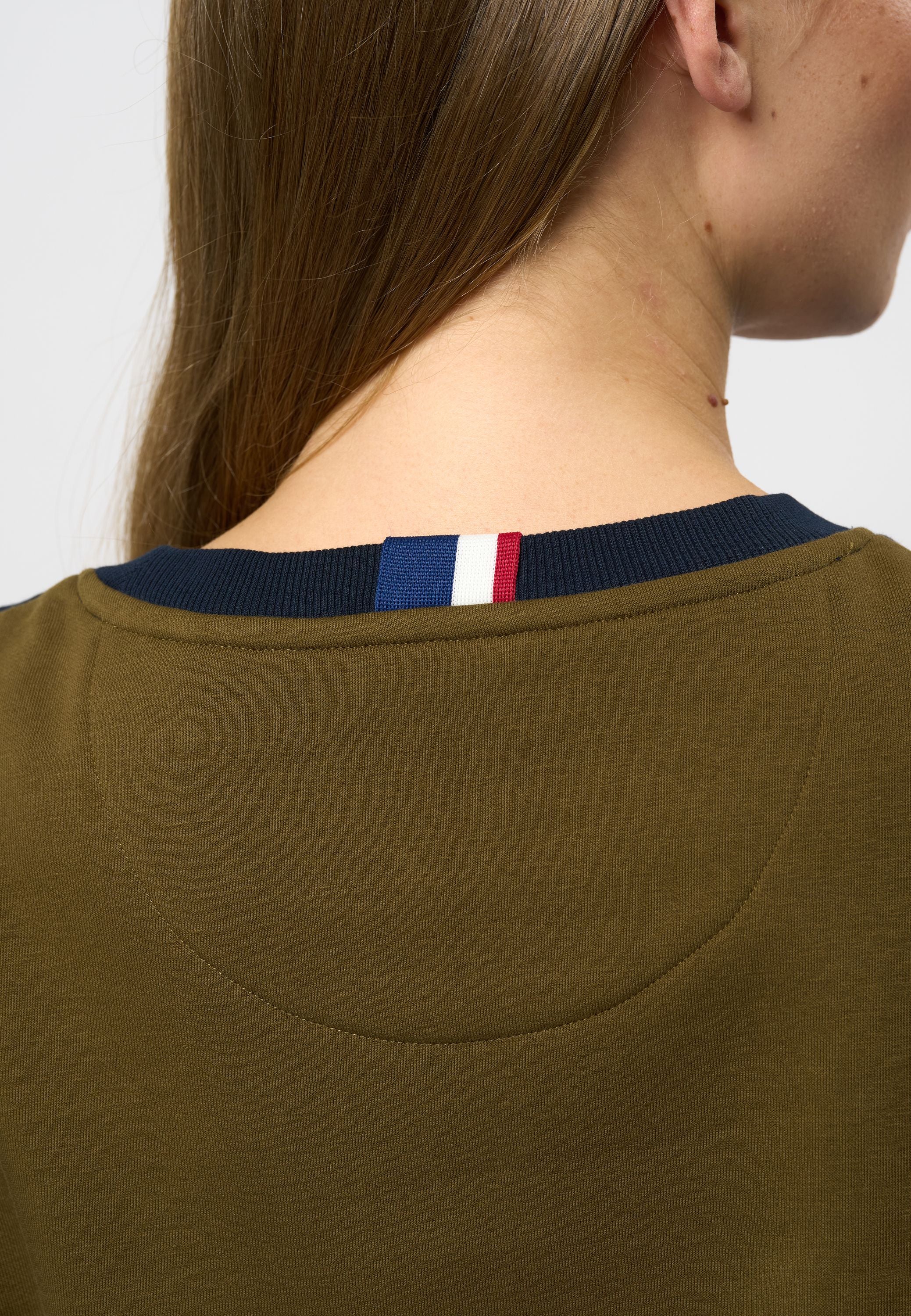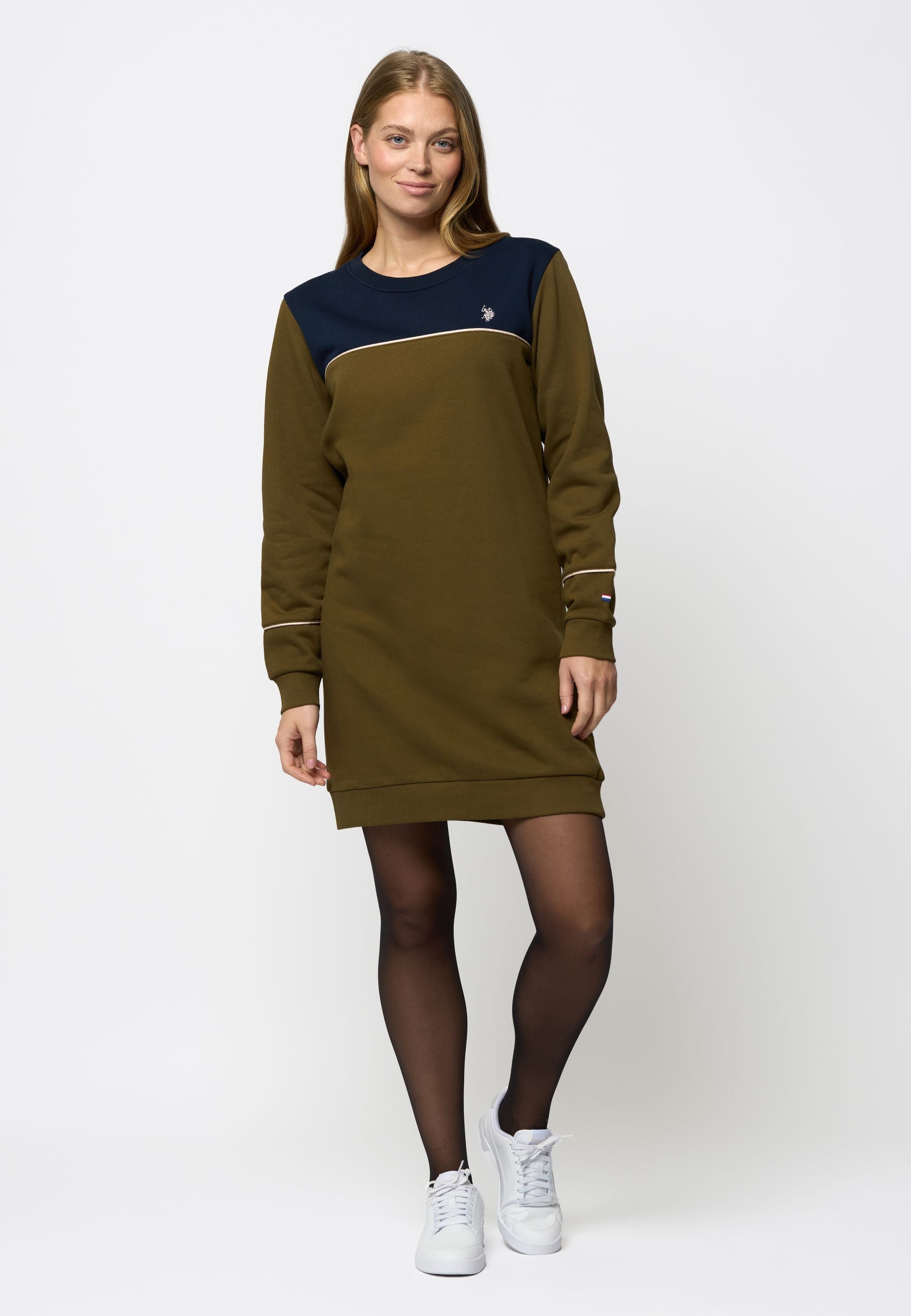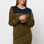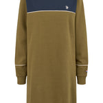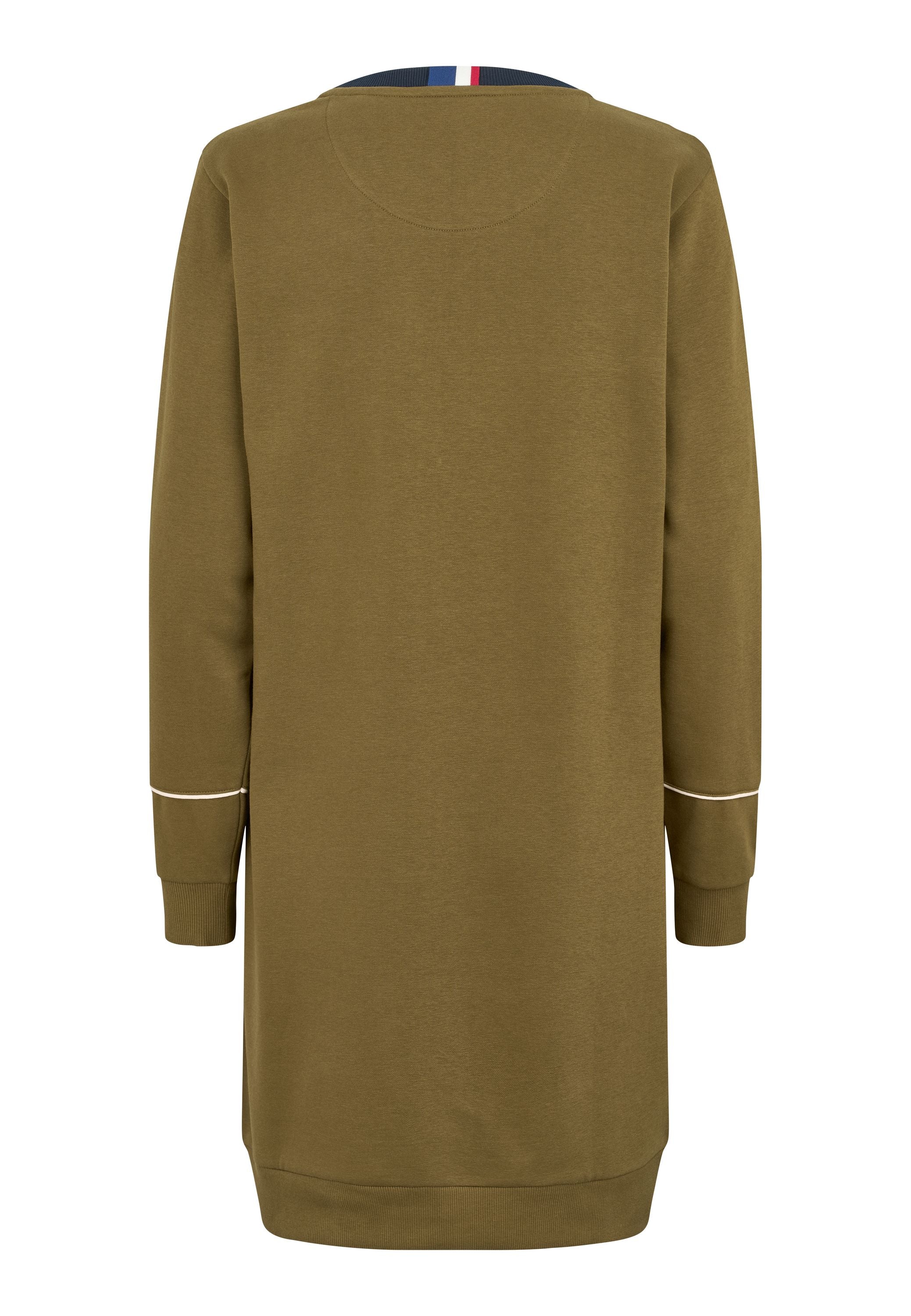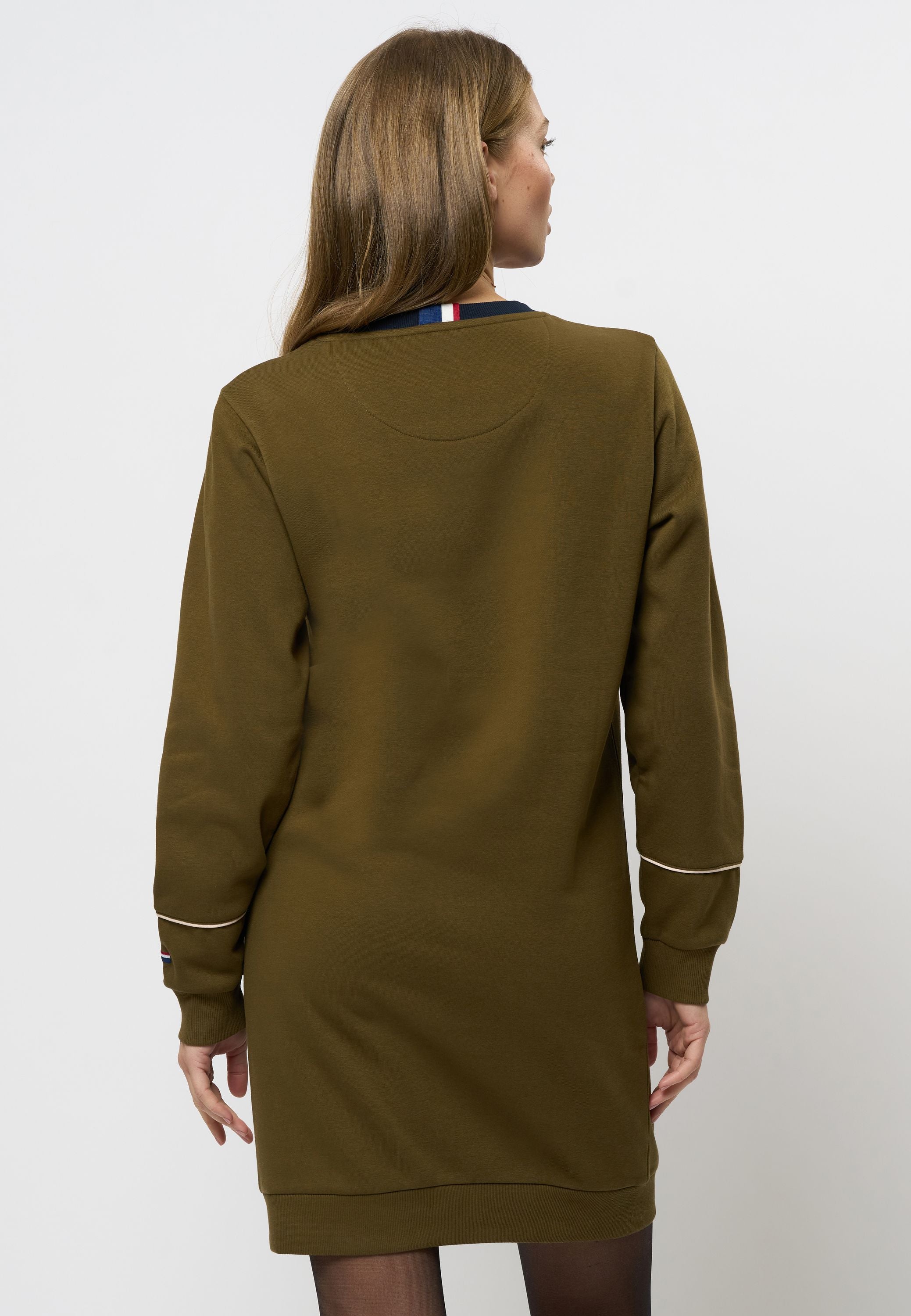 Katja är en avslappnad sweatklänning med sportiga detaljer och ett feminint snitt. Den delade designen ger en modern och avslappnad look, medan de broderade logotyperna och kontrasterande ränderna ger en diskret varumärkessignatur. Modellen har rund hals och ribbade kanter som håller formen och ger struktur. En lättsam vardagsfavorit, som kan stylas både med sneakers och tights.