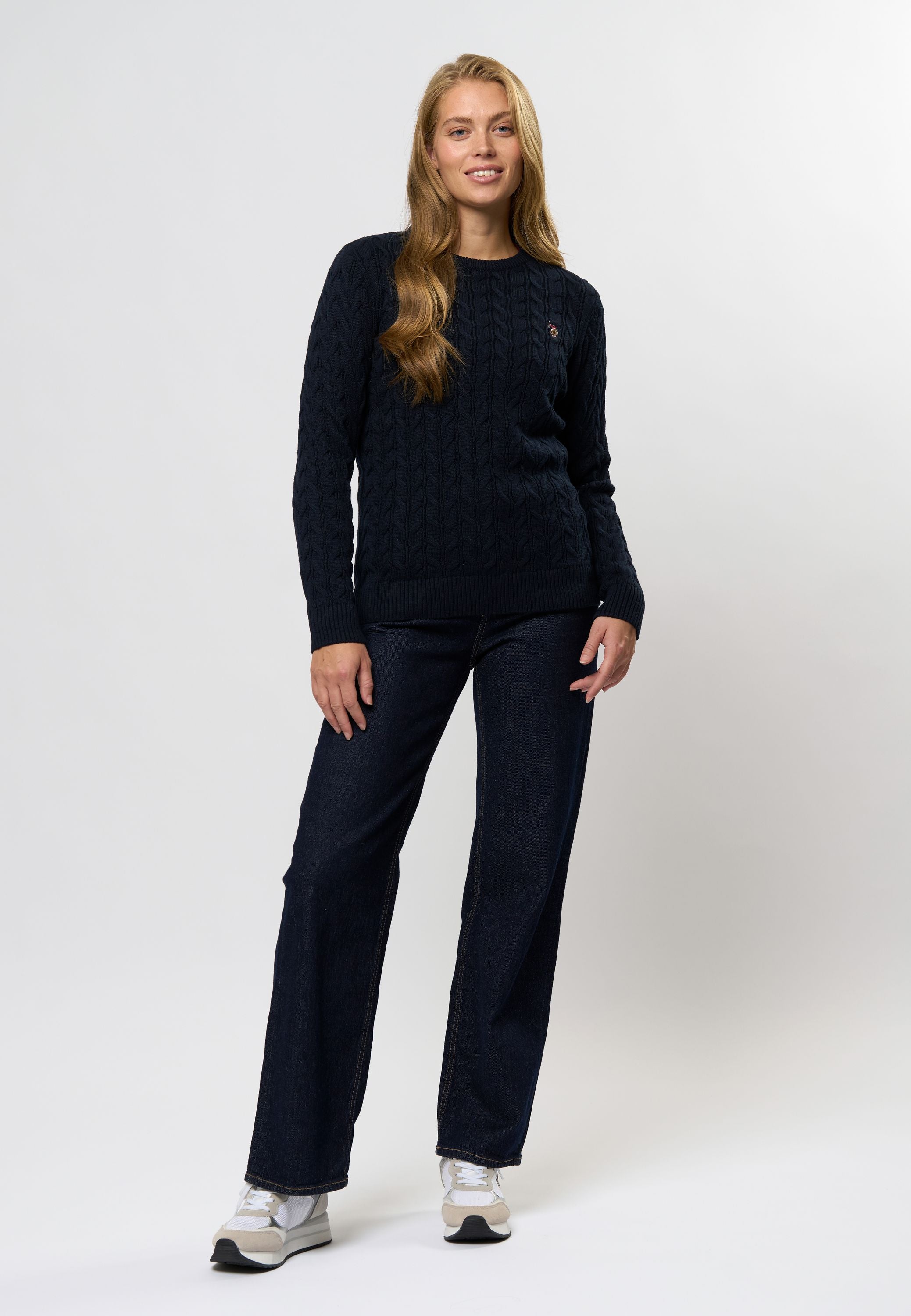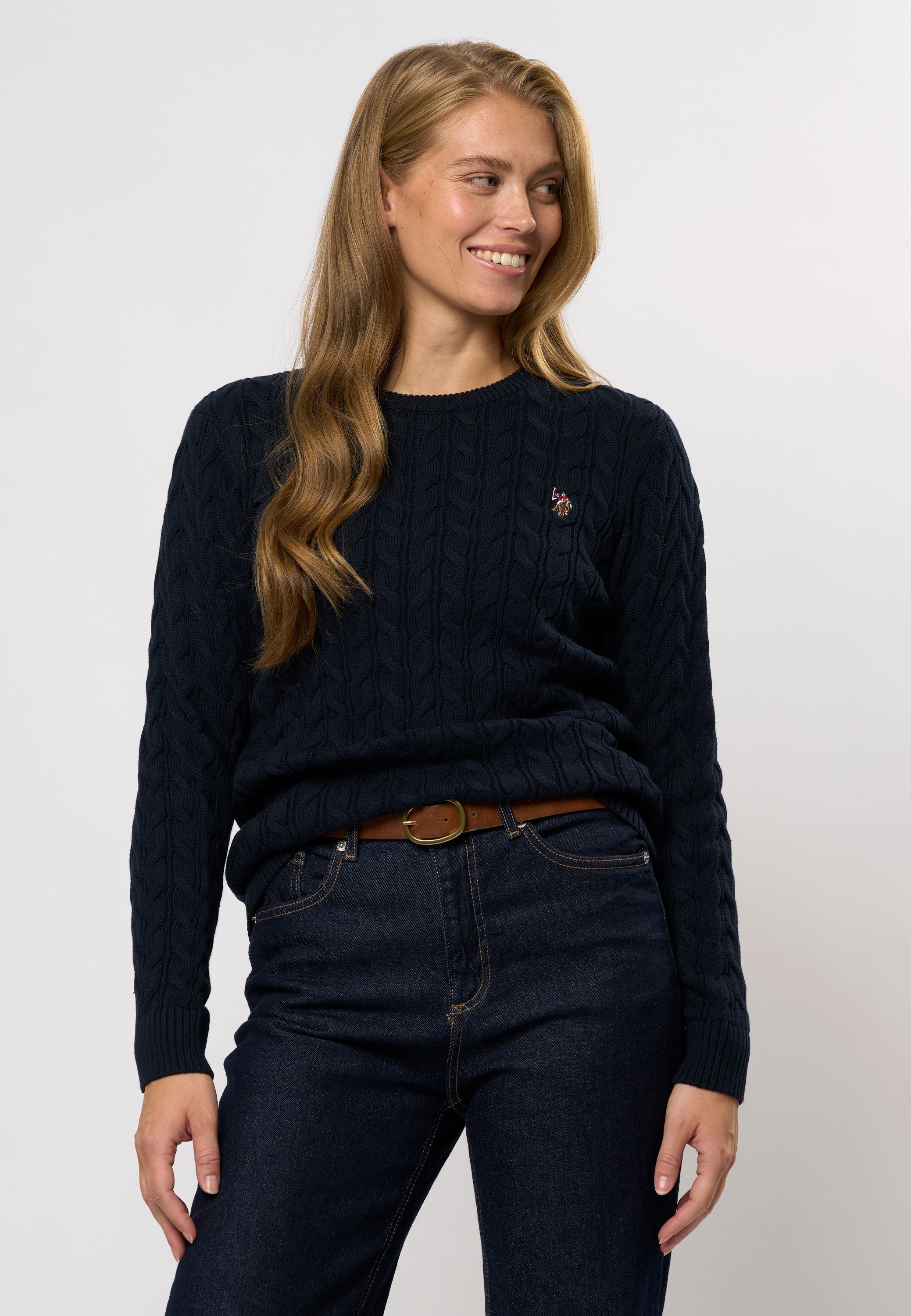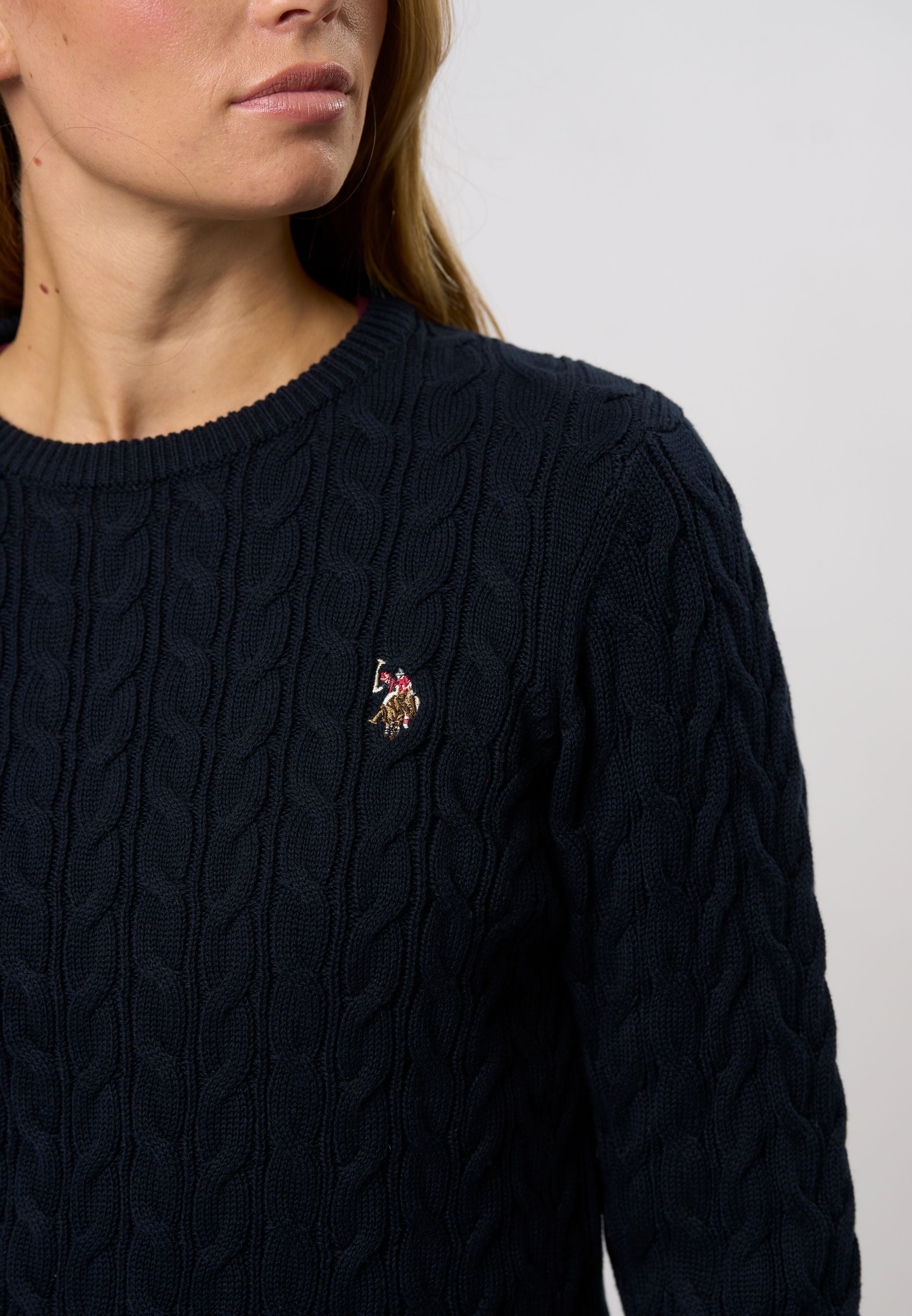 Madeline är en klassisk kabelstickad med rund hals och ett stilrent, tidlöst uttryck. Den har en normal passform och är avslutad med ribb i botten och ärmar för en snygg finish. Den broderade logotypen på bröstet ger en sportig touch och framhäver märkets signaturstil. Lätt att styla för både vardag och trevligare tillfällen.