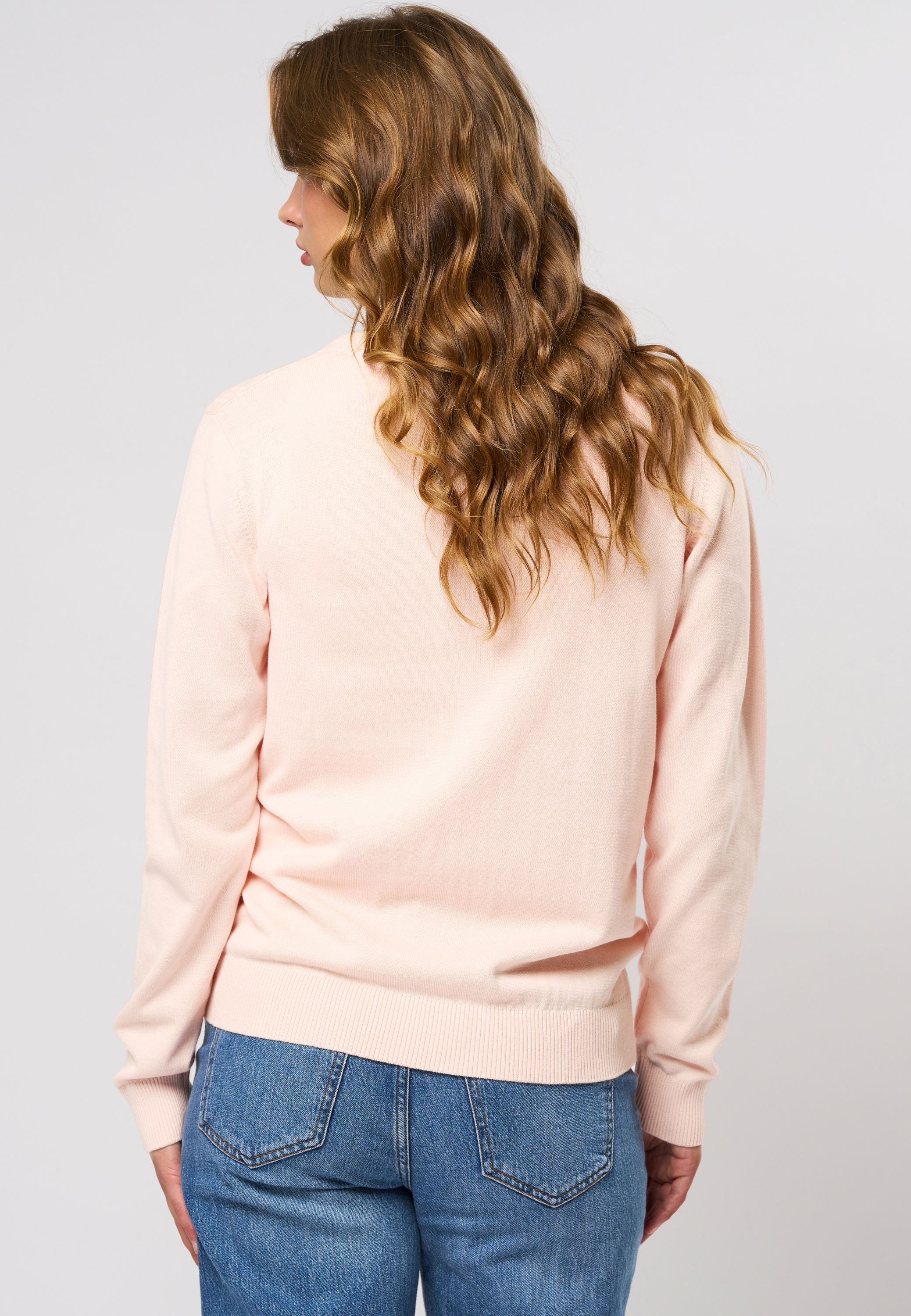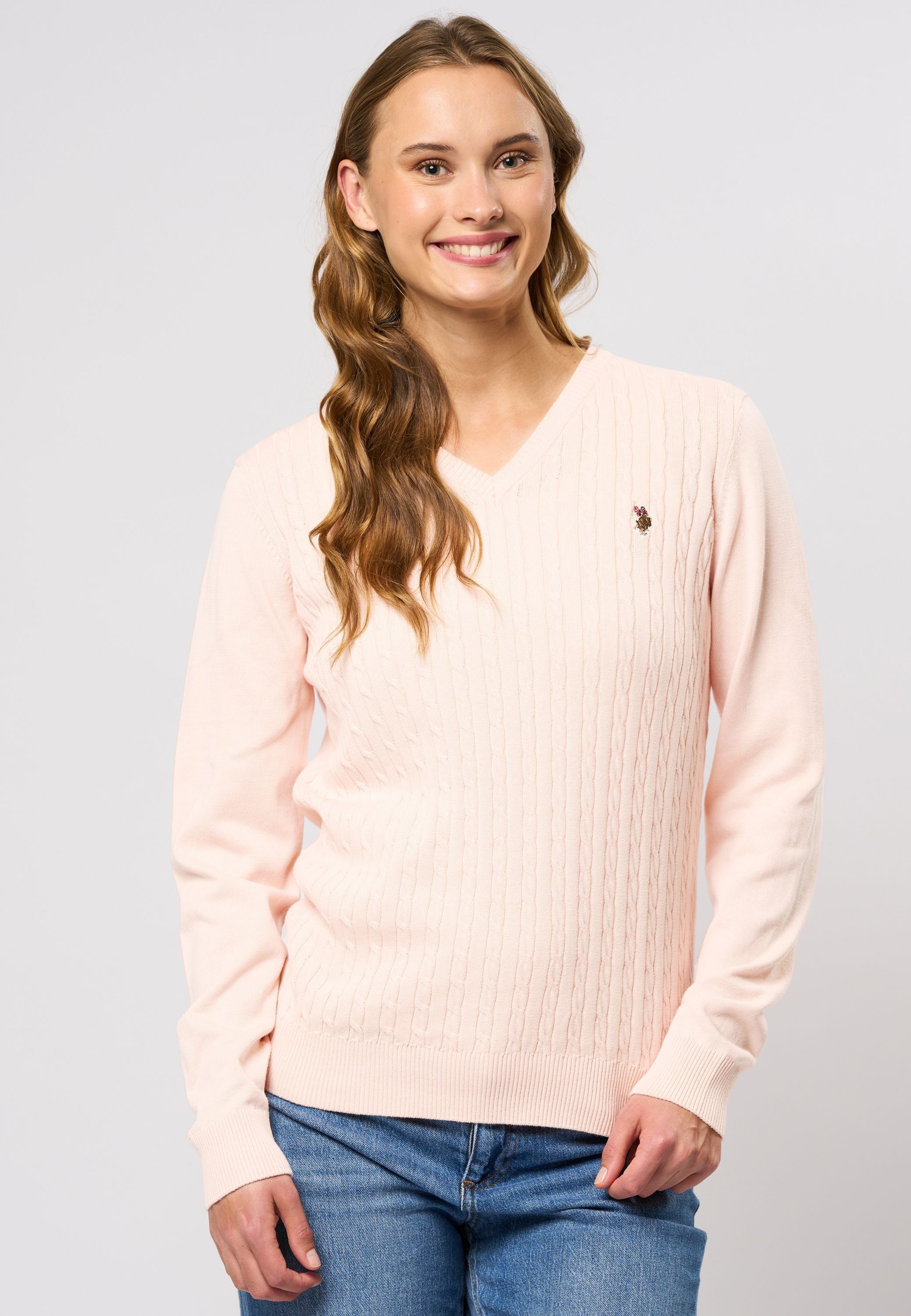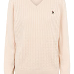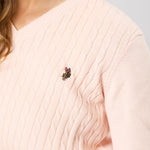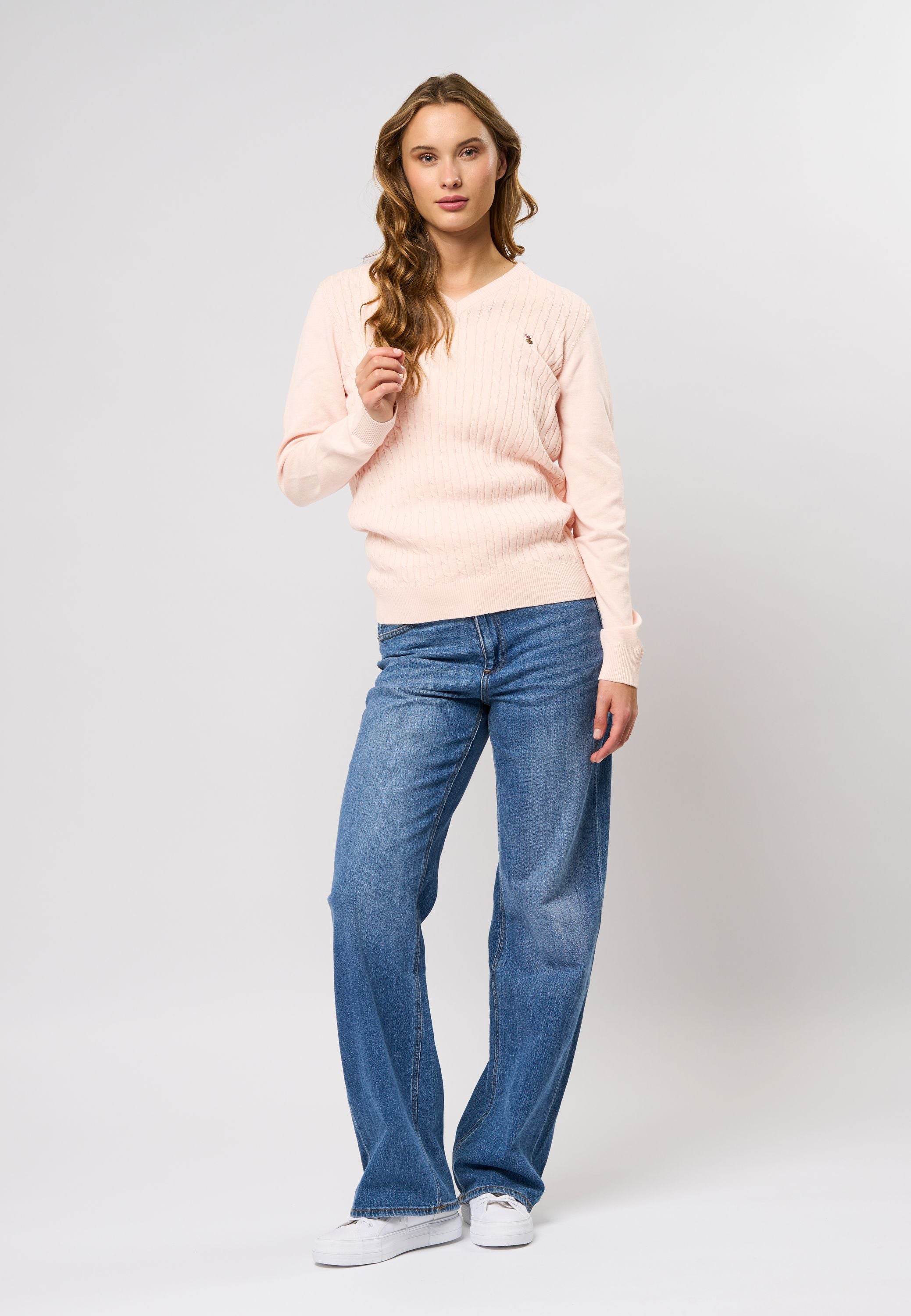 Bell är en snygg kabelstickad tröja med V-ringning. Den har en klassisk och formell look och passar perfekt till att ha över en skjorta för en snygg vardagslook. Bell har ribbstickning på både ärmar och midjan. Den har vår logotyp broderad på bröstet för en klassisk pololook.