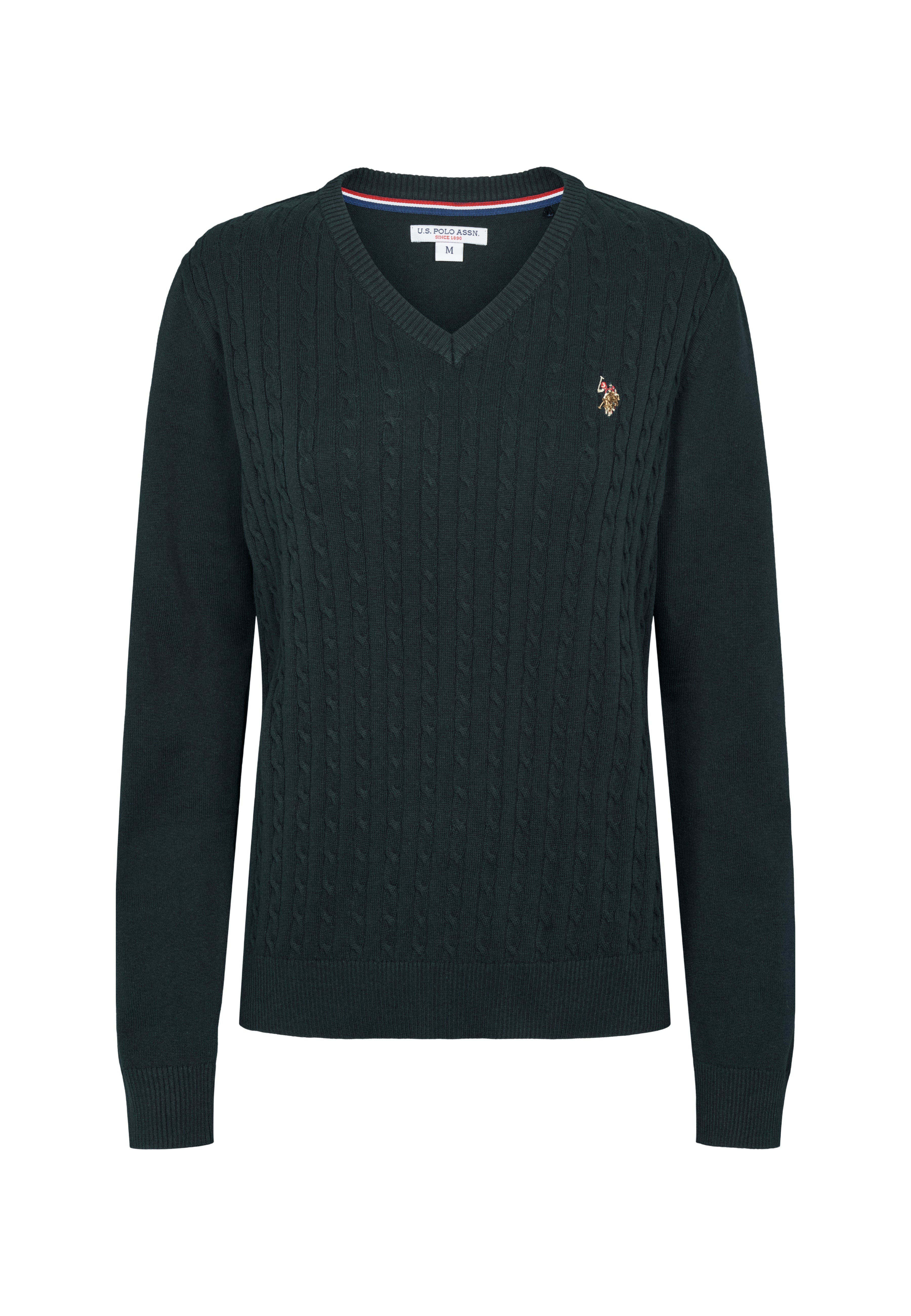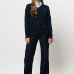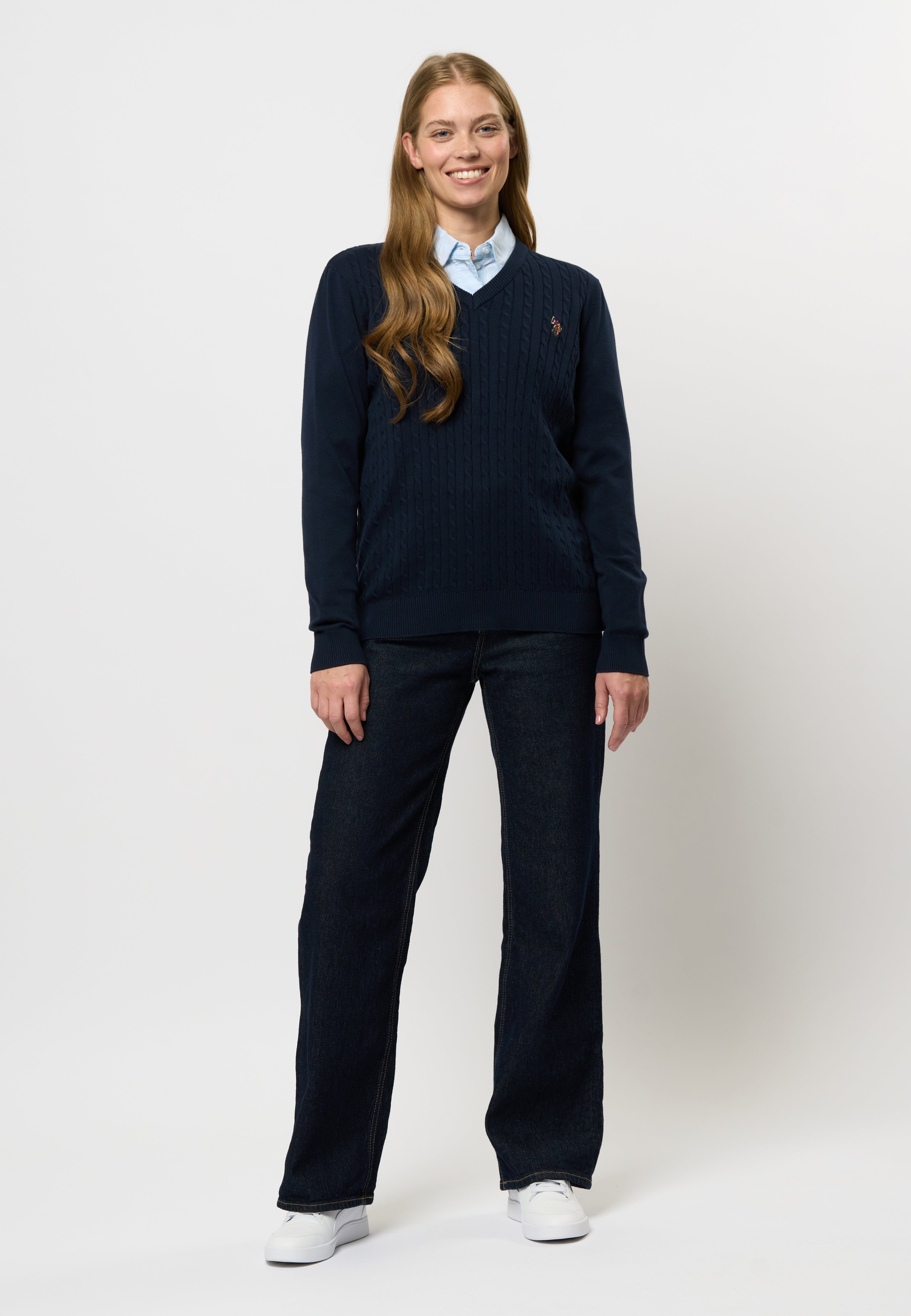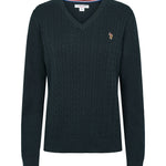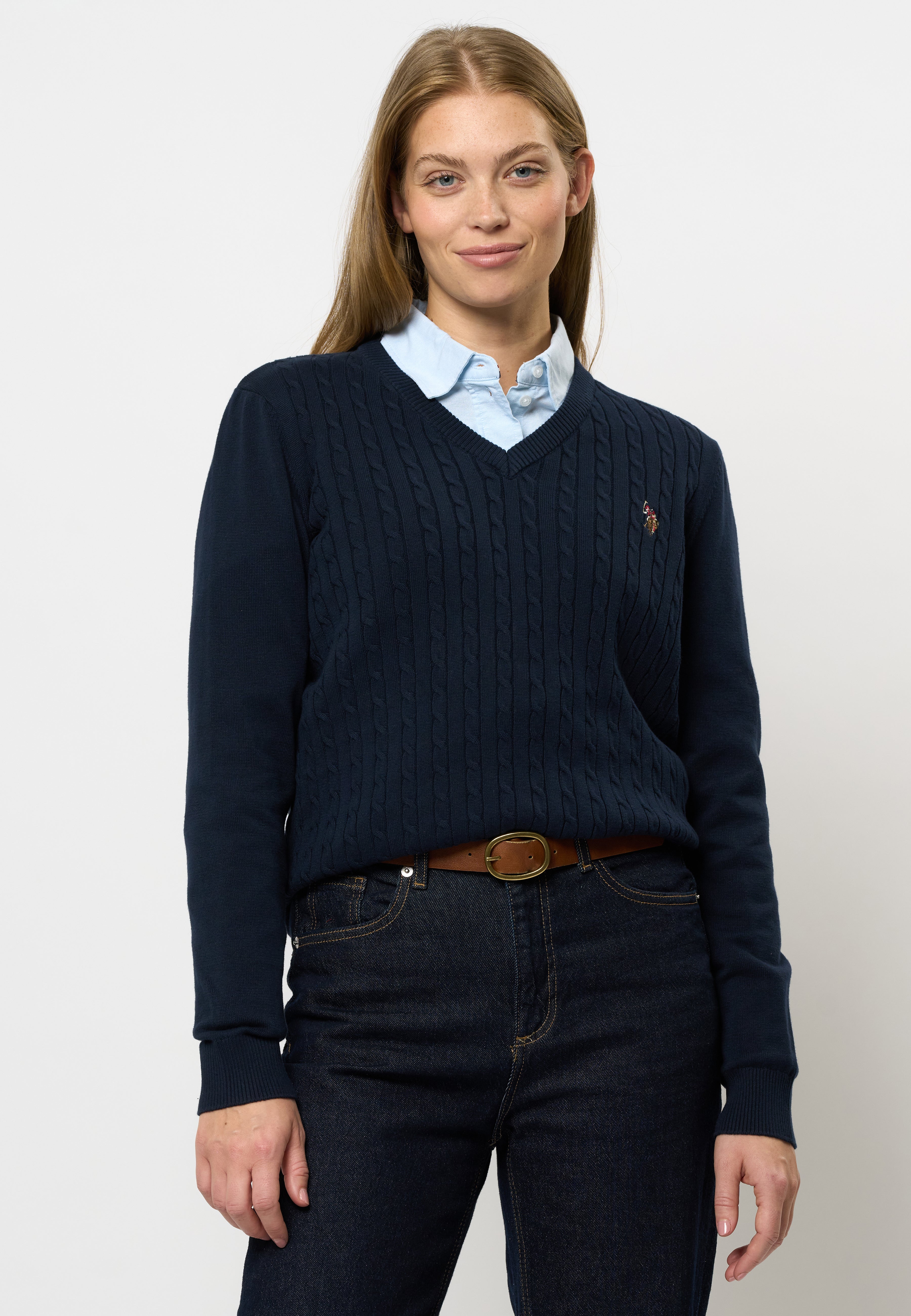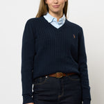 Bell är en snygg kabelstickad med V-ringning. Den har en klassisk och formell look och är perfekt att styla över en skjorta för en snygg vardagslook. Bell har ribb i både ärmar och nederkant. Den har vår logotyp broderad på bröstet för den klassiska pololooken