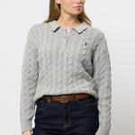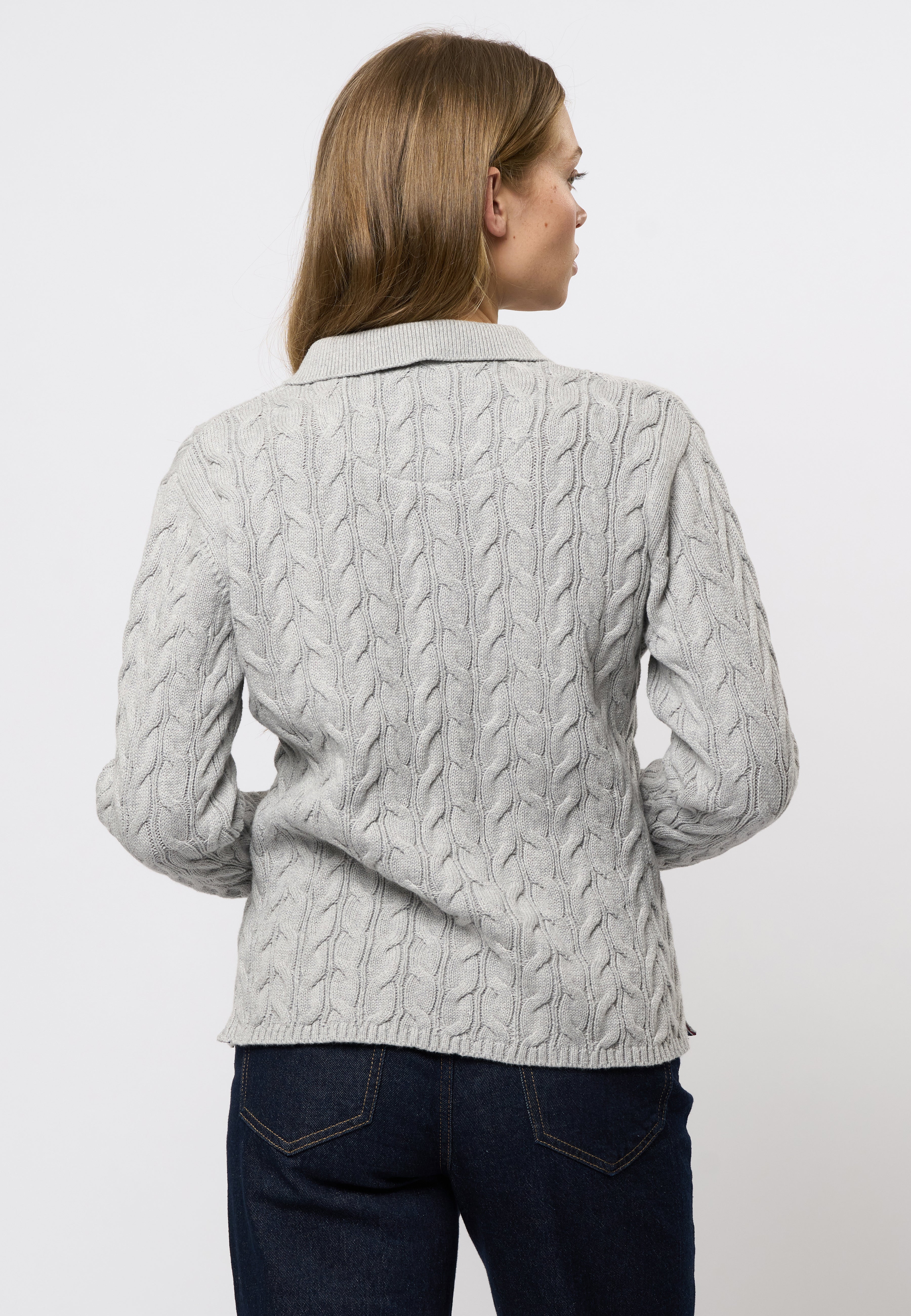 Karin är en klassisk kabelstickad med polokrage och knappstängning – en avslappnad och stilren vardagsfavorit. Tröjan har ribb i ärmslut och nederkant, vilket säkerställer en bra passform, medan den broderade loggan på bröstet ger en diskret sportig touch. Lätt att styla med allt från jeans till kjolar – både till jobbet och helgen.
