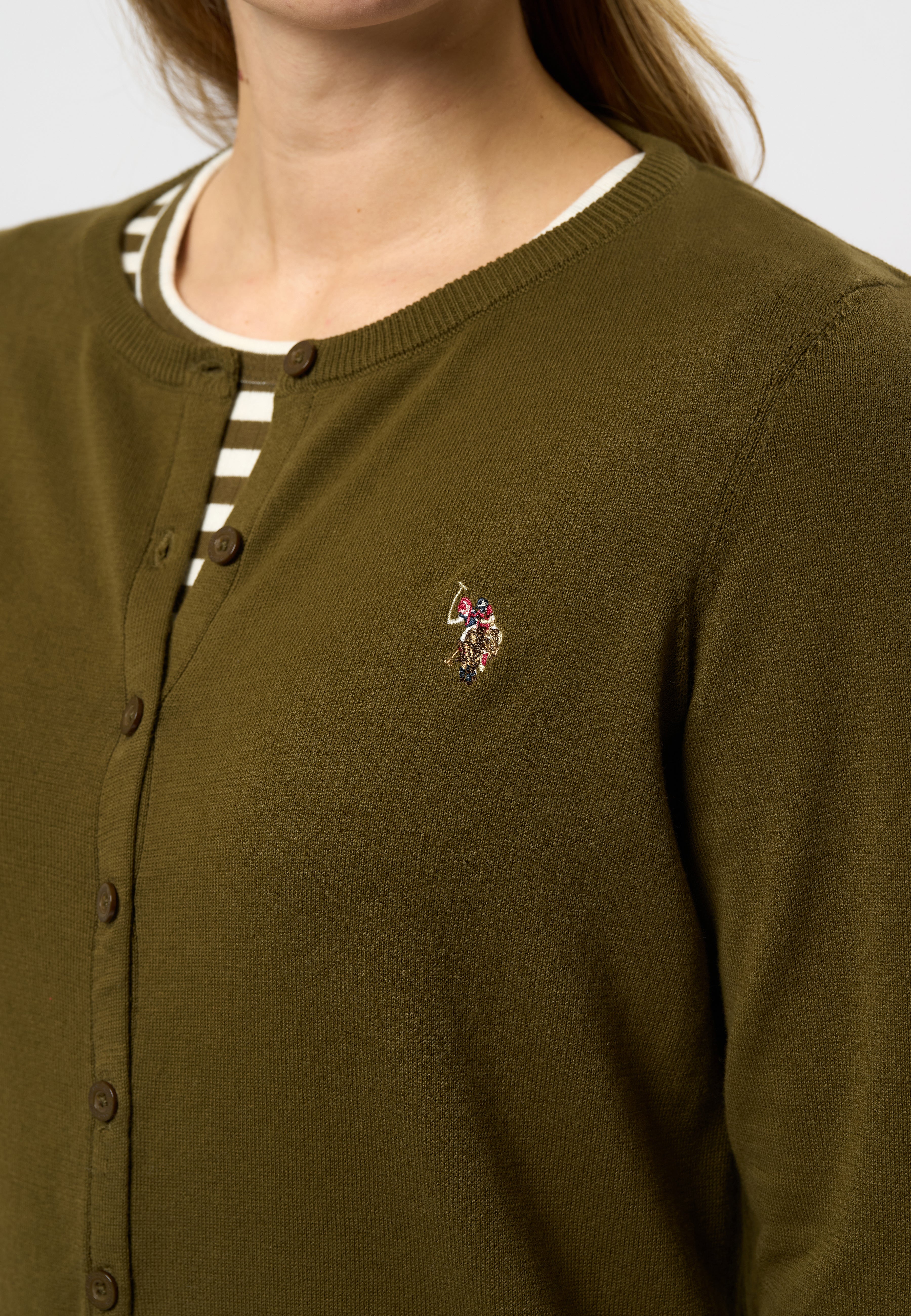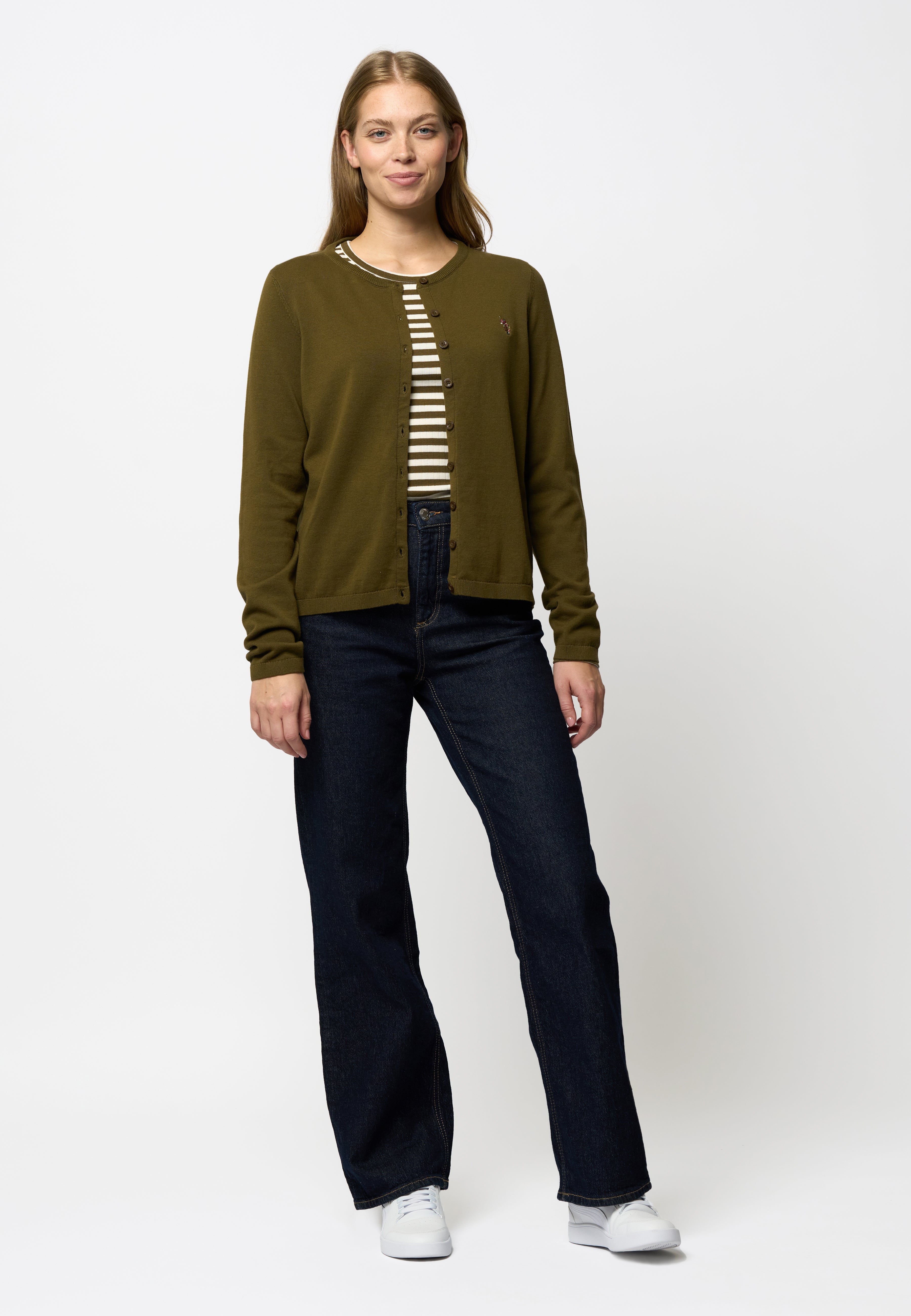 Kimmi är en klassisk cardigan med ett enkelt, feminint uttryck. Den har en fin och lätt kvalitet, rund halsringning och en elegant knäppning framtill. Cardiganen pryds av en diskret, broderad logga på bröstet, och den bekväma passformen gör den perfekt som ett lätt plagg både till vardags och på kontoret. Bär den öppen över en topp eller stängd för en mer stilren look.