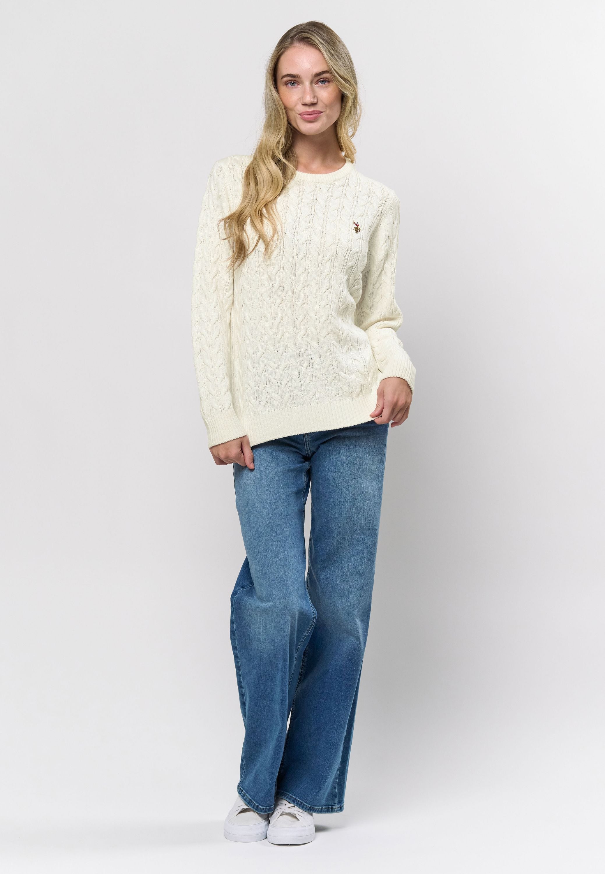 Madeline är en klassisk kabelstickad med rund hals och ett stilrent, tidlöst uttryck. Den har en normal passform och är avslutad med ribb i botten och ärmar för en snygg finish. Den broderade logotypen på bröstet ger en sportig touch och framhäver märkets signaturstil. Lätt att styla för både vardag och trevligare tillfällen.