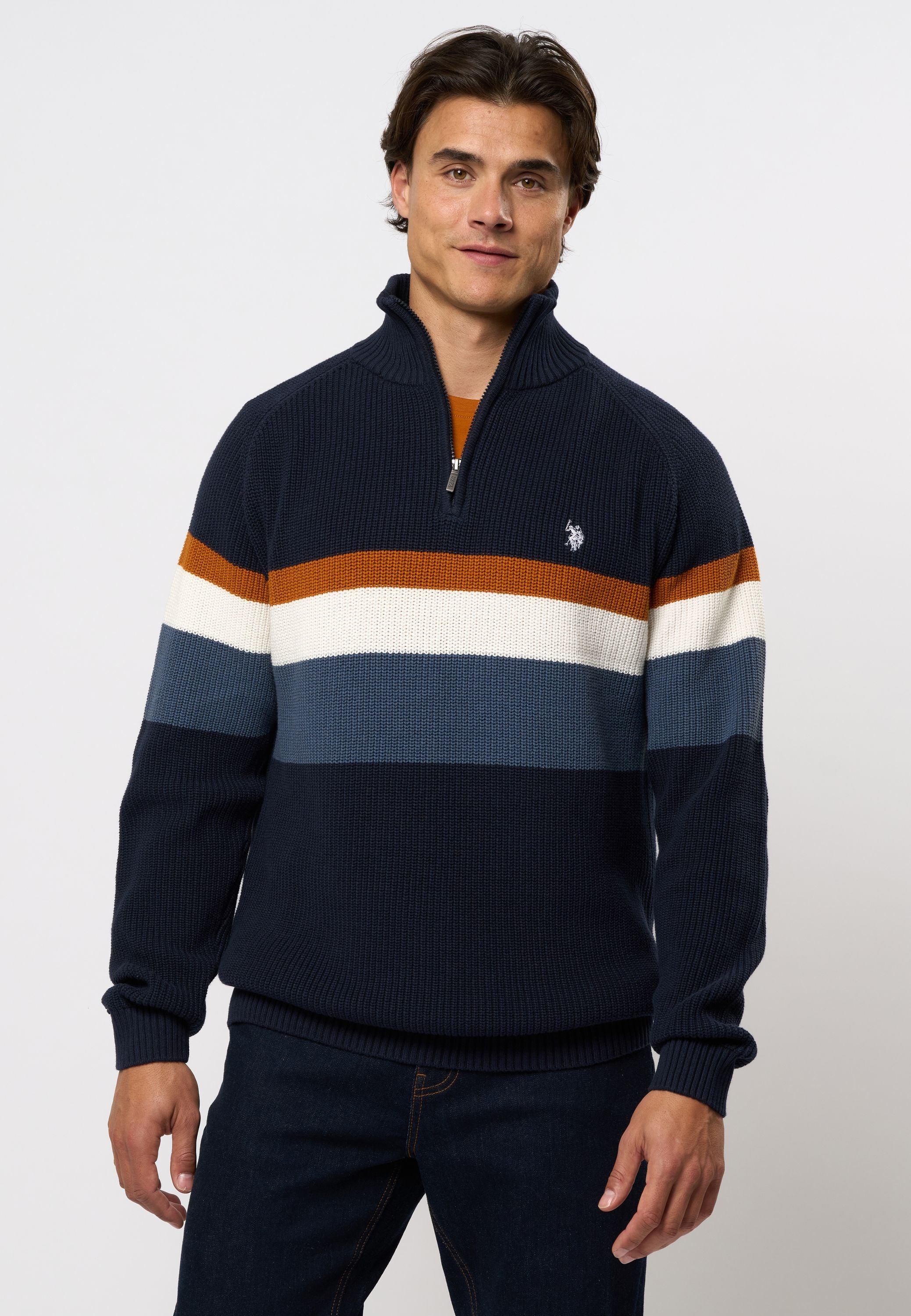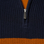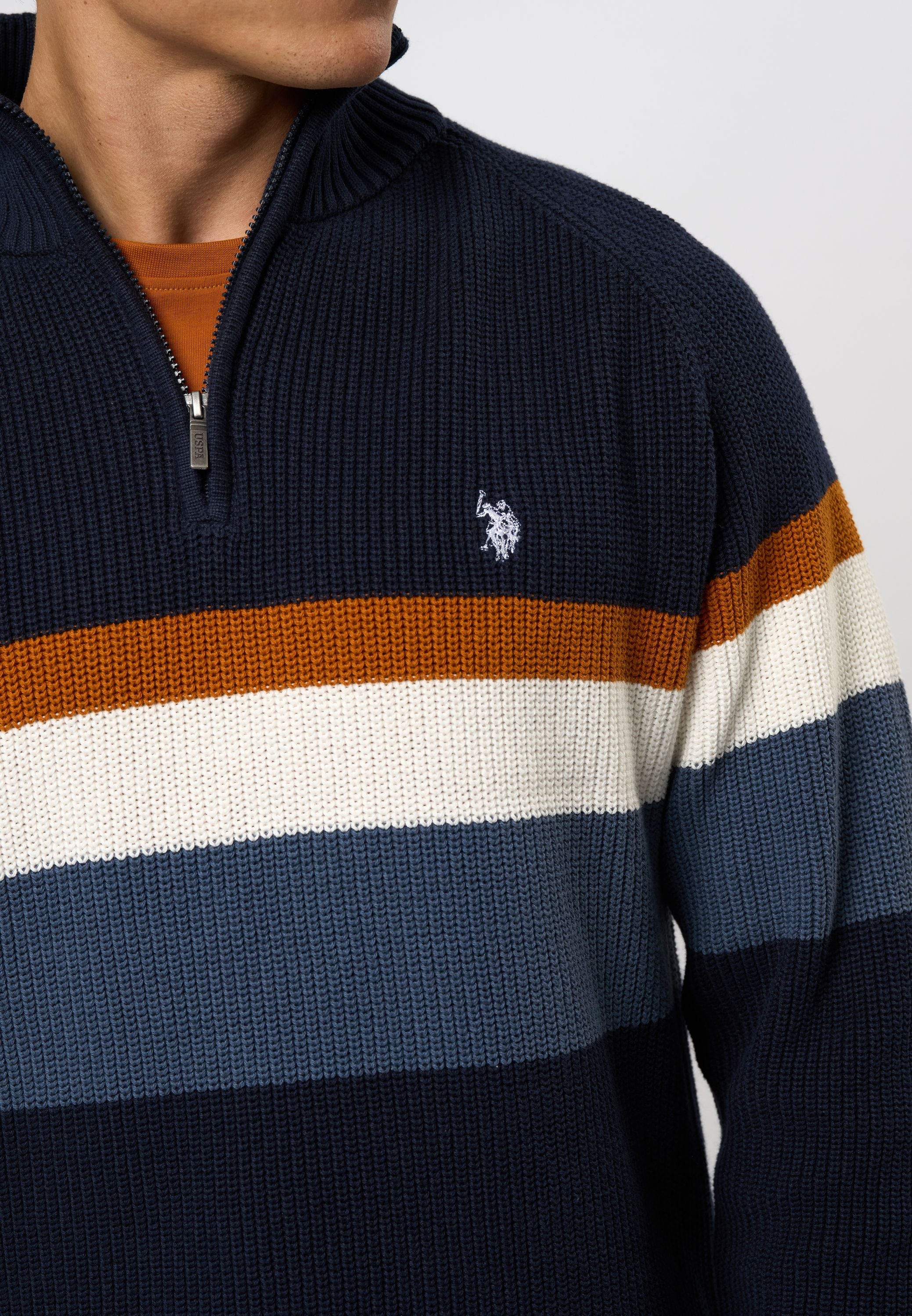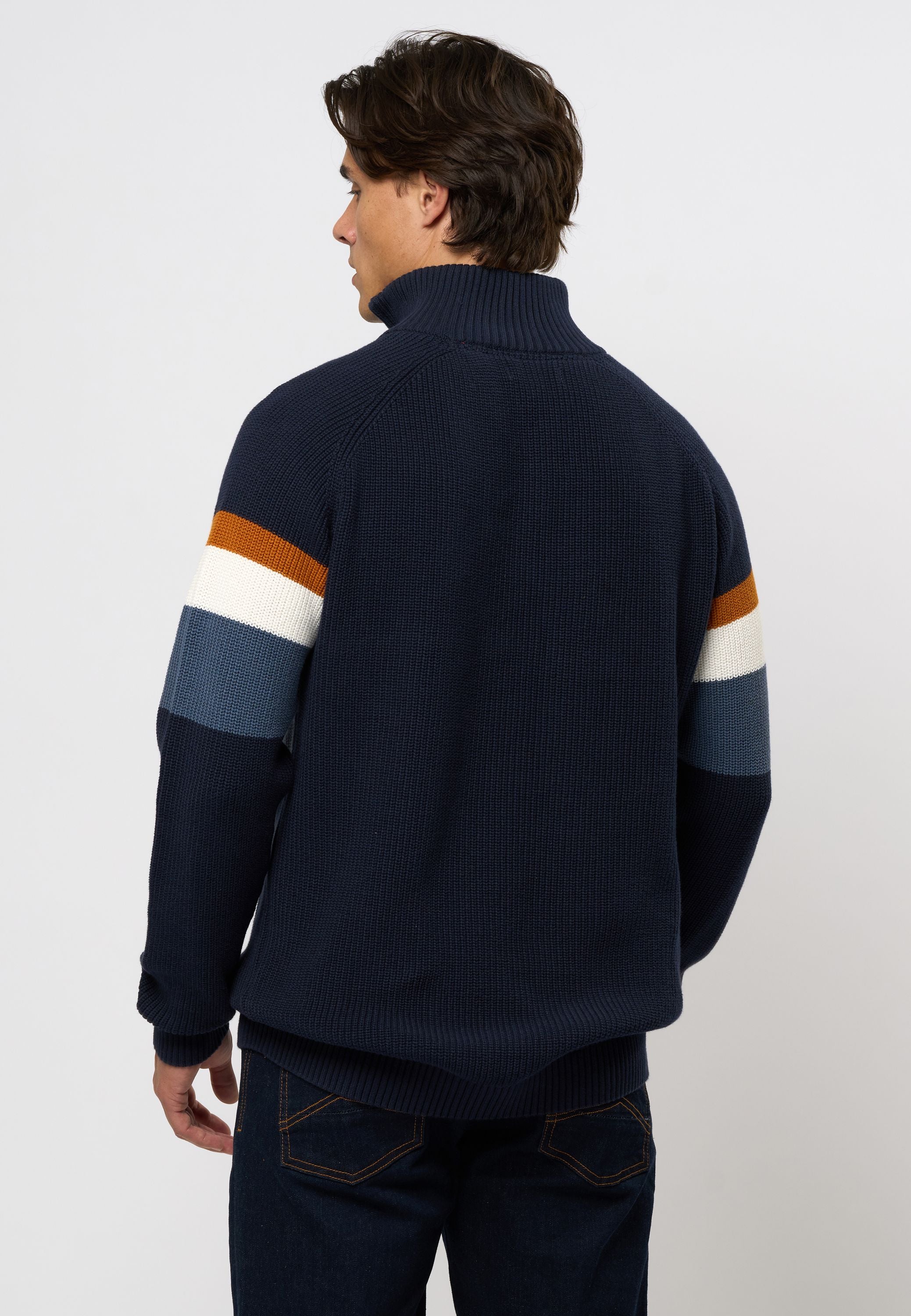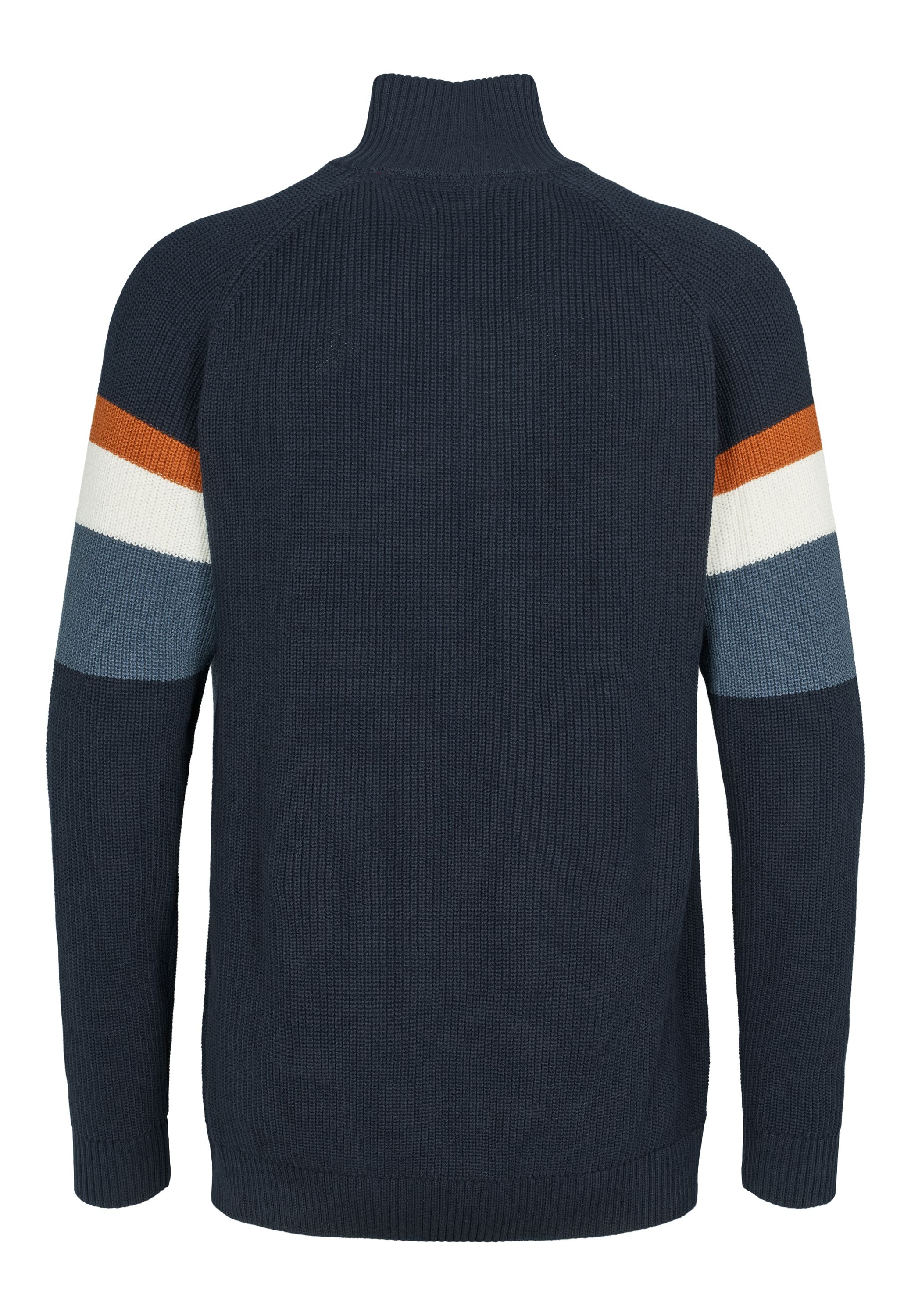 Ricco är en stickad tröja med sportiga ränder och en avslappnad stil. Den har hög krage med dragkedja och är gjord i en kraftig ribbkvalitet som håller formen bra. Ribbade kanter och en broderad logga på bröstet fulländar designen. Perfekt för både vardag och lediga dagar.
