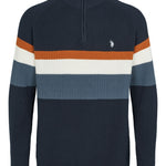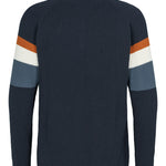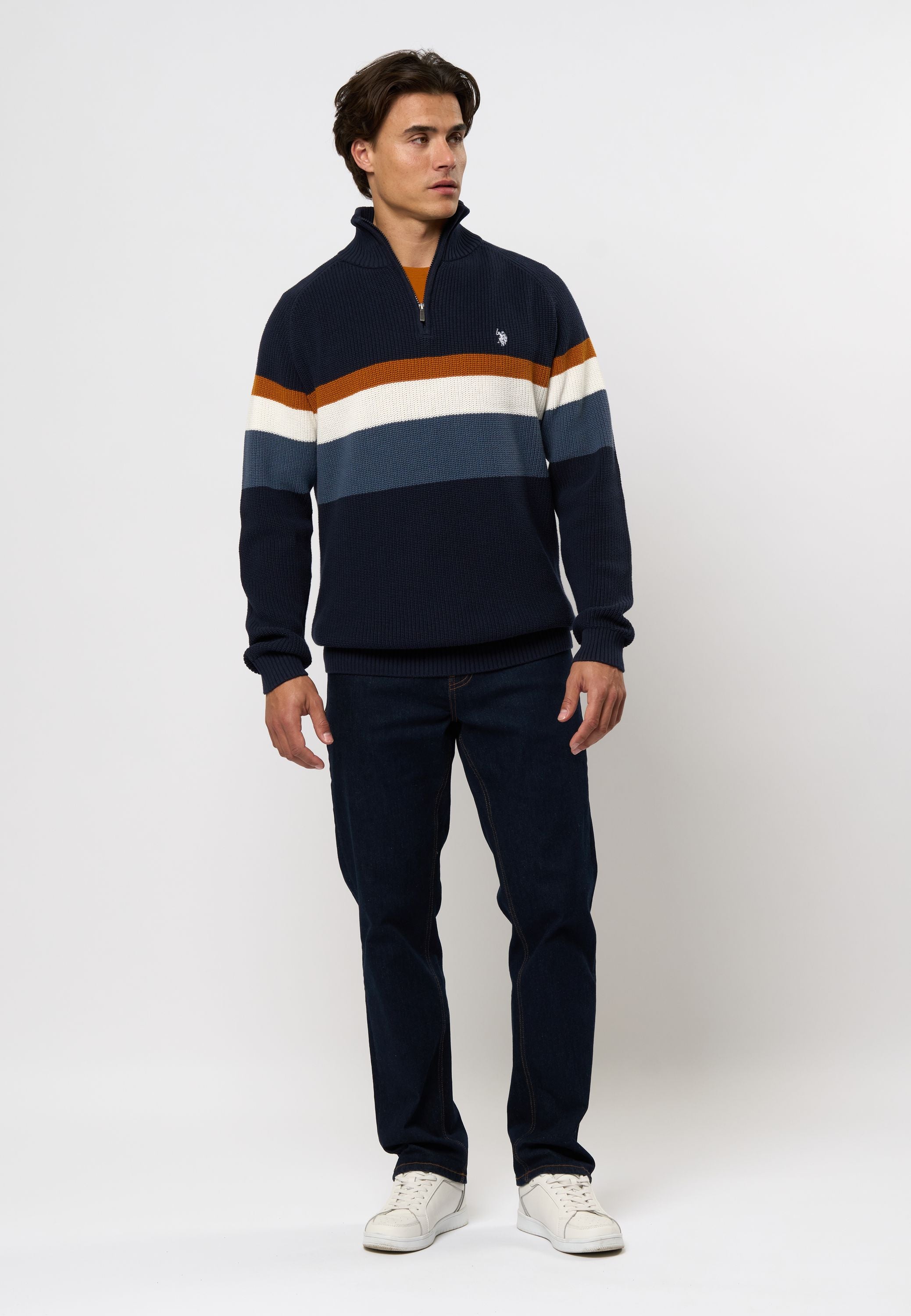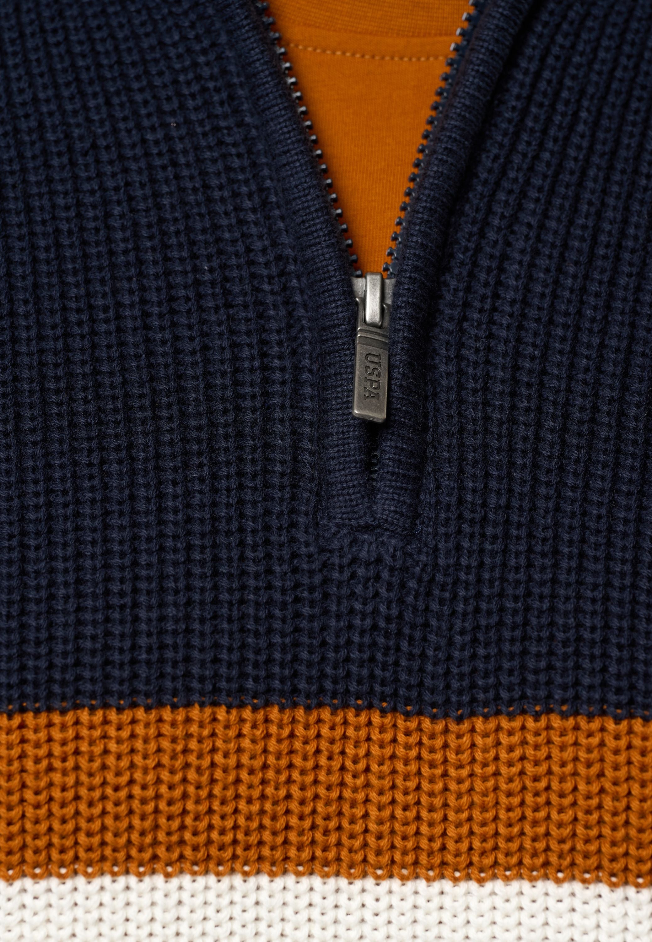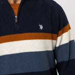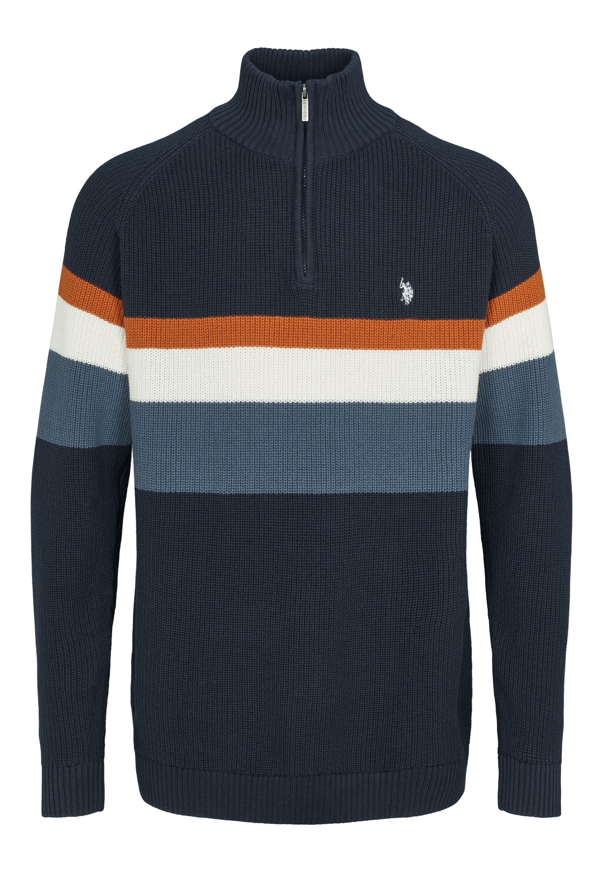Ricco är en stickad tröja med sportiga ränder och en avslappnad stil. Den har hög krage med dragkedja och är gjord i en kraftig ribbkvalitet som håller formen bra. Ribbade kanter och en broderad logga på bröstet fulländar designen. Perfekt för både vardag och lediga dagar.