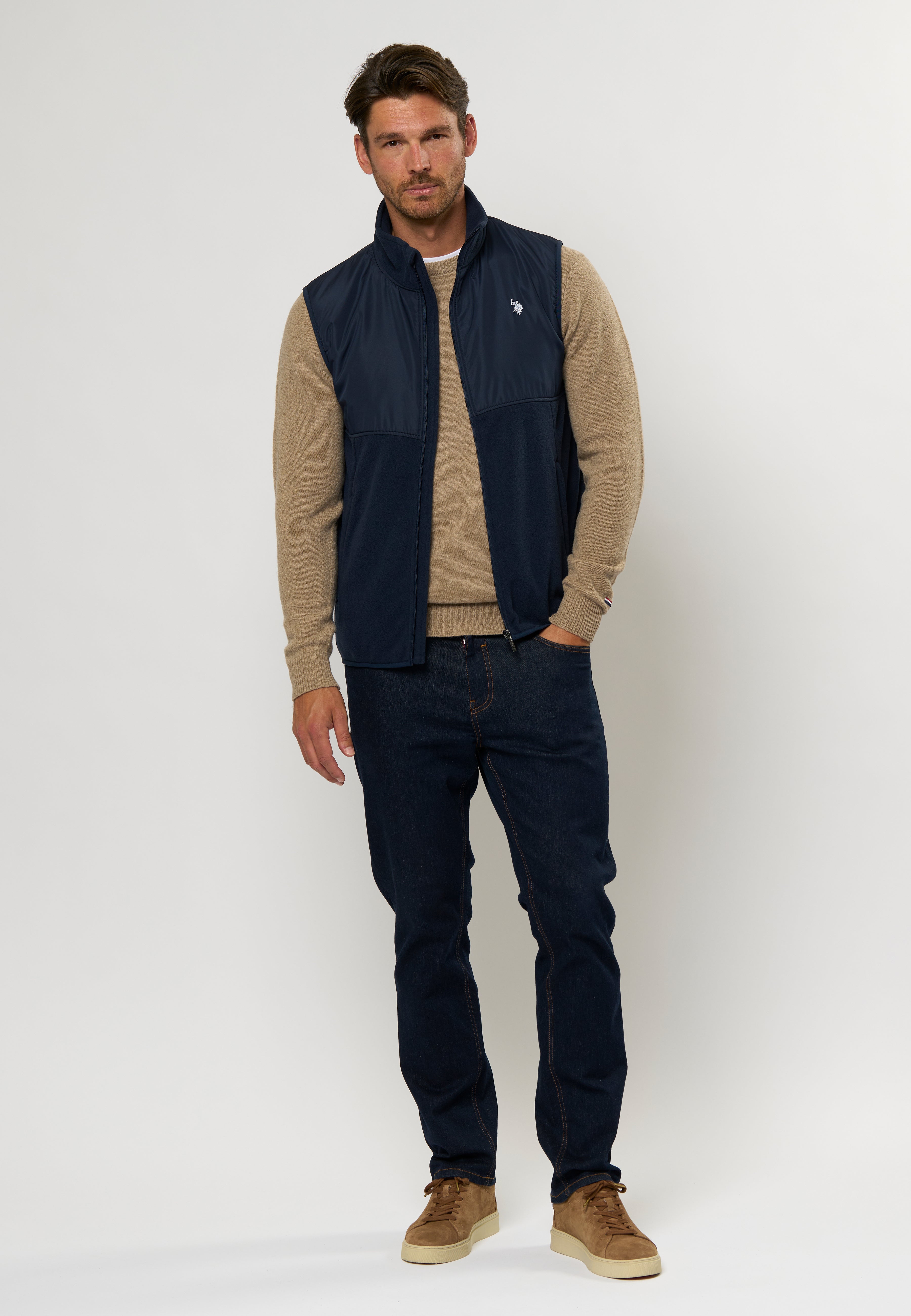 Bera är en mjuk och bekväm fleeceväst med hög krage och en sportig touch. Den övre delen av västen är förstärkt med ett slätt parti, vilket ger både visuell kontrast och extra slitstyrka vid axlar och bröst. Fleece-materialet känns lätt mot kroppen och håller effektivt kvar värmen – perfekt för lager på lager eller som lätt jacka i milt väder. Den har två diskreta sidfickor och en genomgående dragkedja framtill. Logotypen på bröstet tillför en klassisk finish.