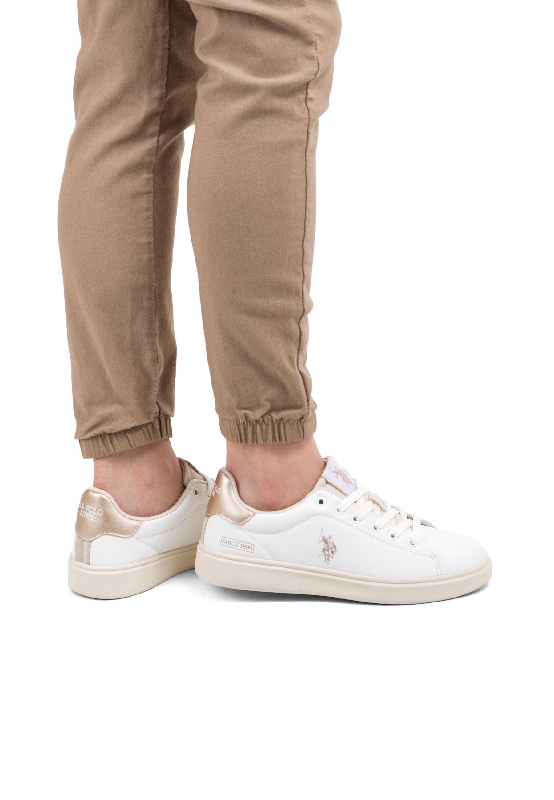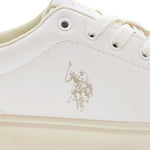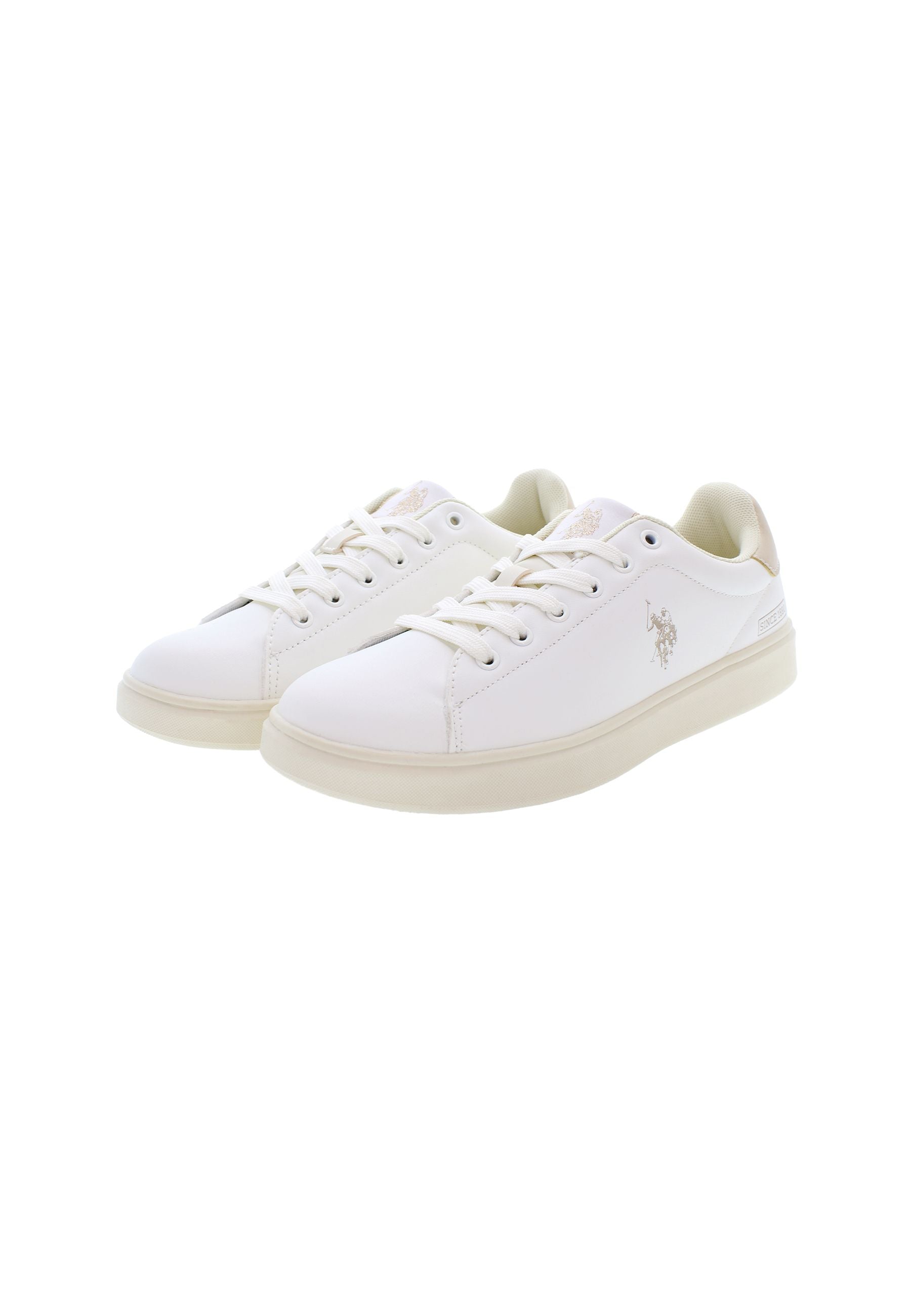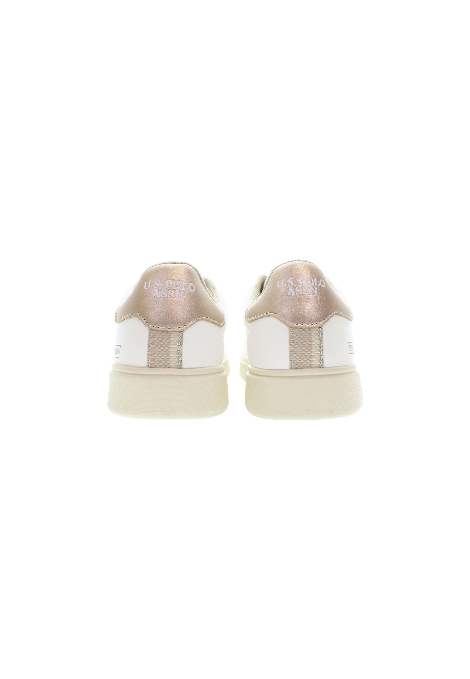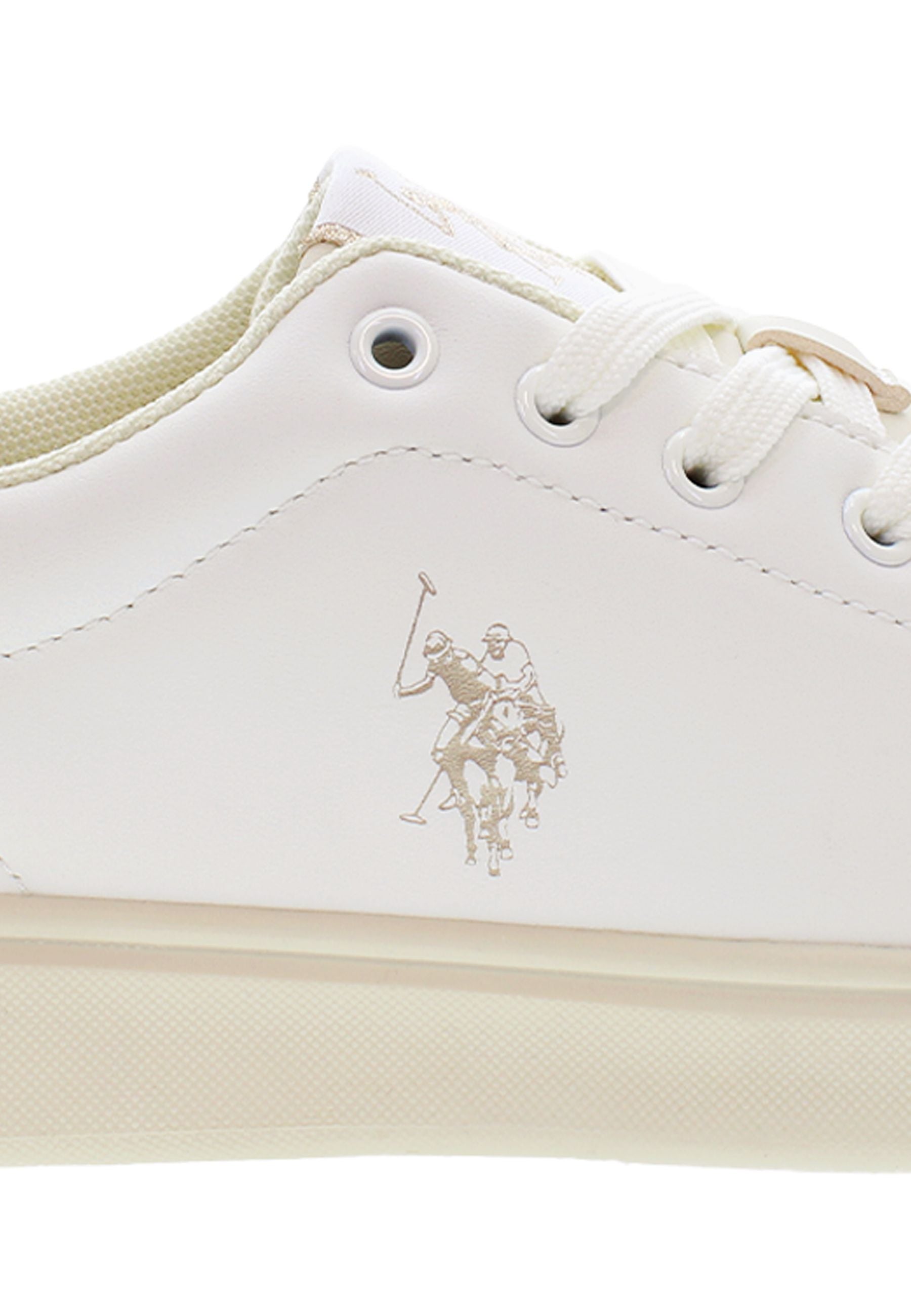 Marlyn är en klassisk vit sneaker med snygga detaljer i guld. Den har lätt vaddering runt hälen och fotleden, vilket säkerställer en bekväm passform hela dagen. På utsidan är skon dekorerad med den ikoniska U.S. Polo Assn. logotyp i guld, och på baksidan syns en snygg kontrastrand i marinblått och rött. Innersulan är lila med rosa märke, vilket ger en fräsch touch till den enkla designen. En snygg och bekväm sneaker som passar både till vardags och vardagligt.