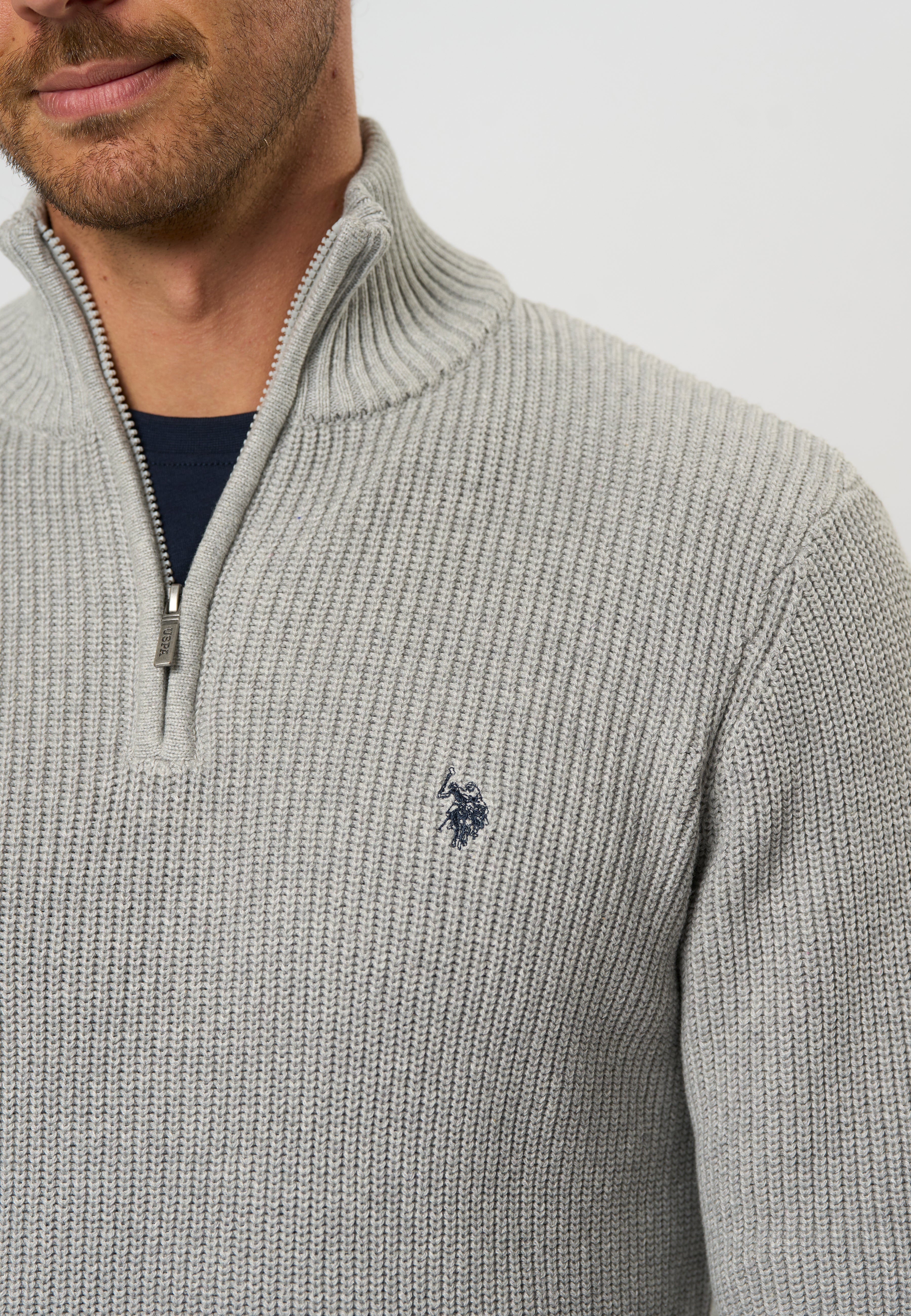 Rafael är en tjockare stickad tröja med en tydlig struktur i en avslappnad men elegant design. Tröjan har en hög krage med halv dragkedja och ribbade kanter för en perfekt passform. En liten broderad logotyp på bröstet fulländar den stilrena looken. Bär den som ett varmt lager över en skjorta eller under en jacka på kalla dagar.