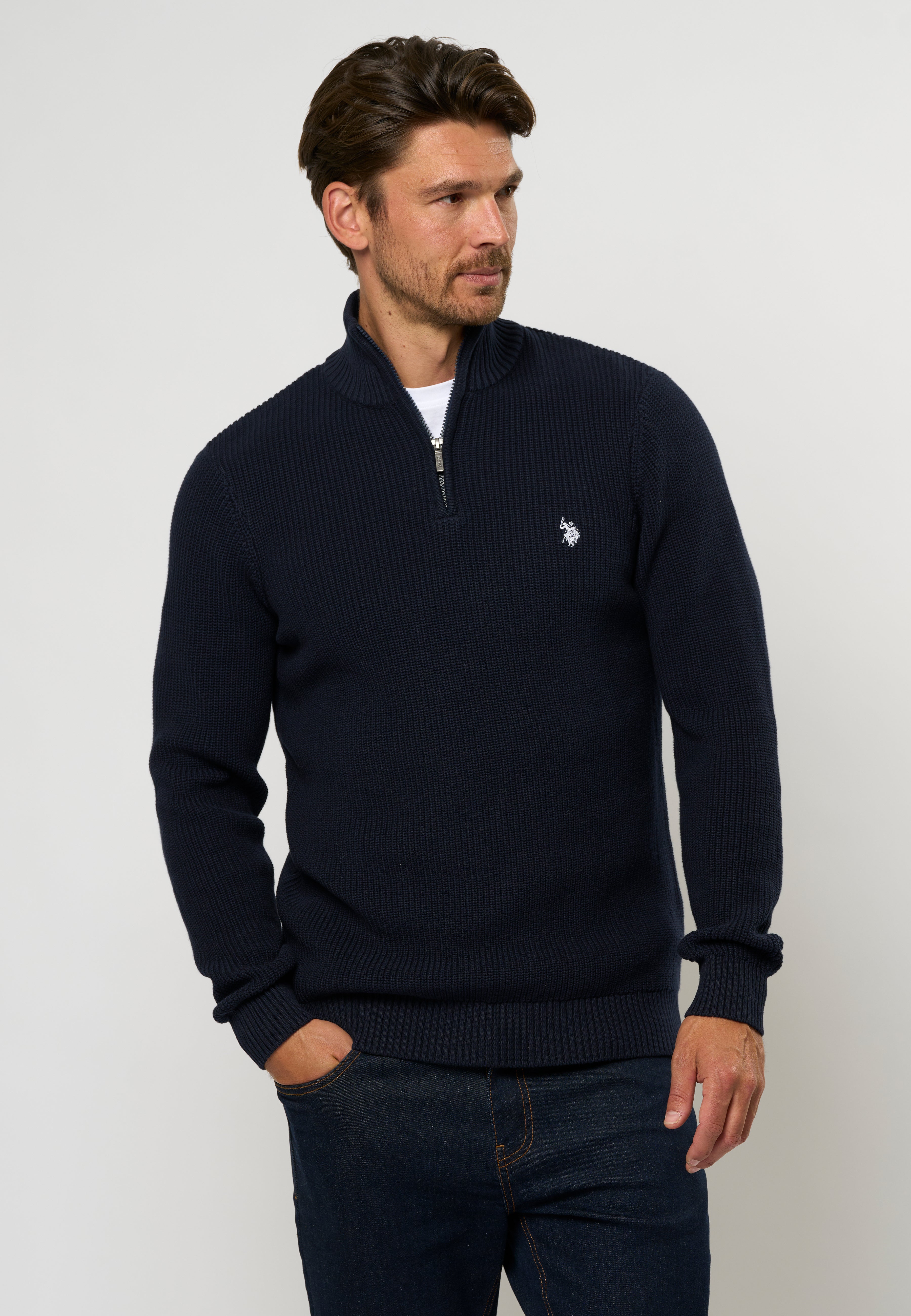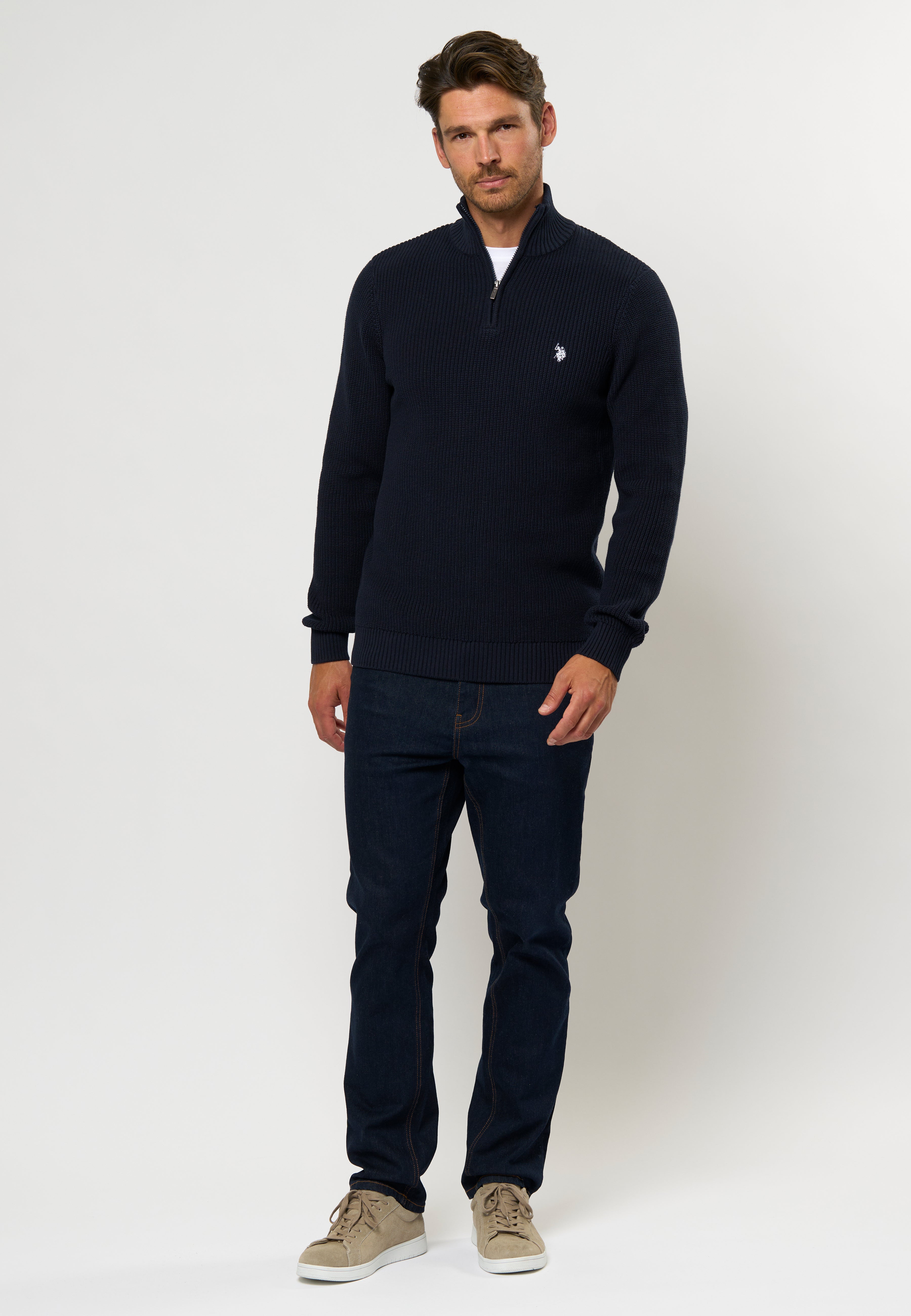 Rafael är en tjockare stickad tröja med en tydlig struktur i en avslappnad men elegant design. Tröjan har en hög krage med halv dragkedja och ribbade kanter för en perfekt passform. En liten broderad logotyp på bröstet fulländar den stilrena looken. Bär den som ett varmt lager över en skjorta eller under en jacka på kalla dagar.