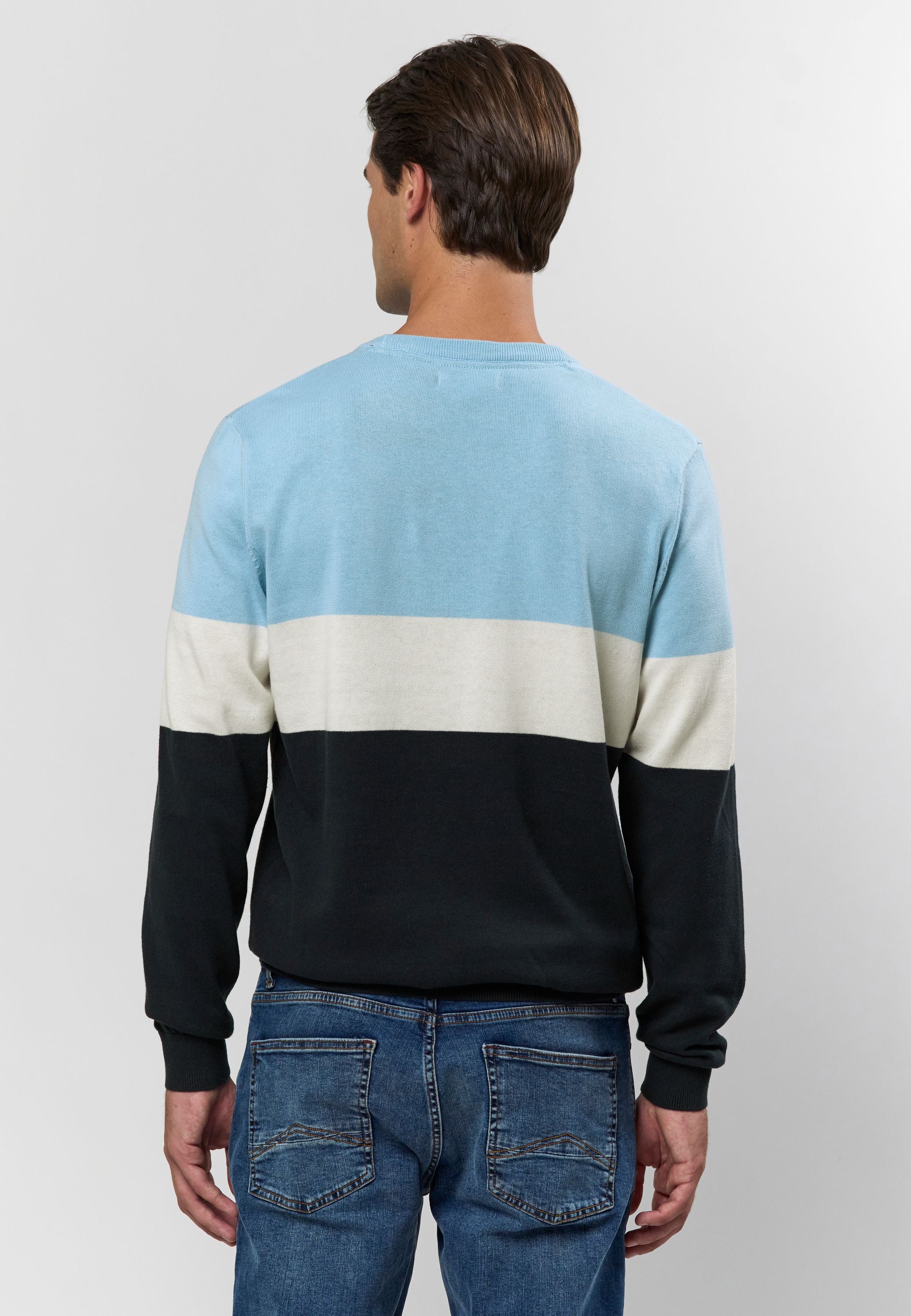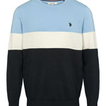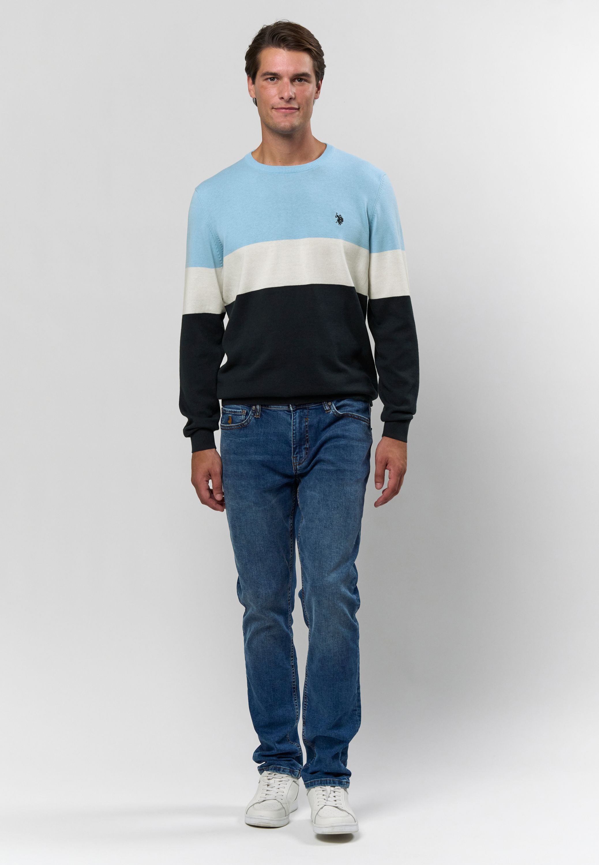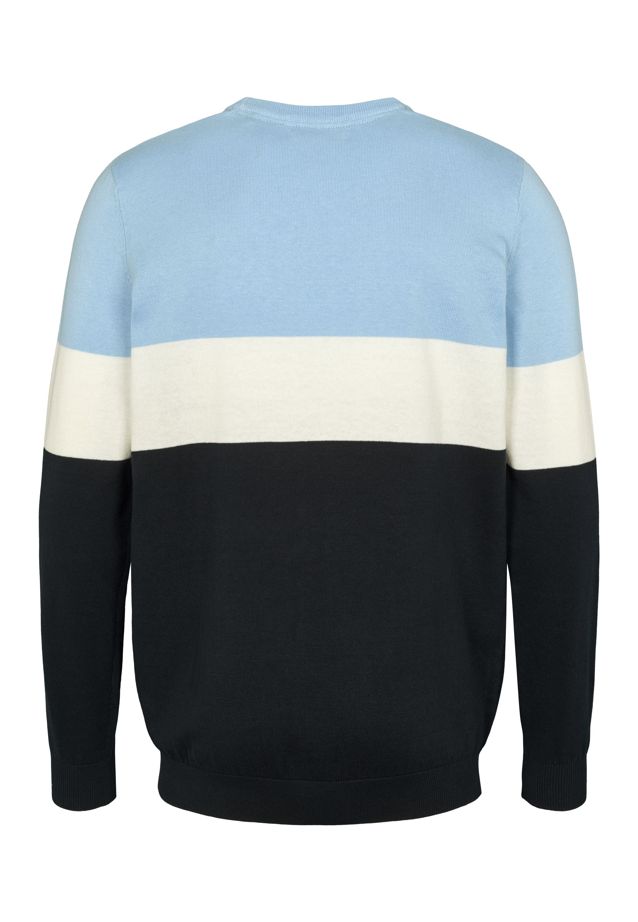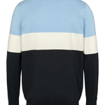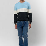 Rene är en klassisk stickad tröja med moderna färgblock i ljusblått, vitt och marinblått. Den rena runda halsen och den broderade logotypen på bröstet ger en tidlös, sportig look, medan den mjuka bomullskvaliteten garanterar komfort hela dagen. En mångsidig sticka som kan stylas både för en avslappnad look och för en mer polerad vardagsgarderob.