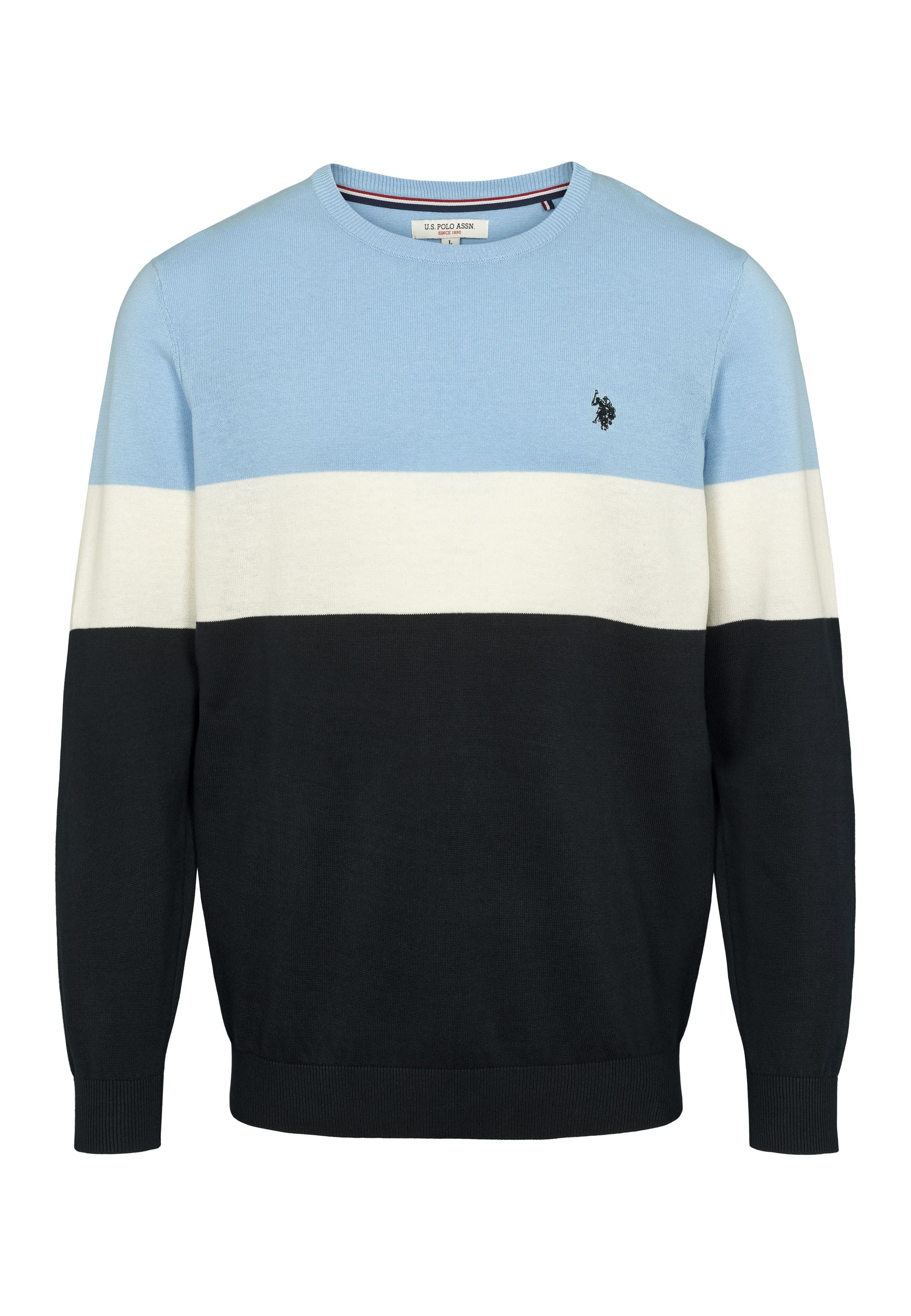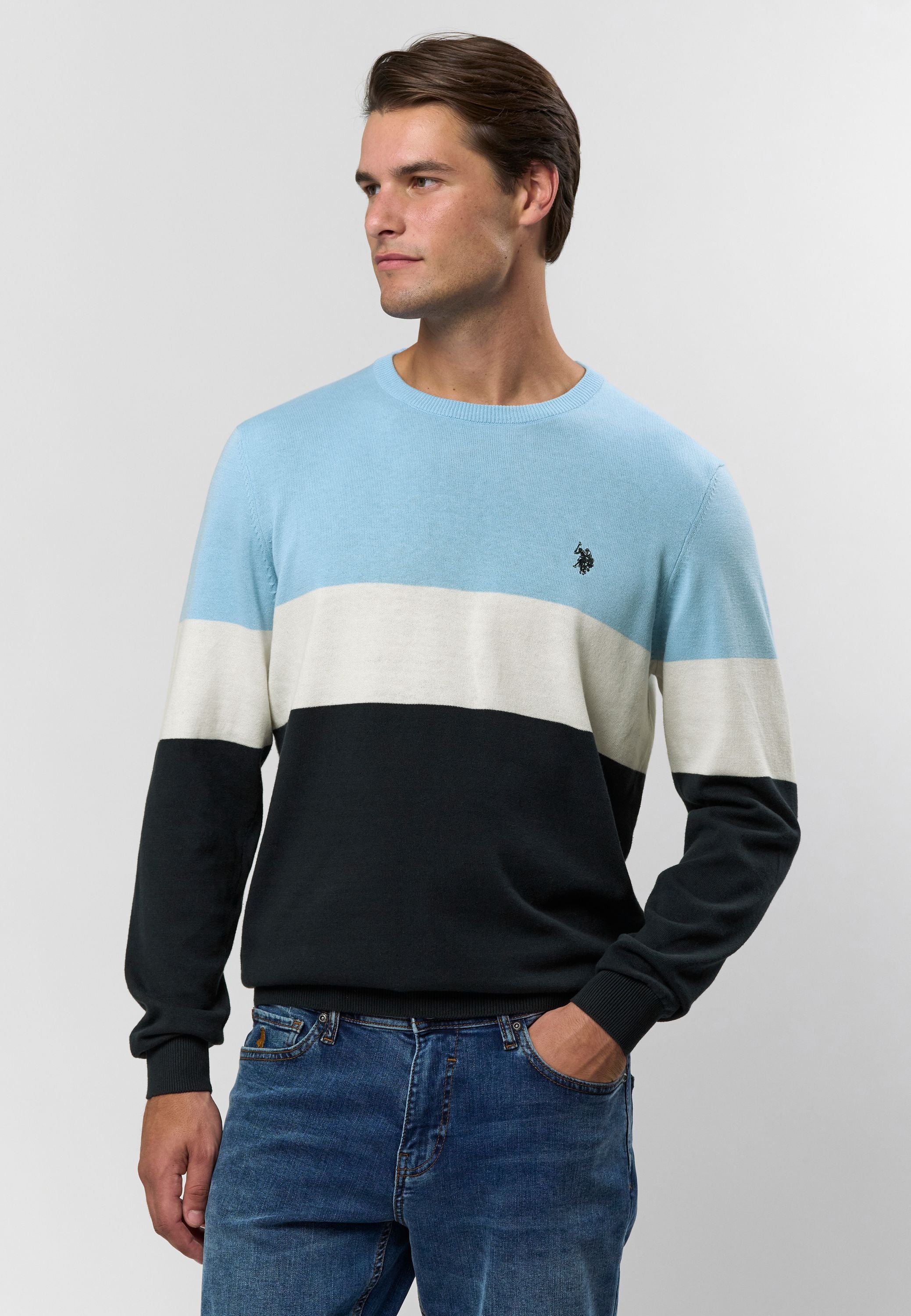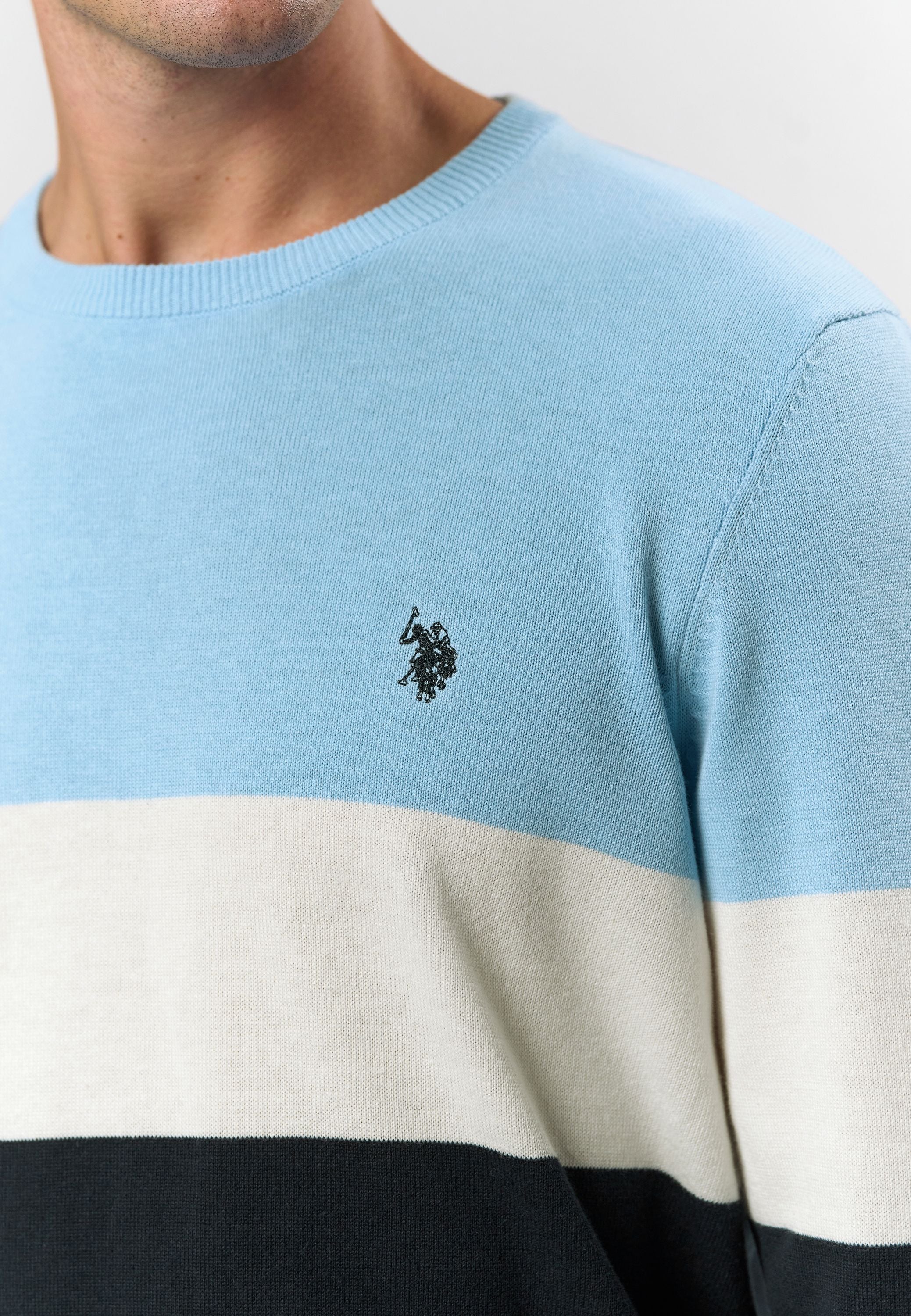Rene är en klassisk stickad tröja med moderna färgblock i ljusblått, vitt och marinblått. Den rena runda halsen och den broderade logotypen på bröstet ger en tidlös, sportig look, medan den mjuka bomullskvaliteten garanterar komfort hela dagen. En mångsidig sticka som kan stylas både för en avslappnad look och för en mer polerad vardagsgarderob.