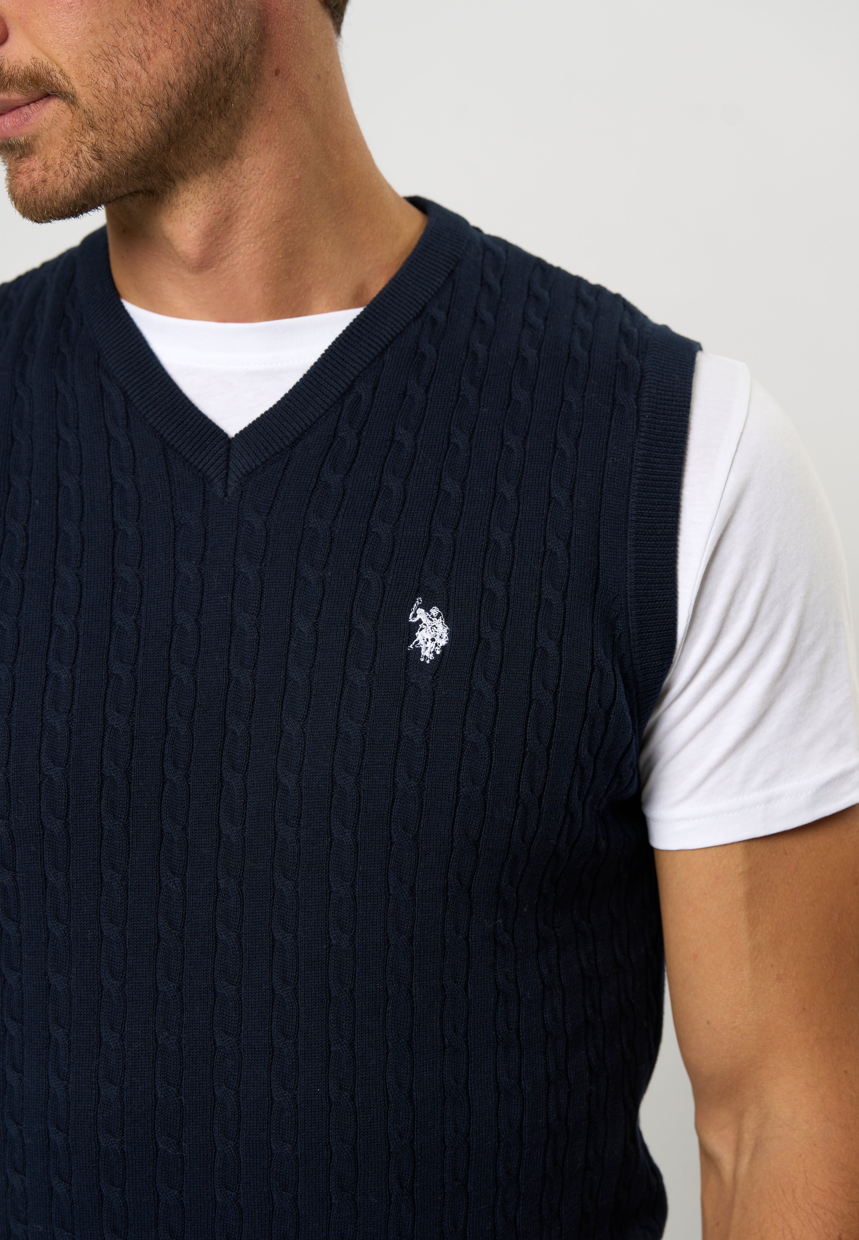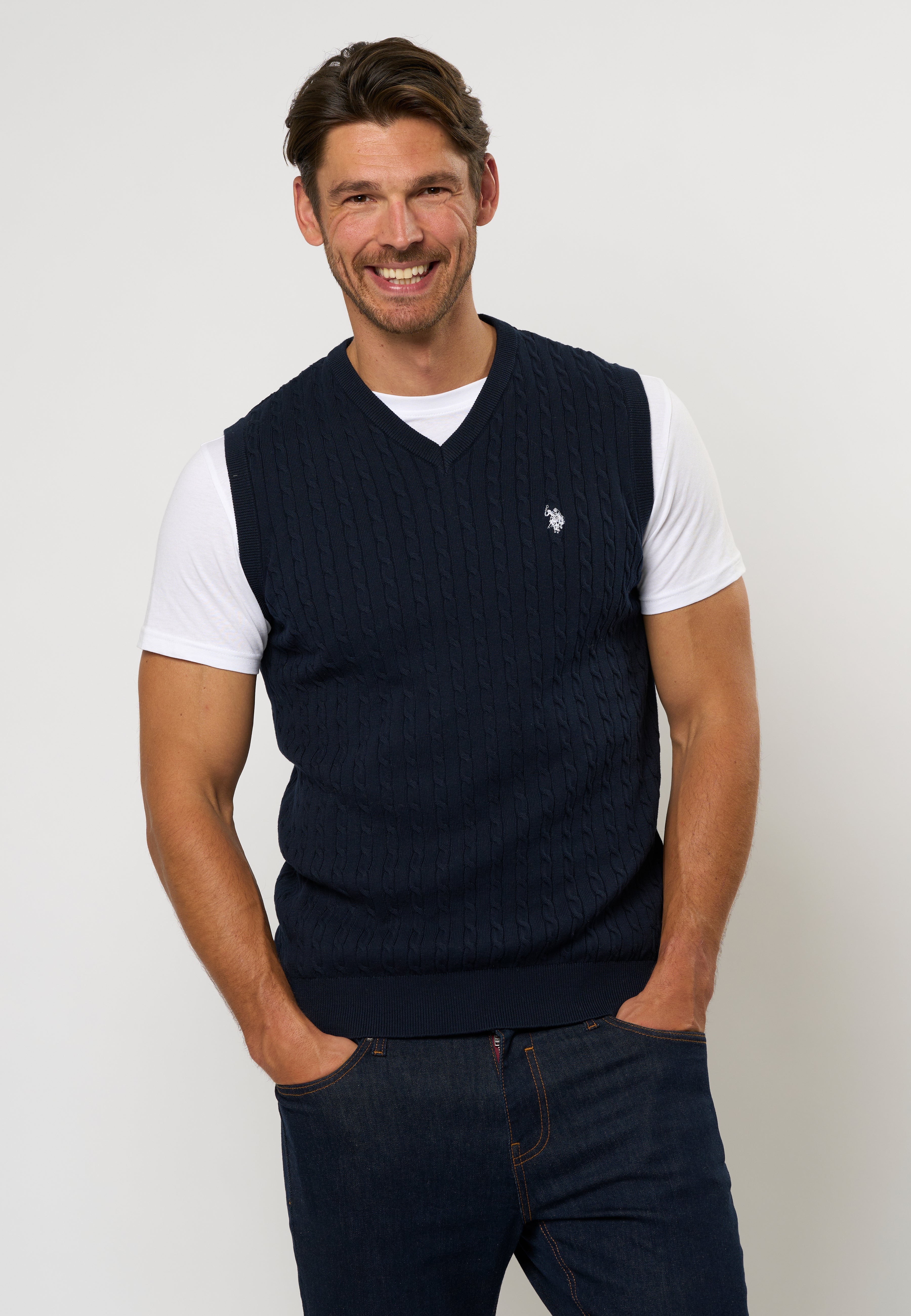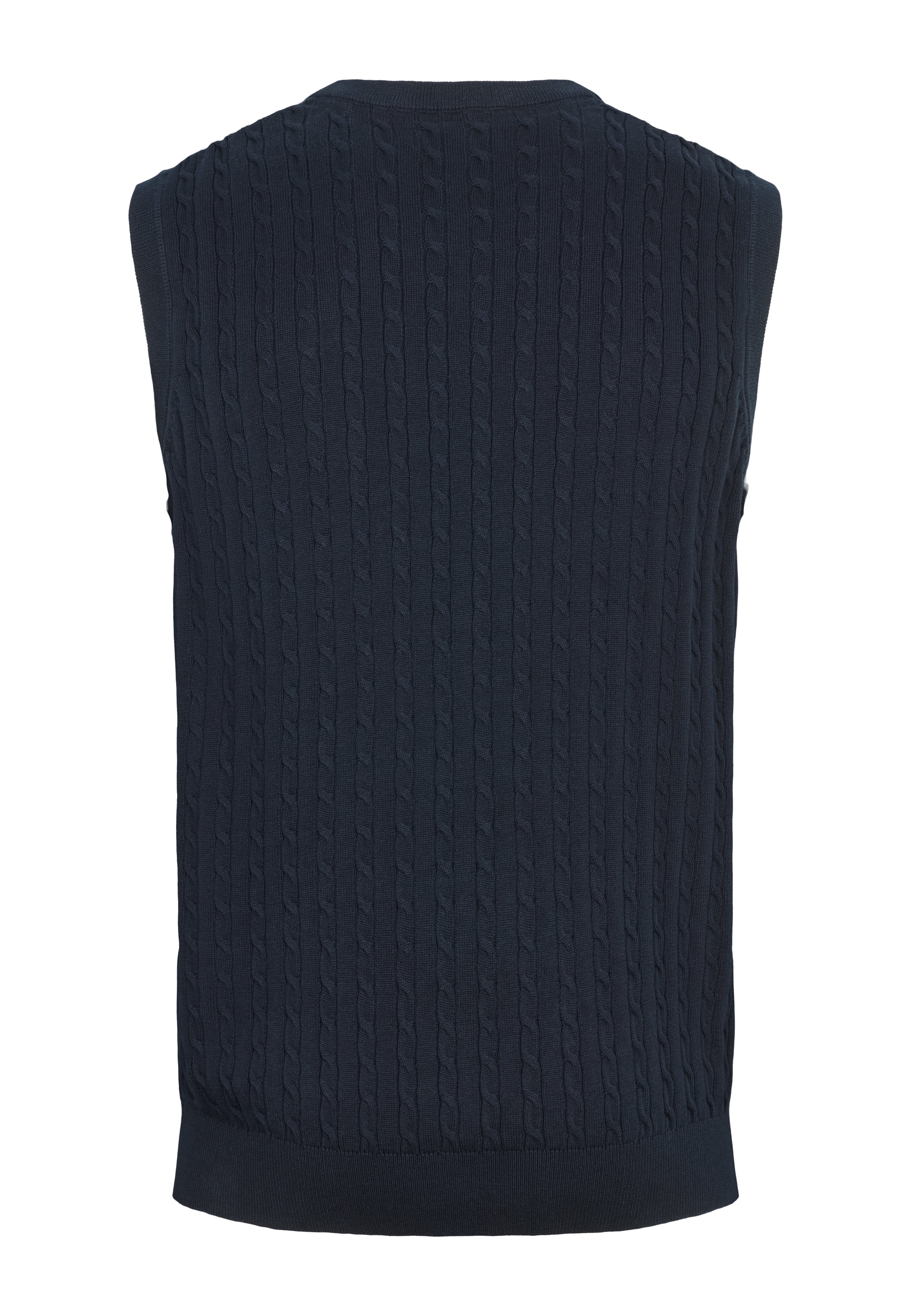 Samuel är en klassisk stickad väst med ett elegant och tidlöst uttryck. Det kabelstickade mönstret och den v-formade urringningen ger en välklädd look som fungerar både över skjortan och som ett lager ovanpå vardagen. Kvaliteten är mjuk och skön och har en naturlig lätthet som gör att den passar året runt. Logotypen på bröstet ger en diskret men igenkännlig varumärkeskänsla.